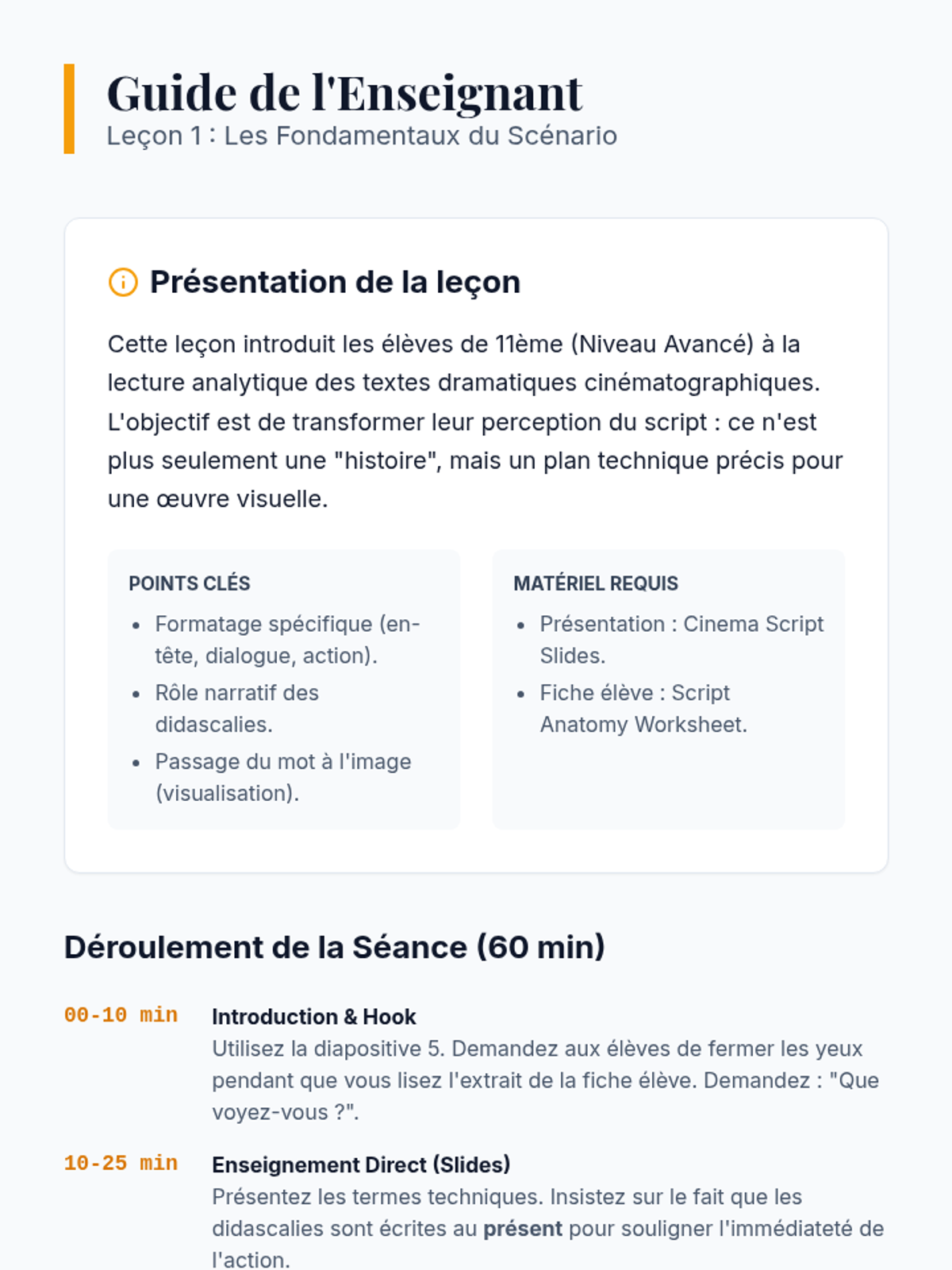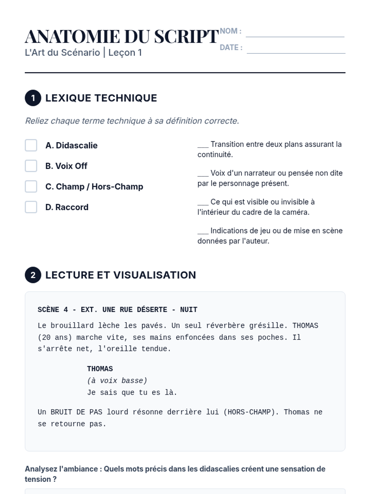 Students master the specific vocabulary and layout of French screenplays, practicing visualization through the study of technical terms like didascalies and voix off.