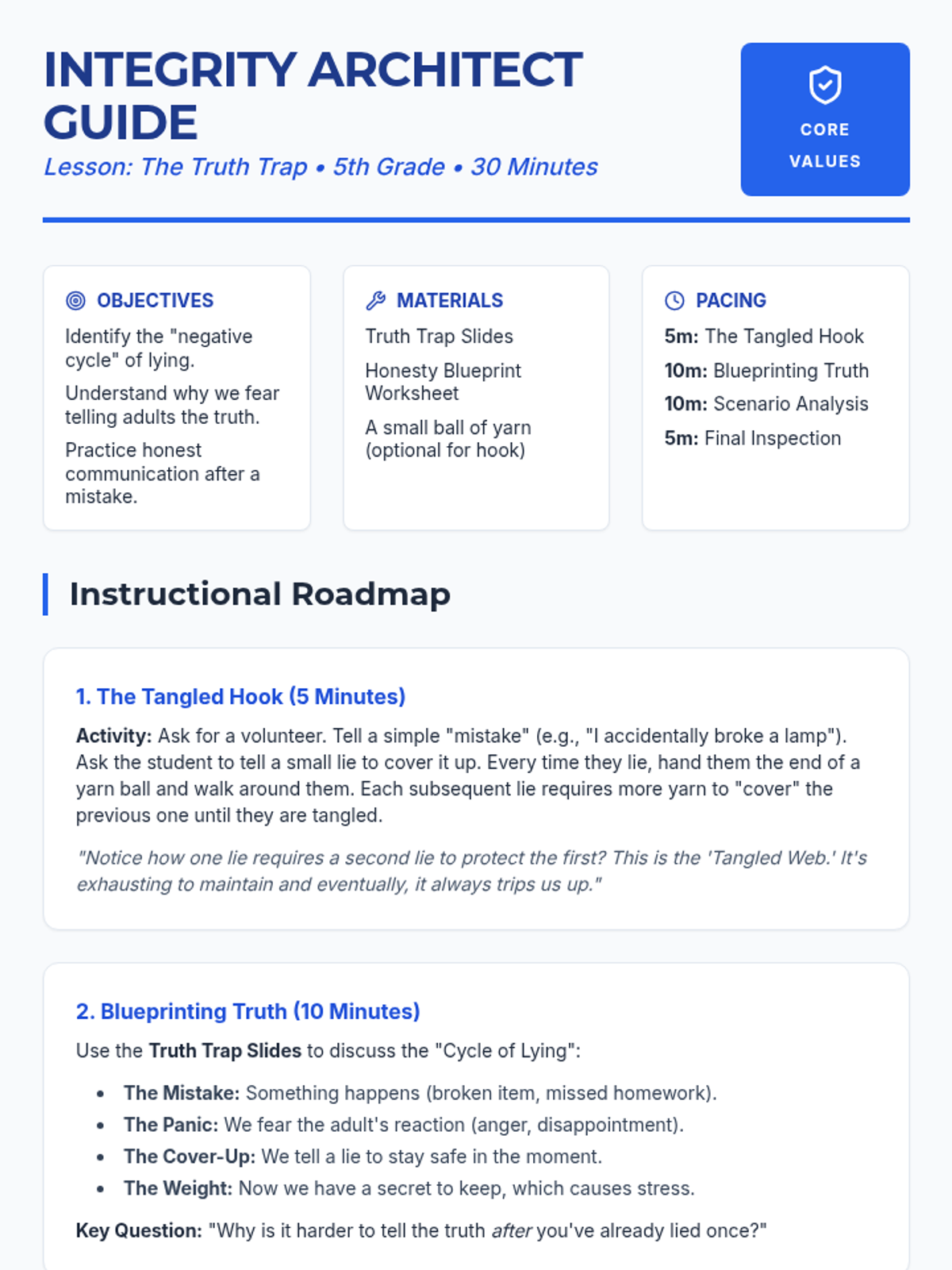 A 30-minute lesson for 5th graders exploring the negative cycle of lying and the importance of honesty with adults after making a mistake. Students will analyze how one lie leads to another and practice 'blueprinting' honest responses to common mistakes.