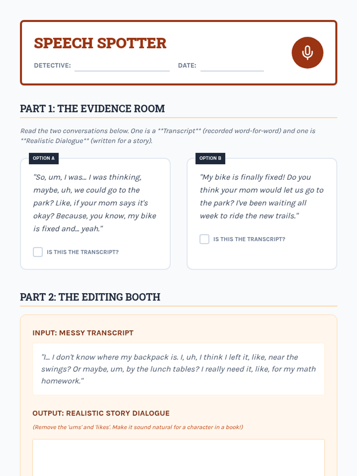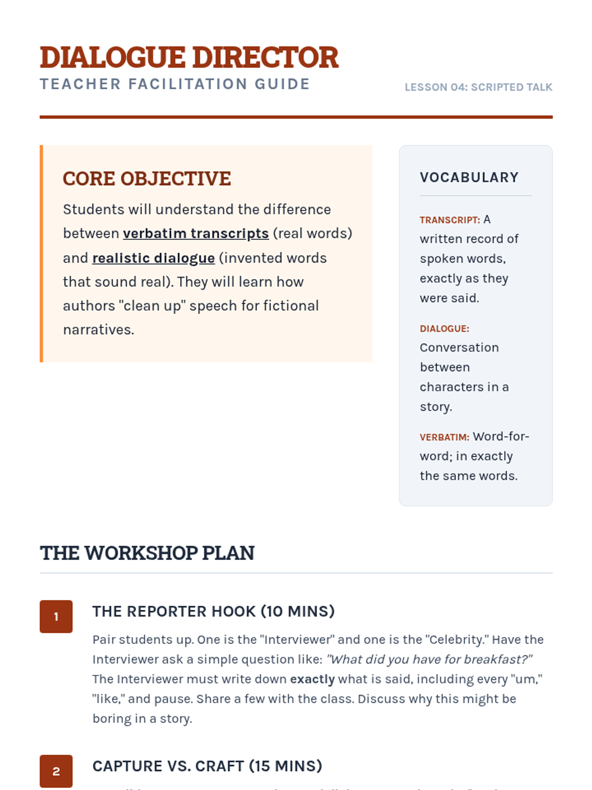 Students distinguish between verbatim transcripts and fictional dialogue, practicing how to record real words vs. invent realistic ones.