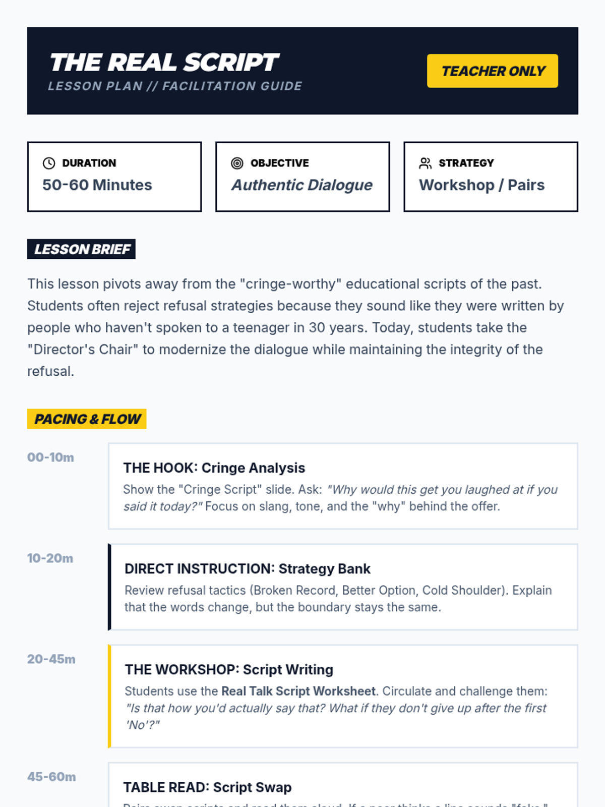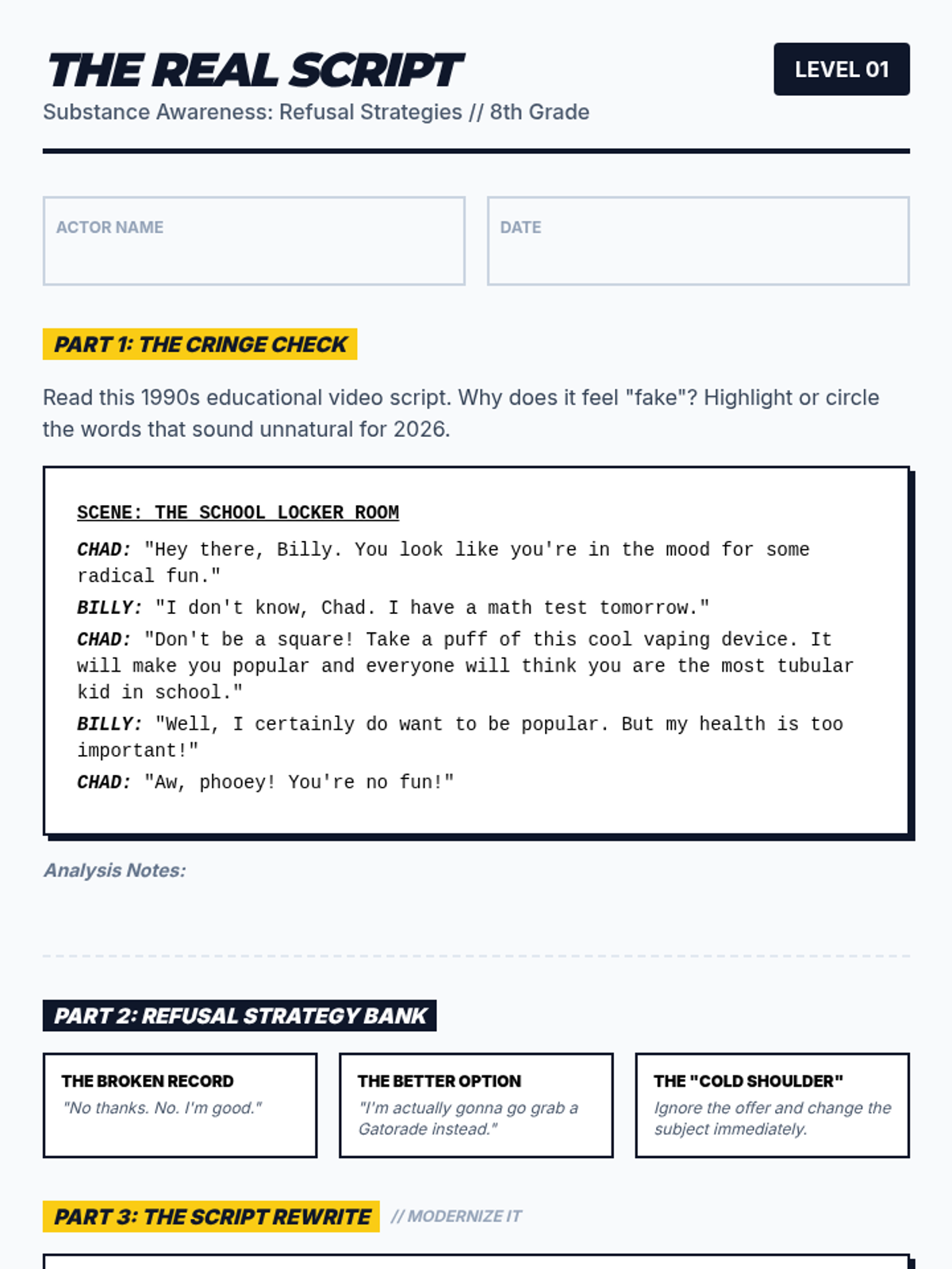 Students transform outdated educational scripts into realistic, modern dialogue for 8th-grade substance offers, focusing on authentic communication.
