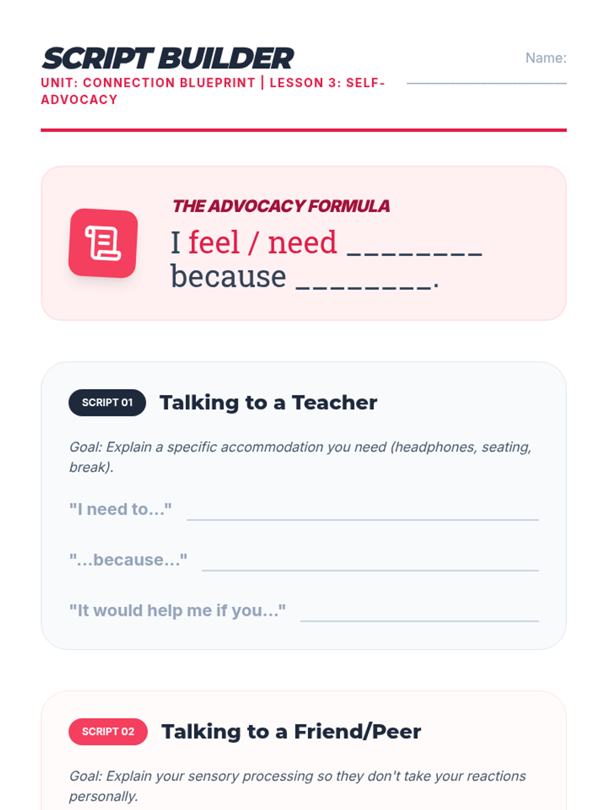 Students practice assertive communication by writing and role-playing scripts that explain their sensory needs and accommodation rights to teachers and peers during calm moments.