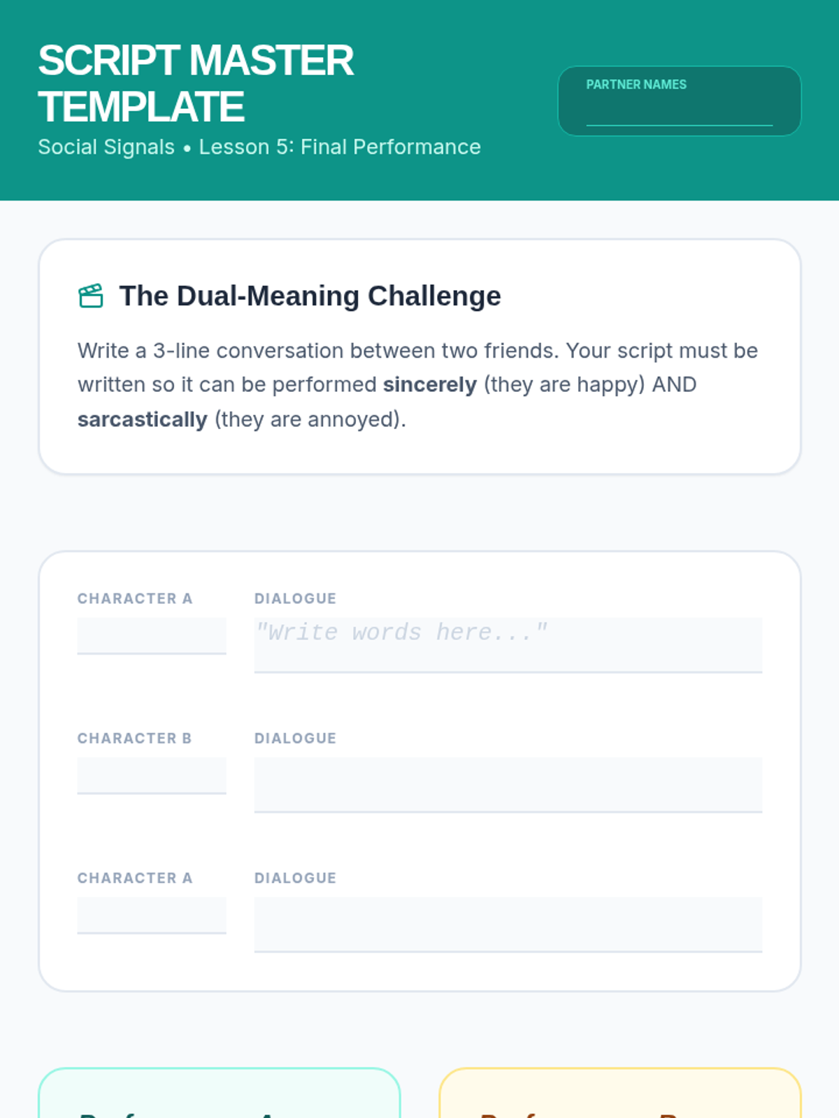 Students write and perform dual-meaning scripts, demonstrating their ability to manipulate intonation to shift a scene from sincere to sarcastic.