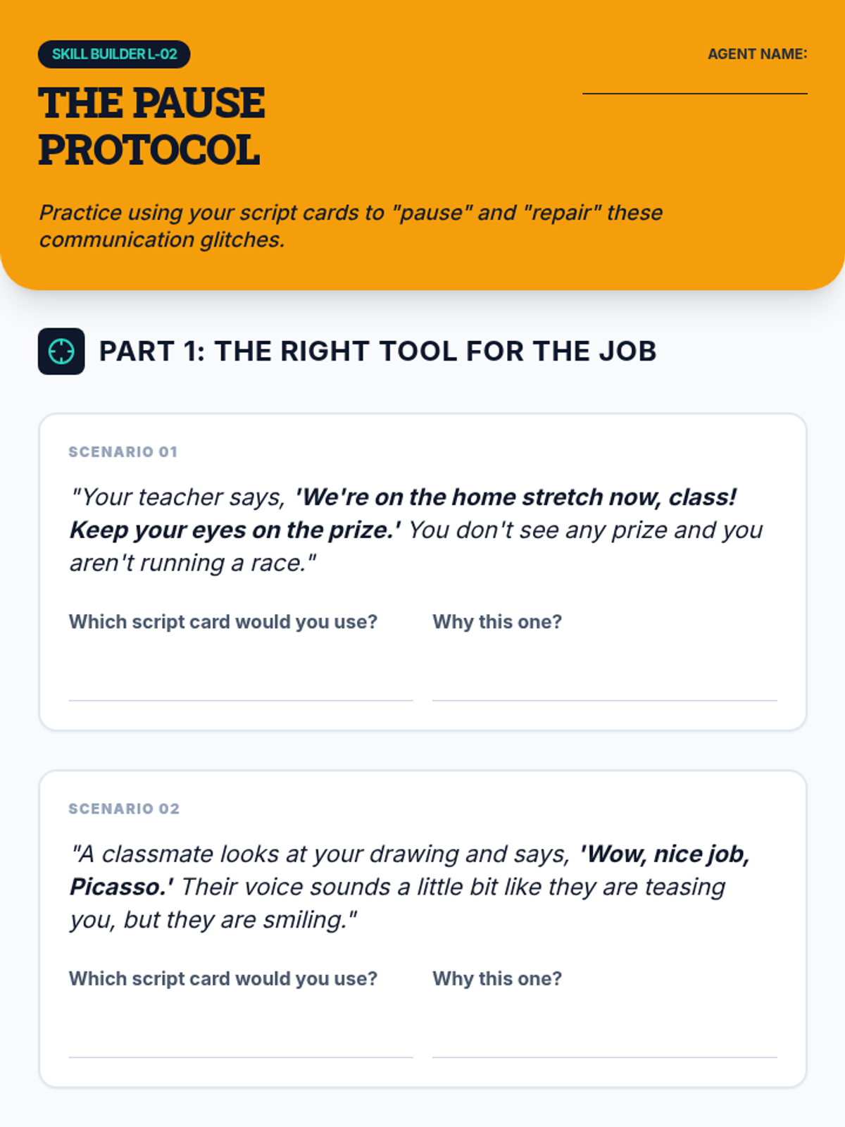 A 20-minute individual session designed for a student with ASD to distinguish between shareable social information and private safety information using simple visual filters.