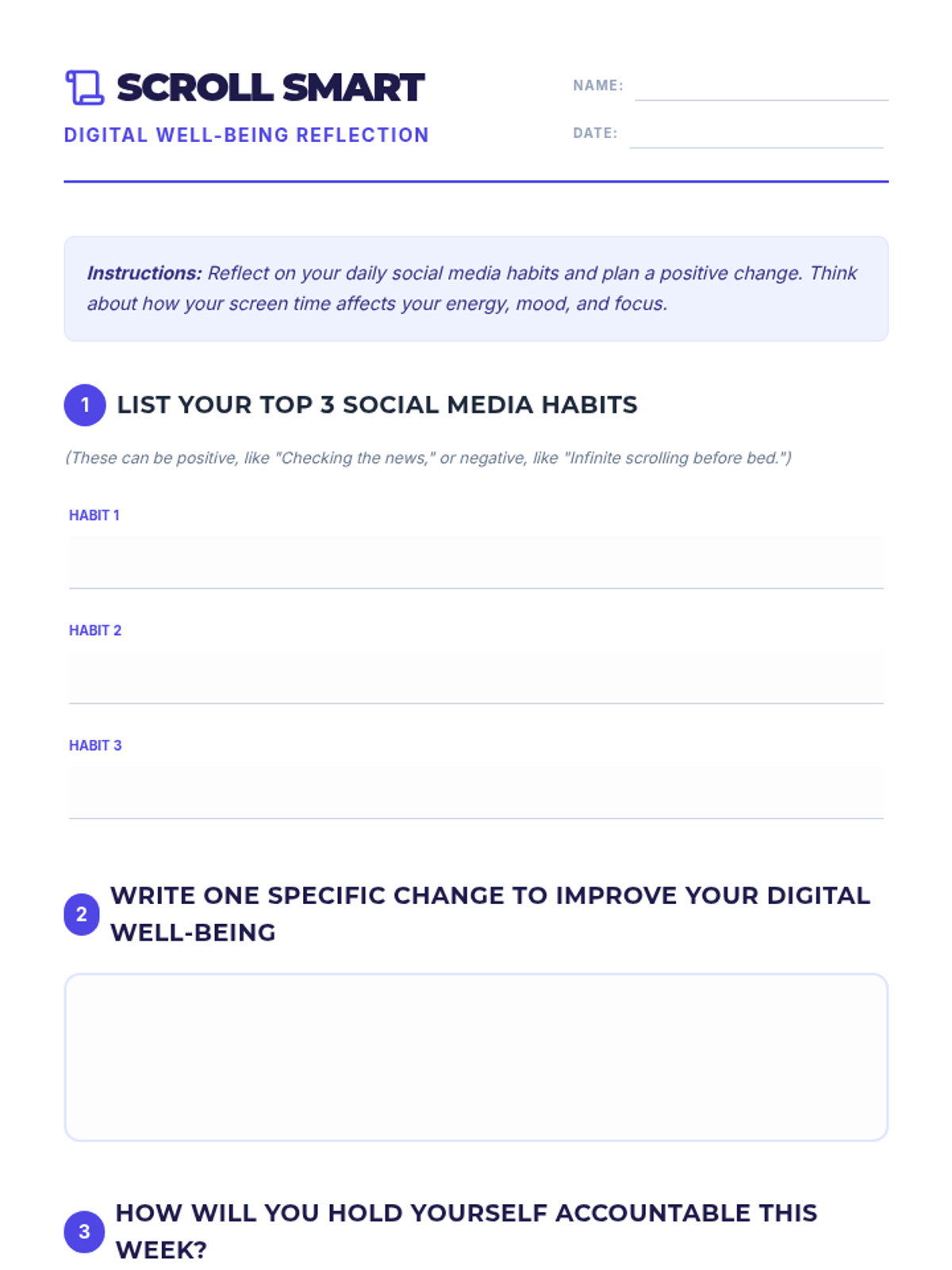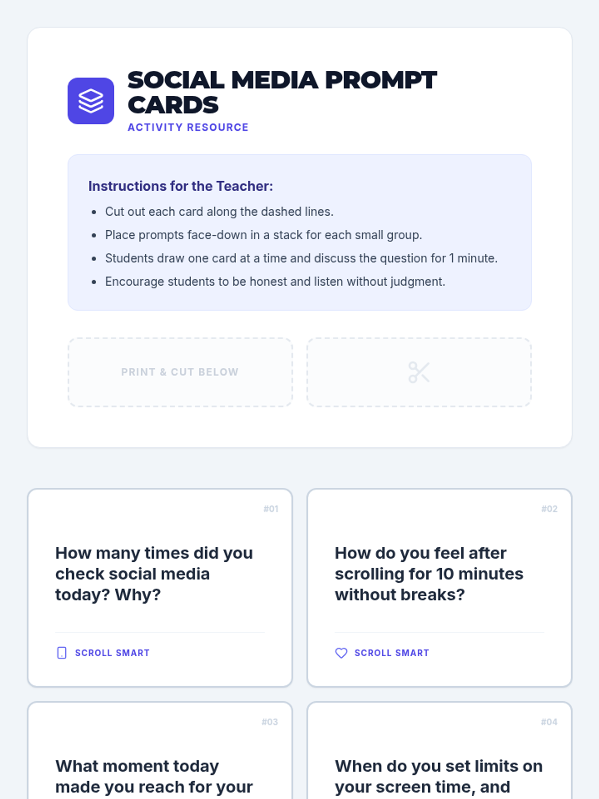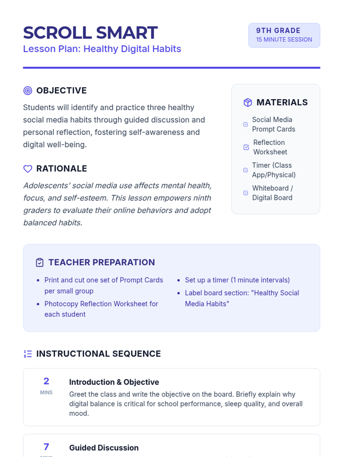 A 15-minute interactive lesson for ninth graders to critically assess their social media behaviors and develop healthier digital habits.