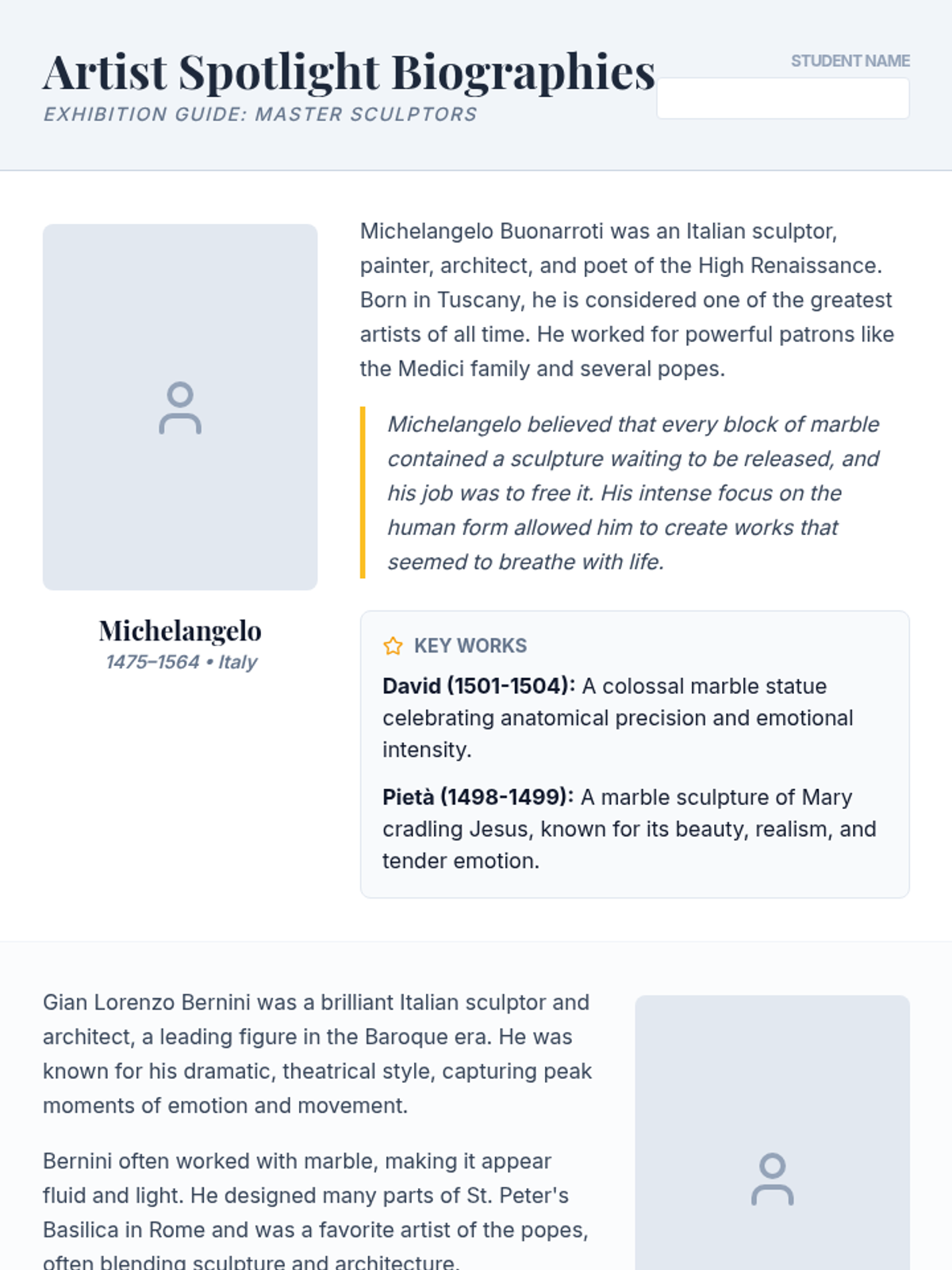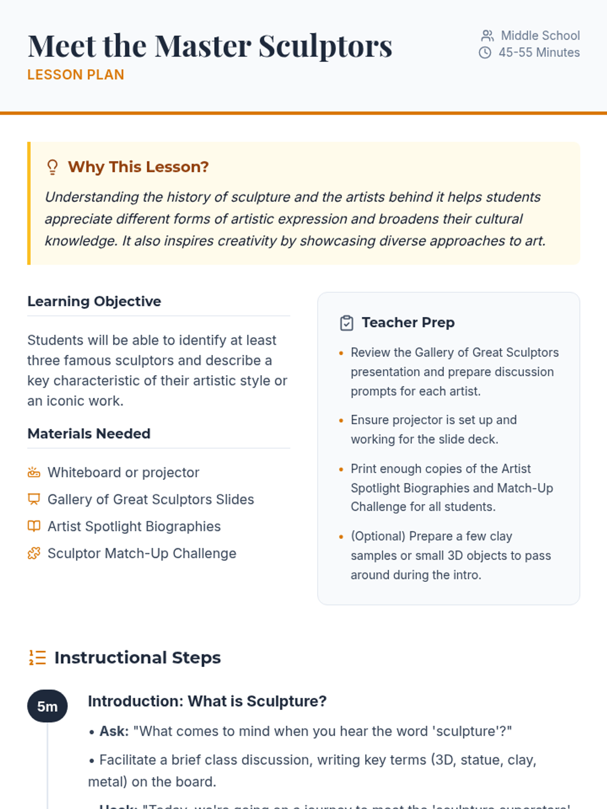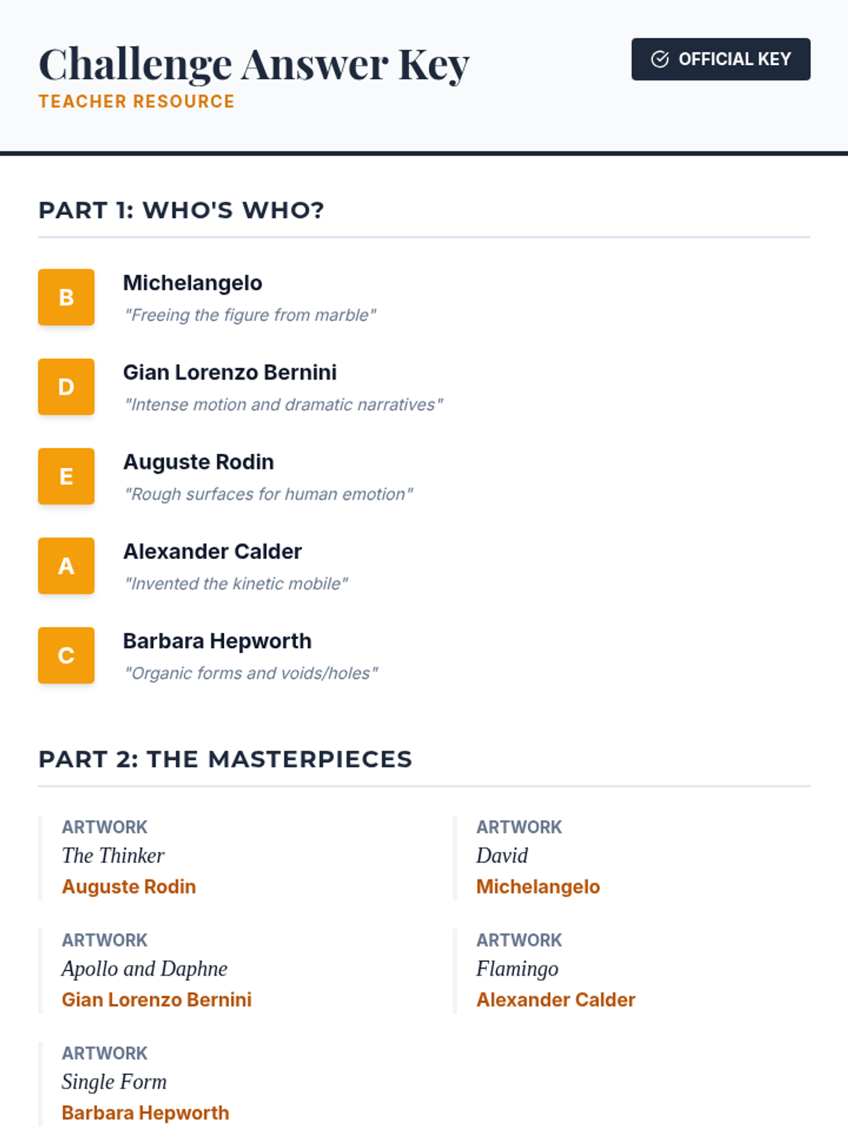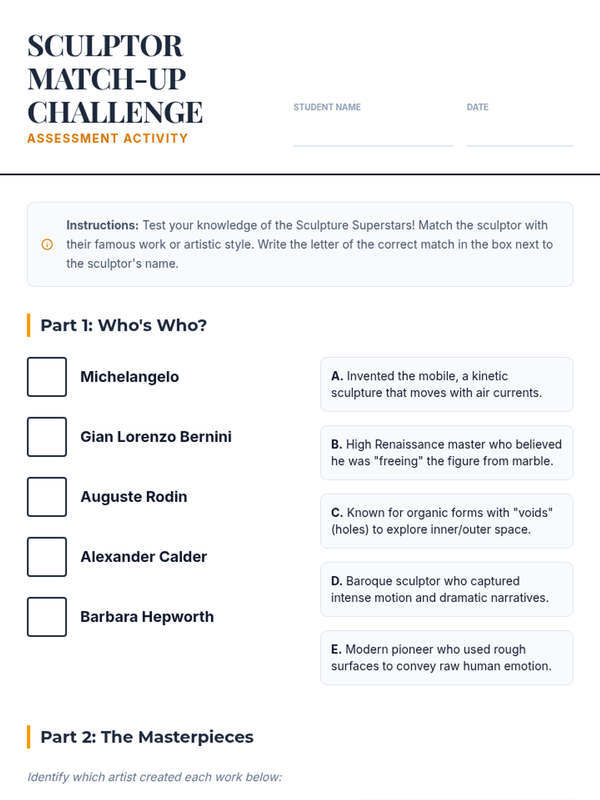 Students explore the lives and works of five iconic sculptors—Michelangelo, Bernini, Rodin, Calder, and Hepworth—through a gallery-style presentation, biographical readings, and a matching challenge.