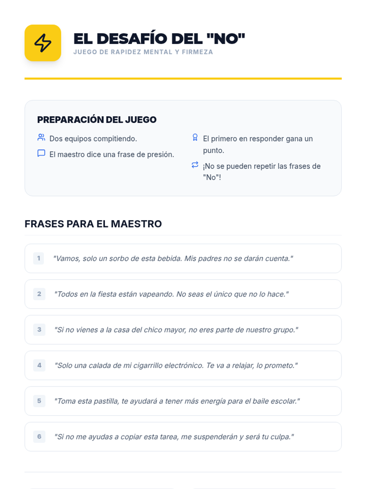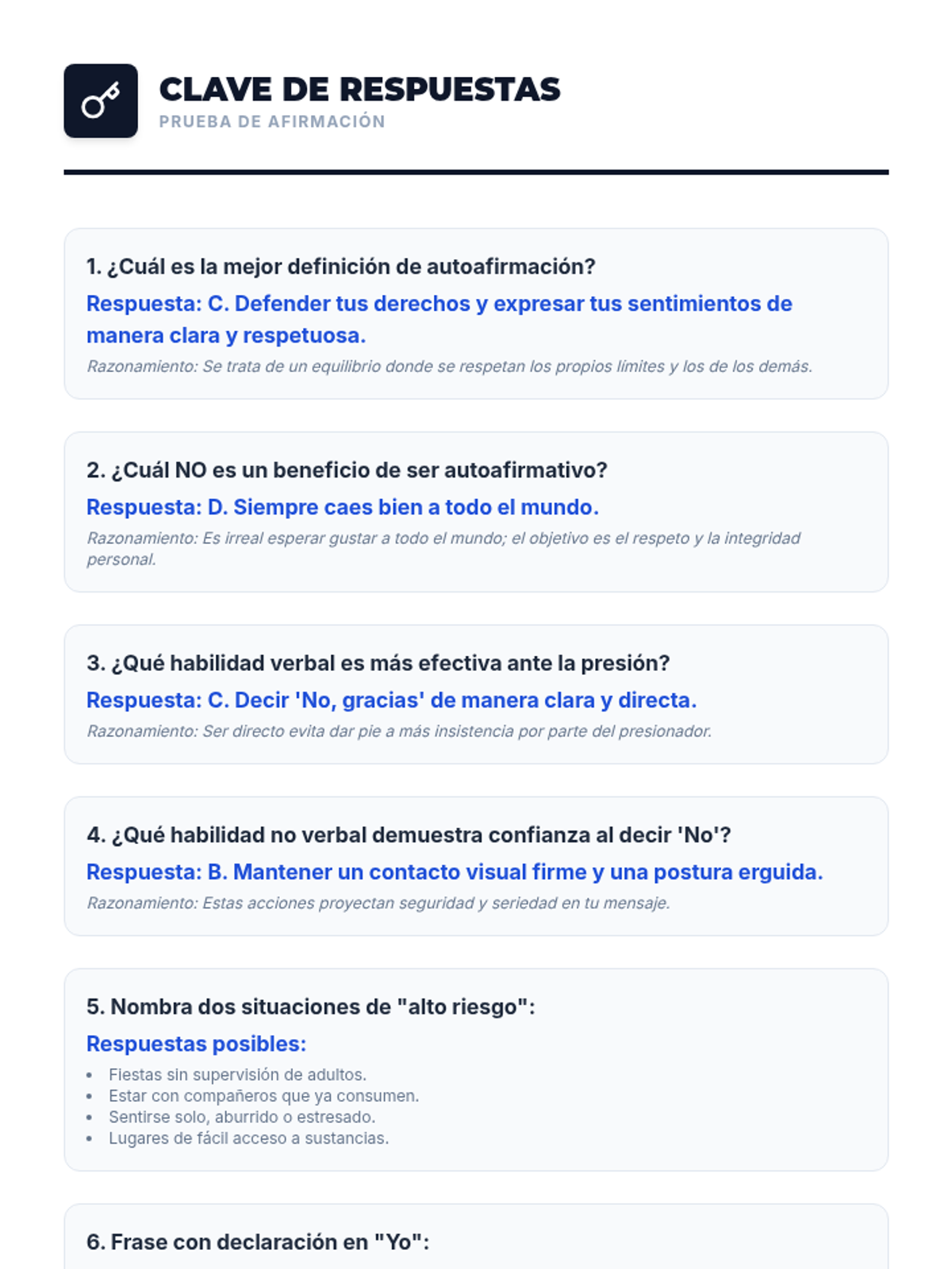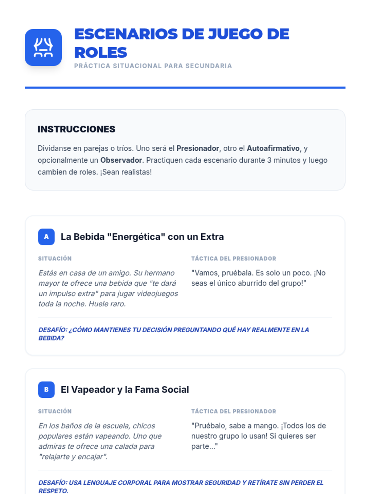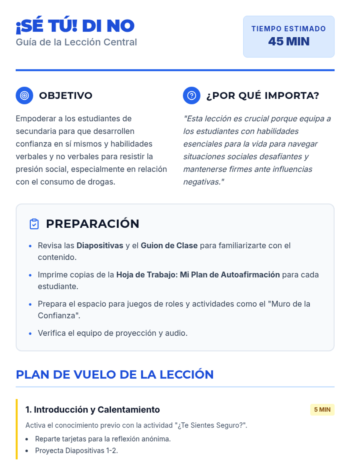 Esta lección empodera a estudiantes de 6º y 7º grado con habilidades de autoafirmación para resistir la presión social y el consumo de drogas. Incluye actividades interactivas, juegos de roles y recursos para eventos feriales.