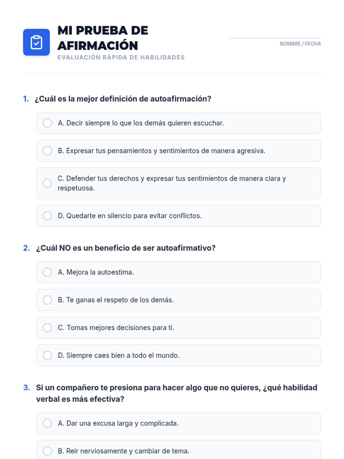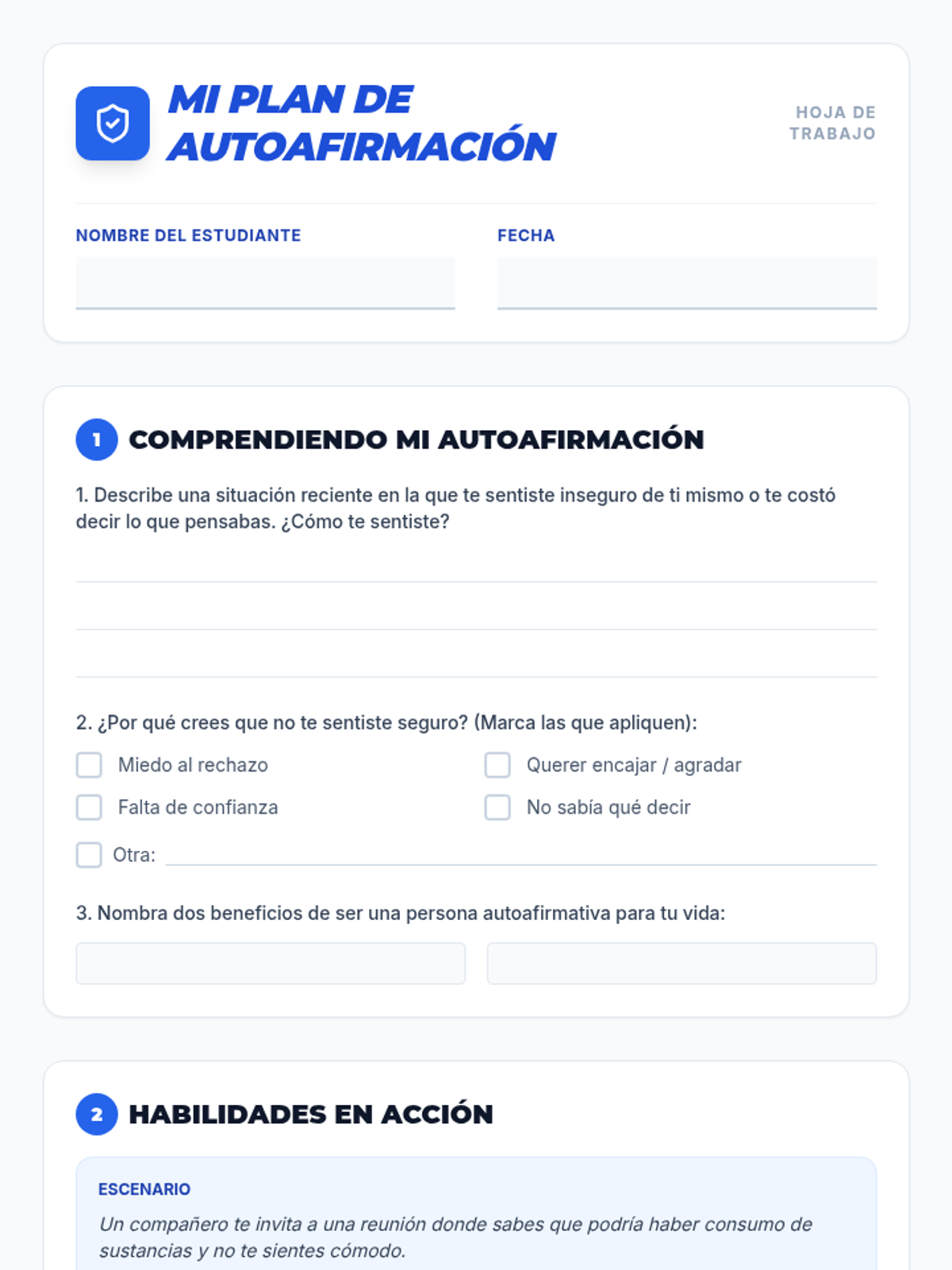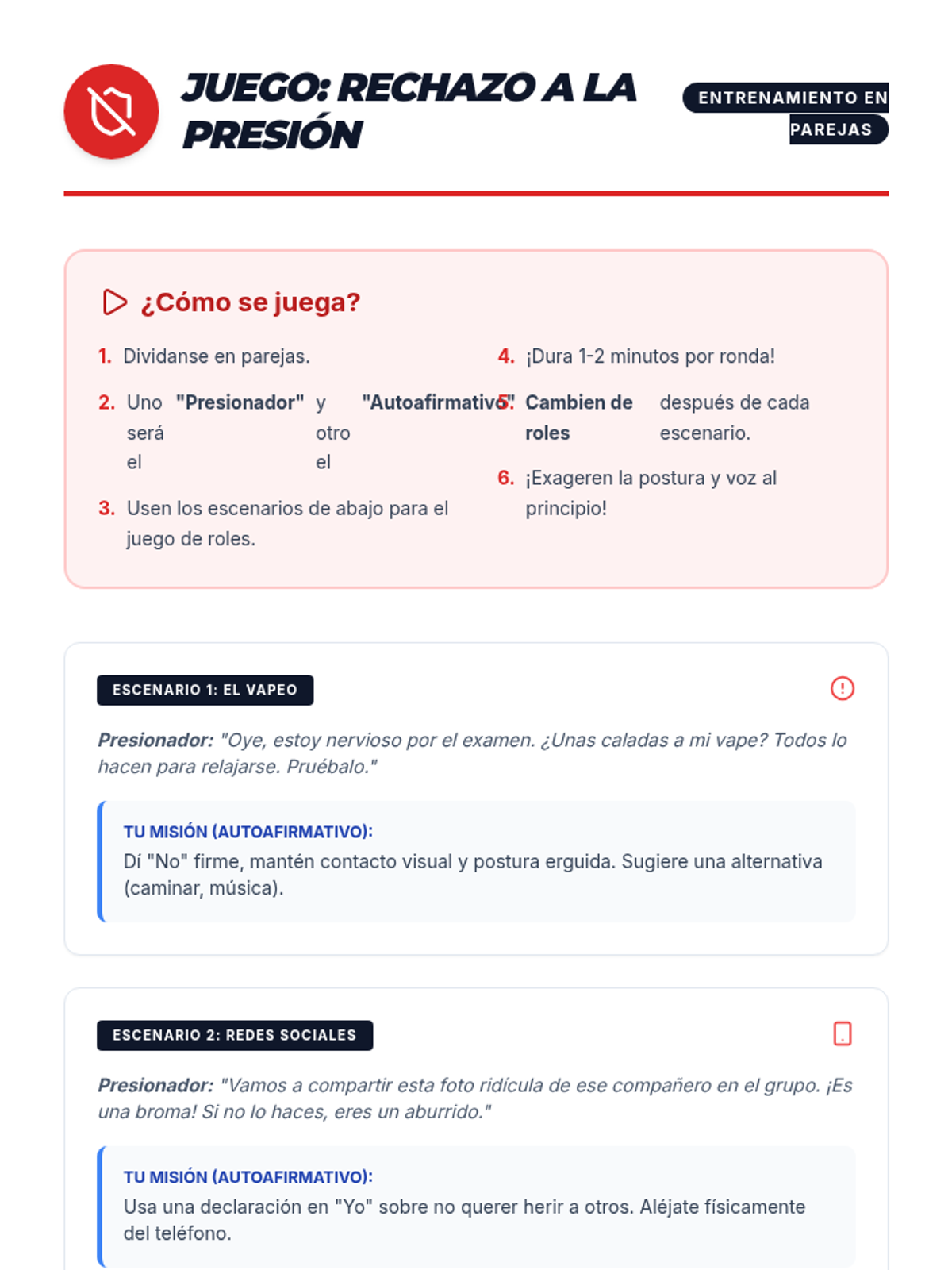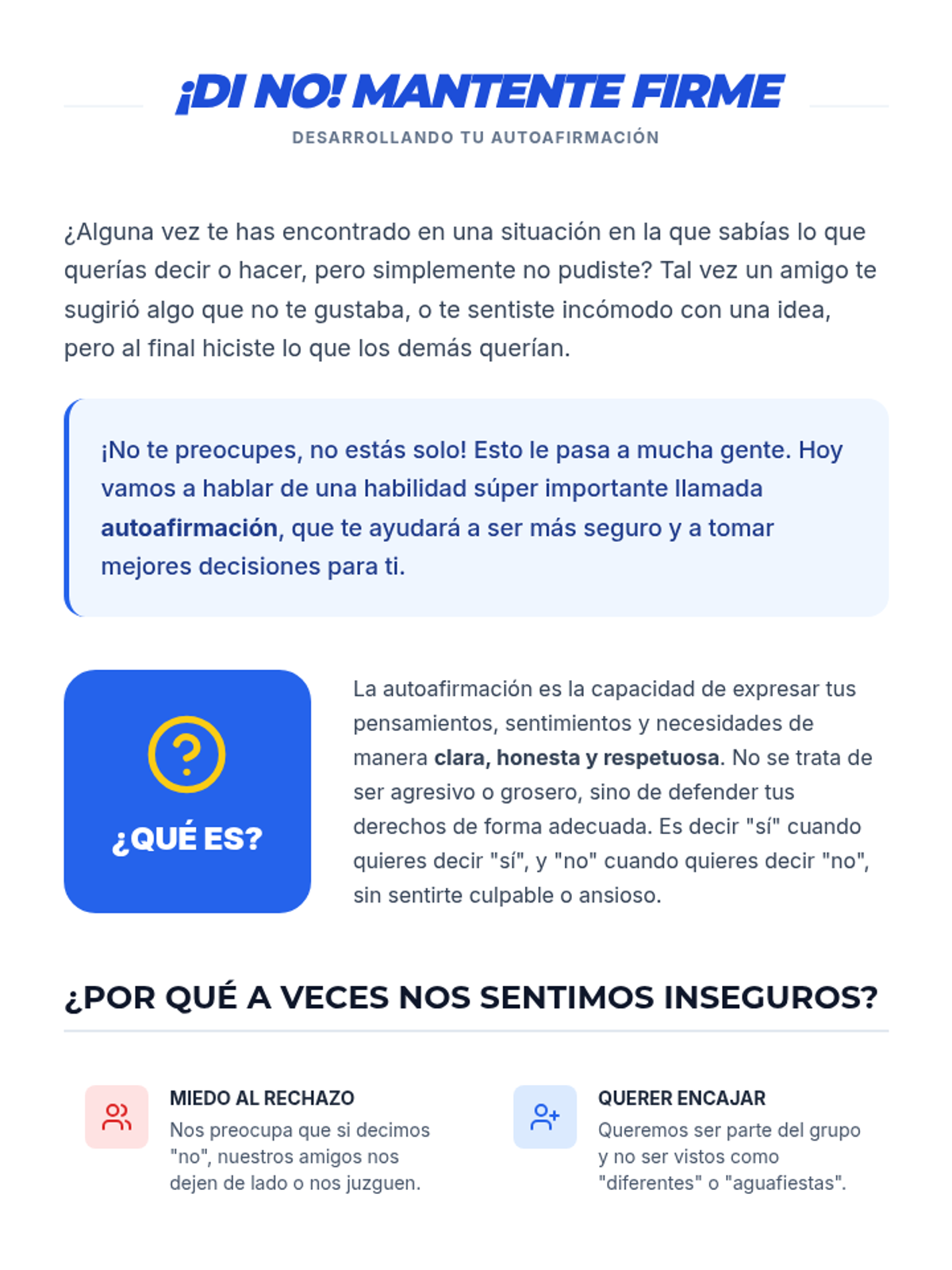 Esta lección empodera a estudiantes de 6º y 7º grado con habilidades de autoafirmación para resistir la presión social y el consumo de drogas. Incluye actividades interactivas, juegos de roles y recursos para eventos feriales.