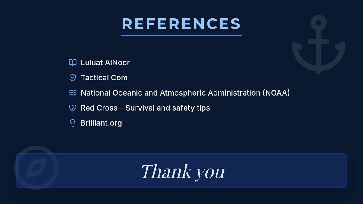 A concise presentation focusing on survival resources and references for maritime safety.