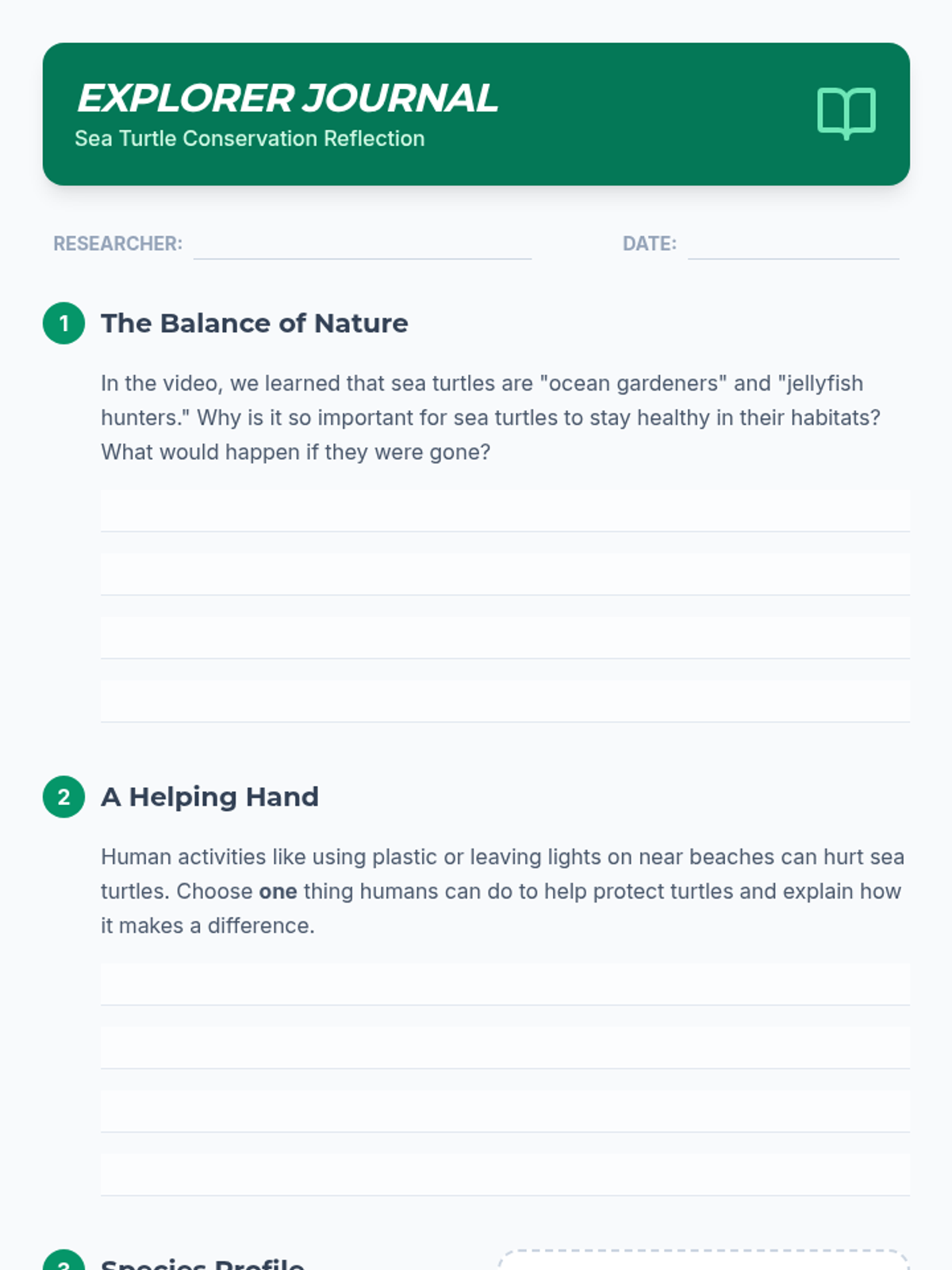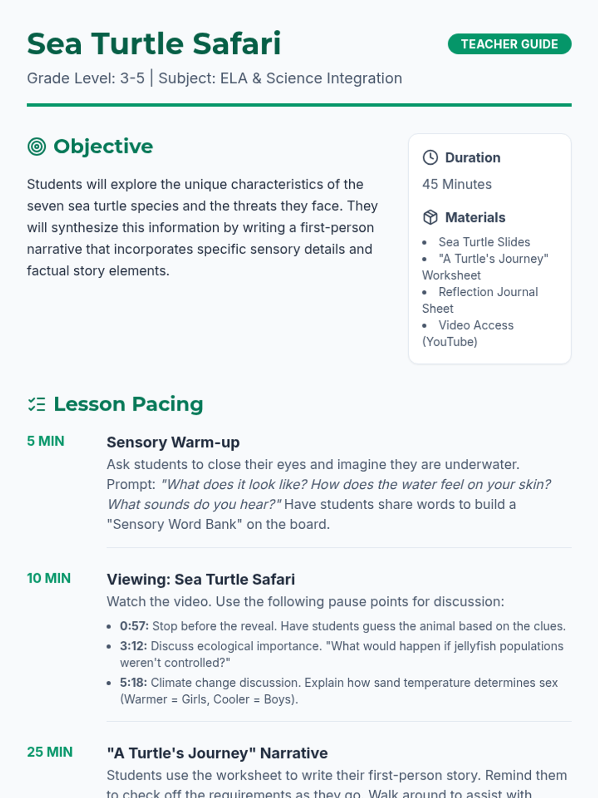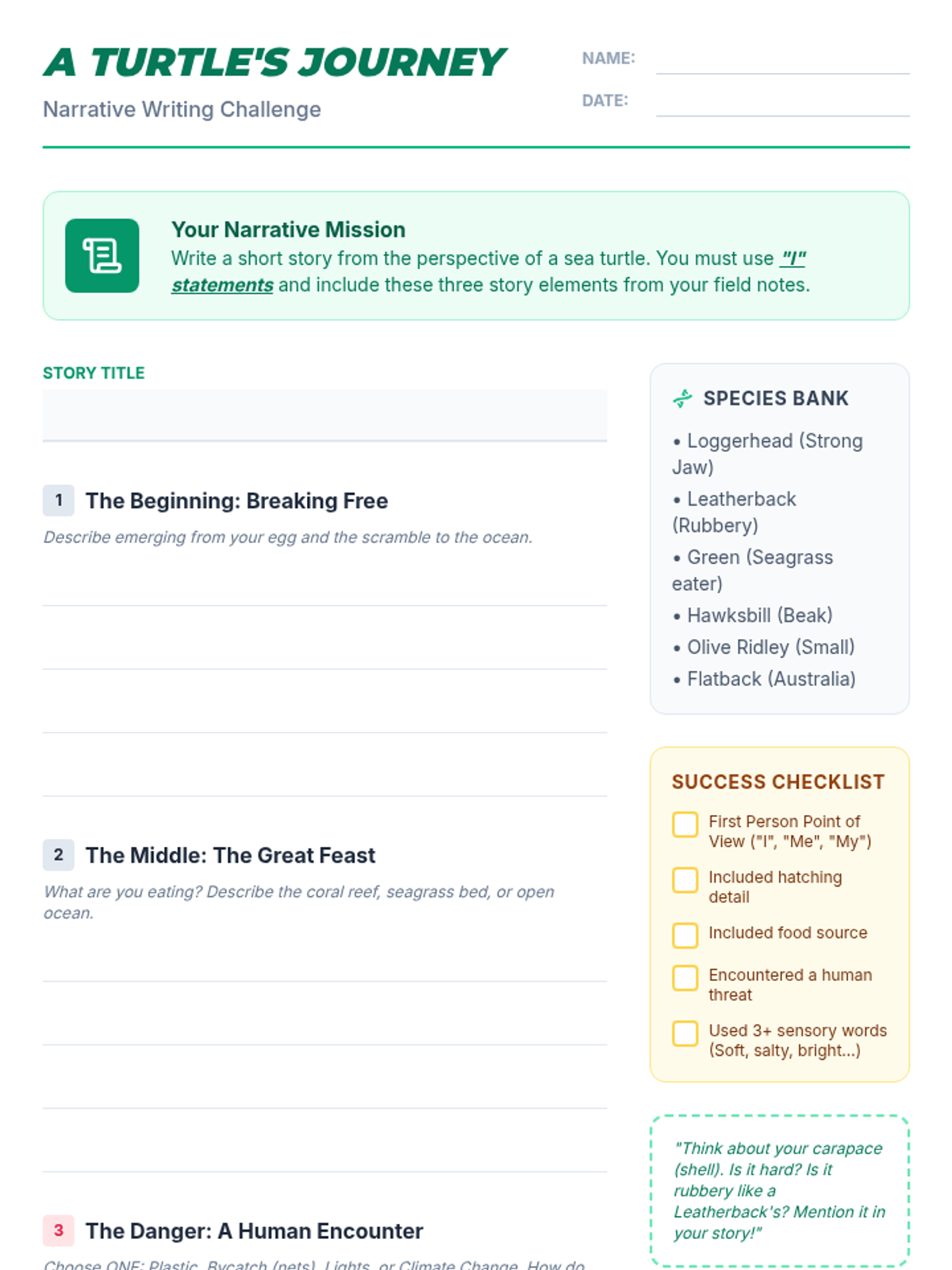 Students will dive into the world of marine reptiles, learning about the seven species of sea turtles and their ecological roles before writing a first-person narrative from the perspective of a turtle facing real-world challenges.