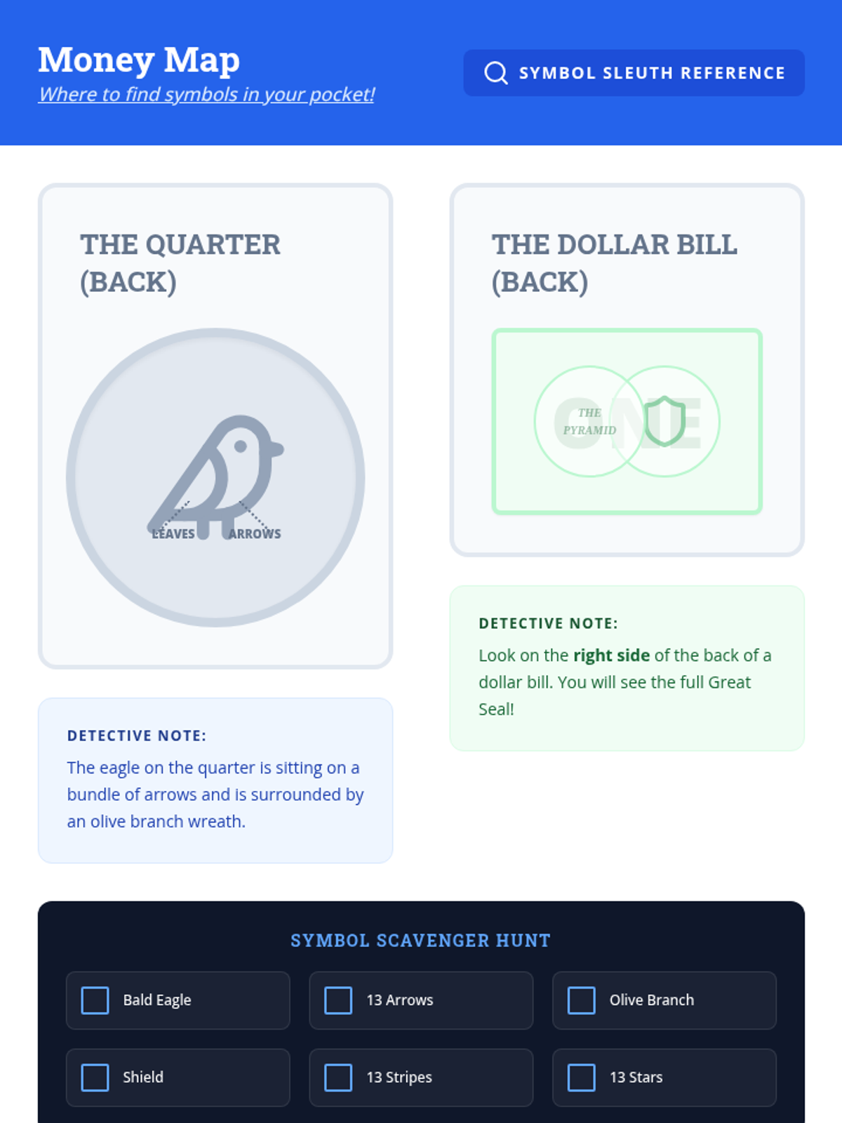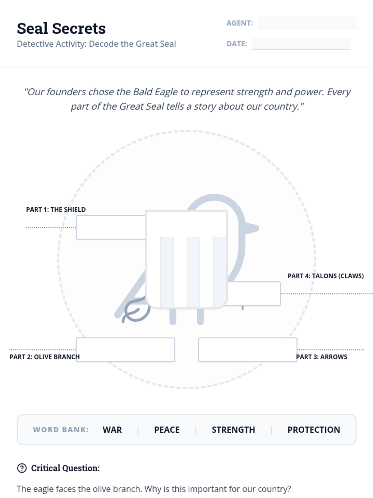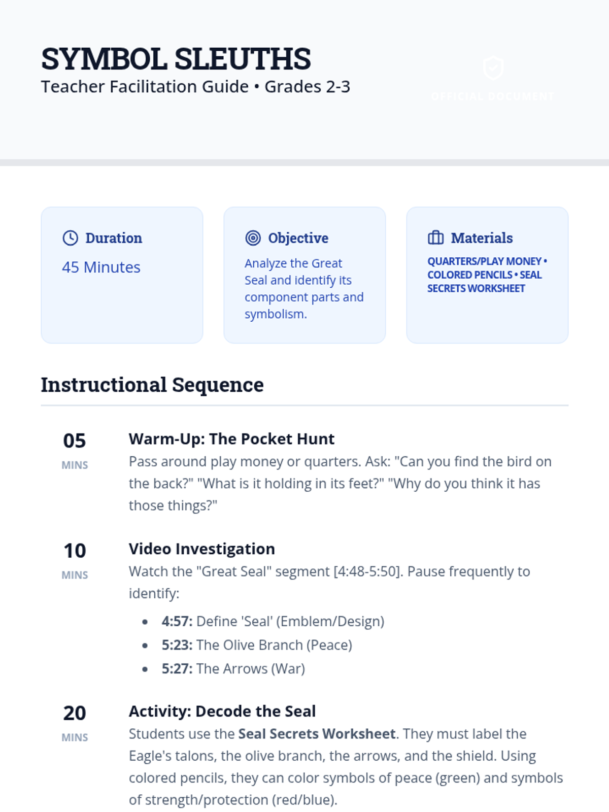 Students will investigate the Great Seal of the United States, uncovering the hidden meanings behind the bald eagle, olive branch, arrows, and shield through video analysis and a hands-on 'decoding' activity.