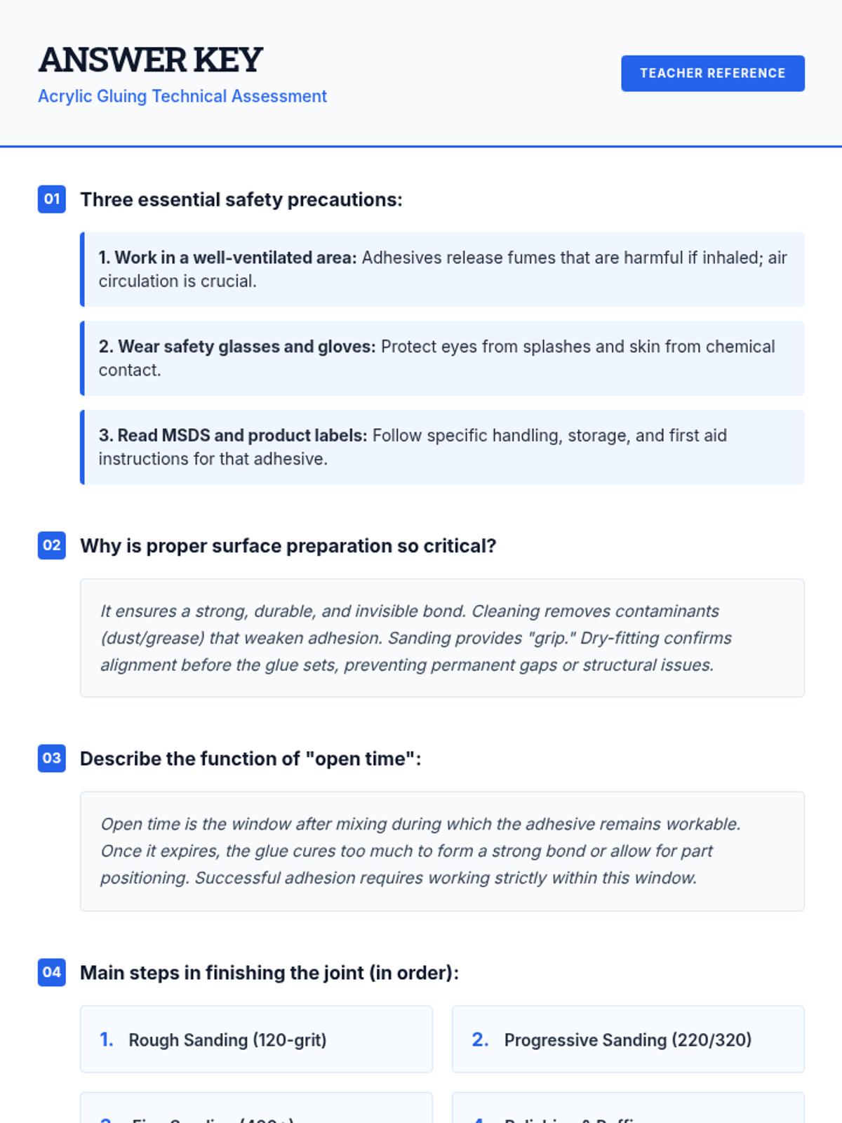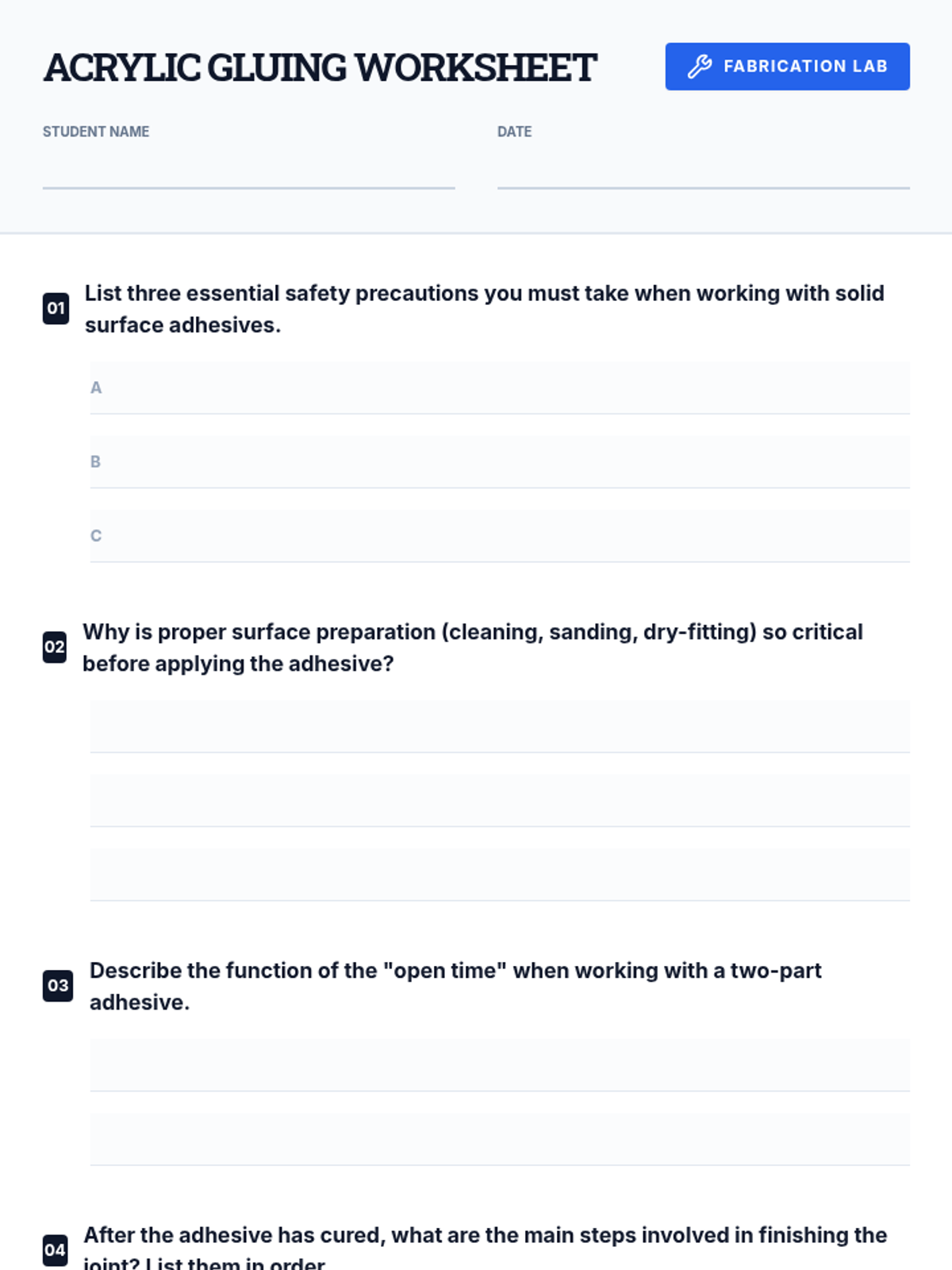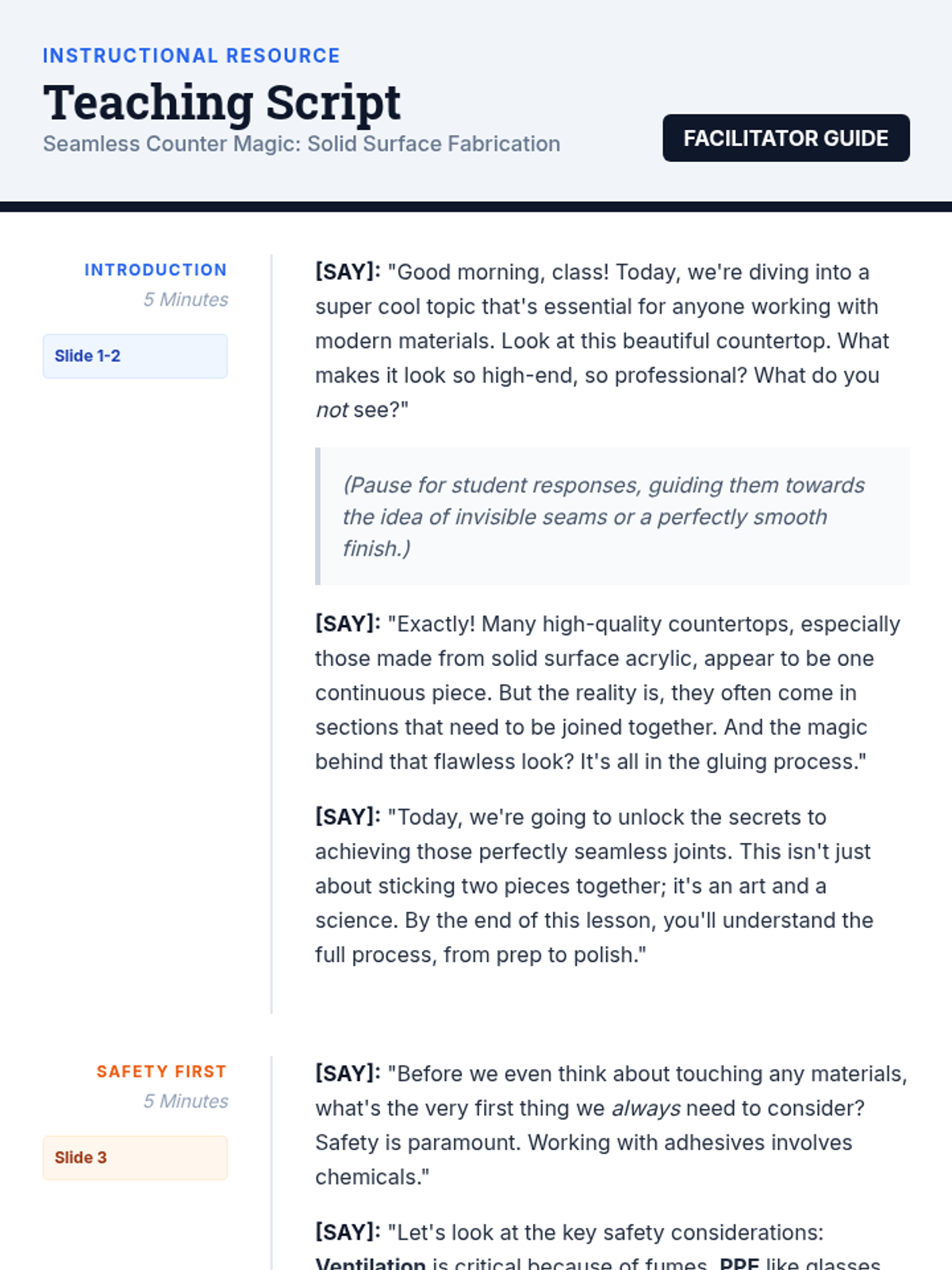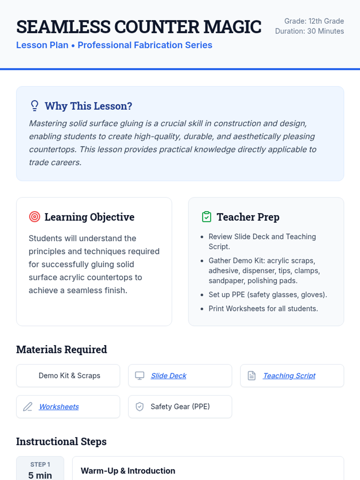 This 30-minute lesson guides 12th-grade students through the critical process of gluing solid surface acrylic countertops, focusing on achieving invisible seams and ensuring safety. Students will learn essential techniques for creating professional-grade finishes in fabrication.
