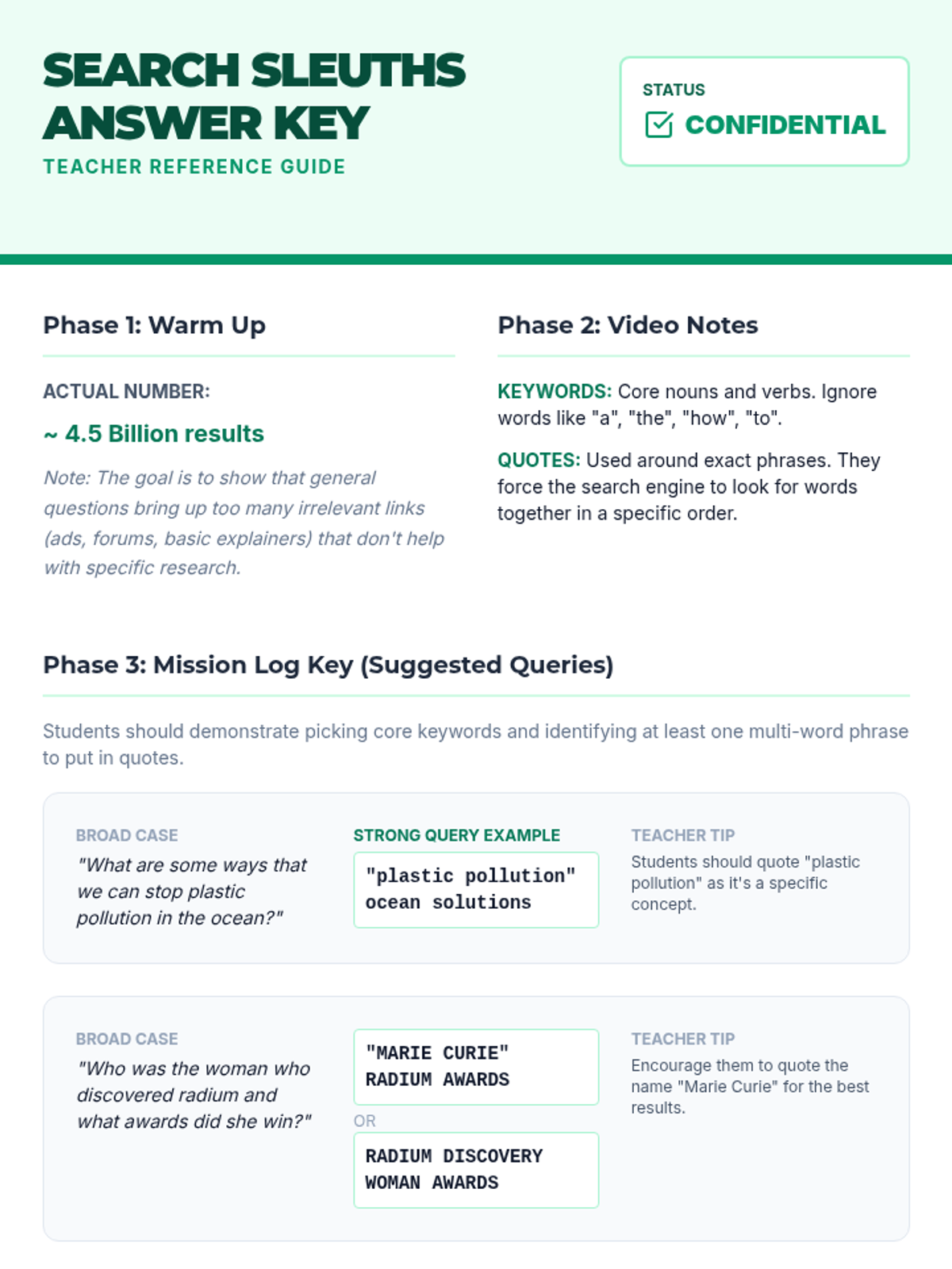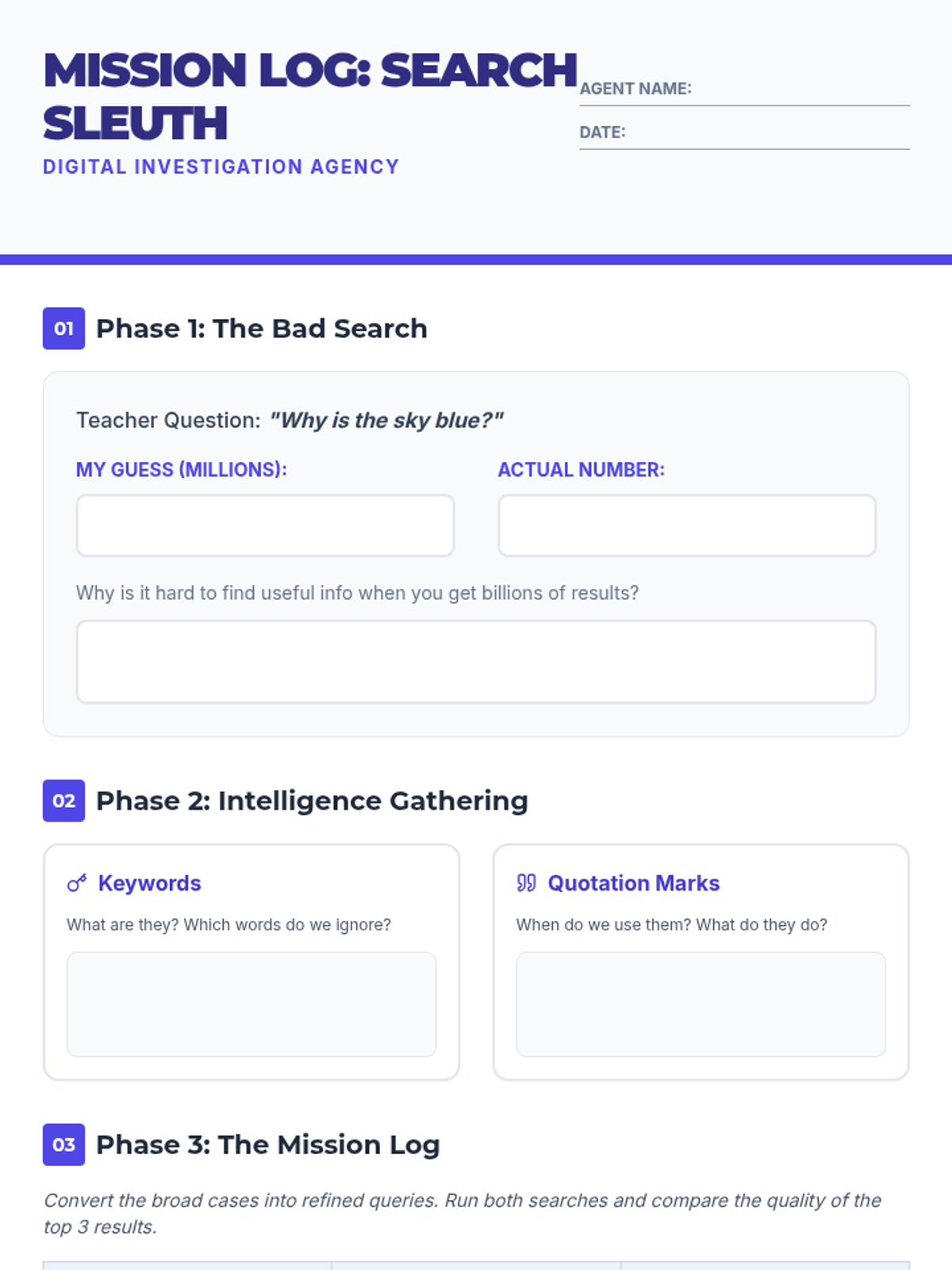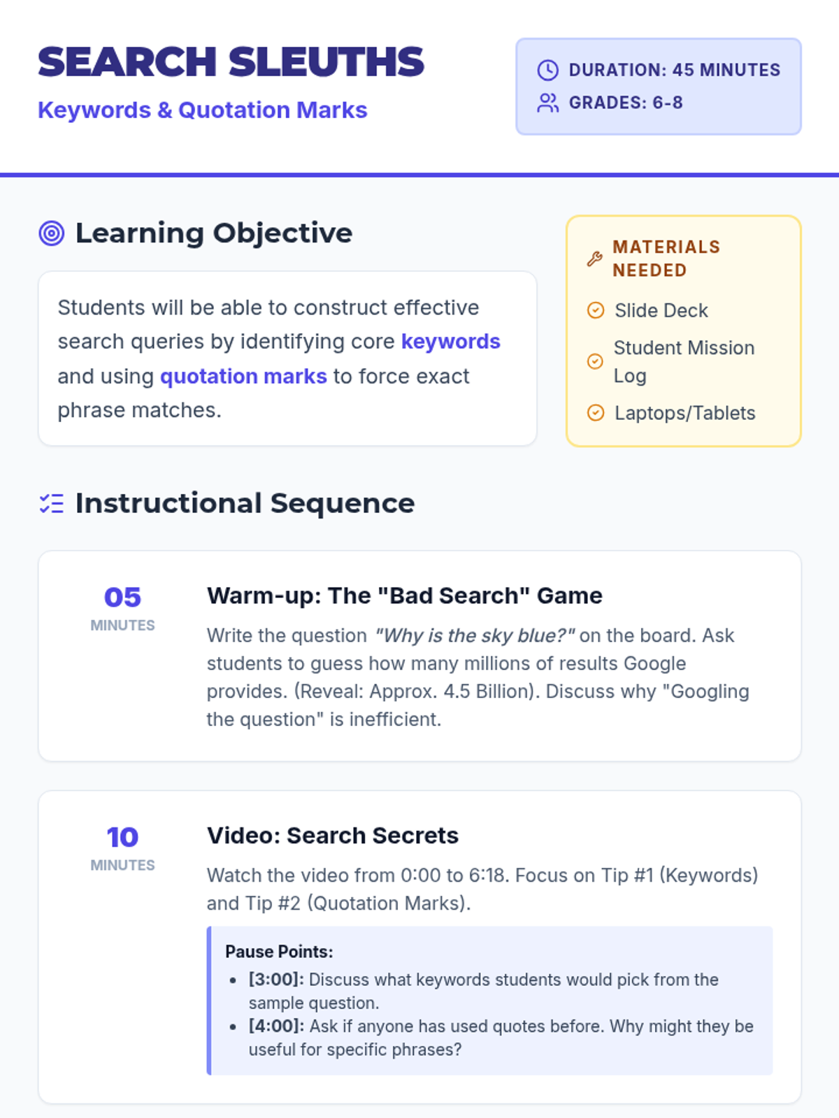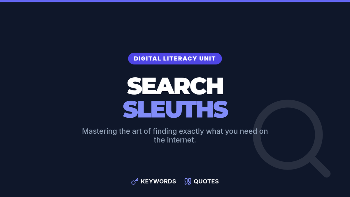 A hands-on lesson teaching middle schoolers how to move beyond basic questions to expert search queries using keywords and quotation marks. Students practice 'detective' skills to filter through the noise of the internet.