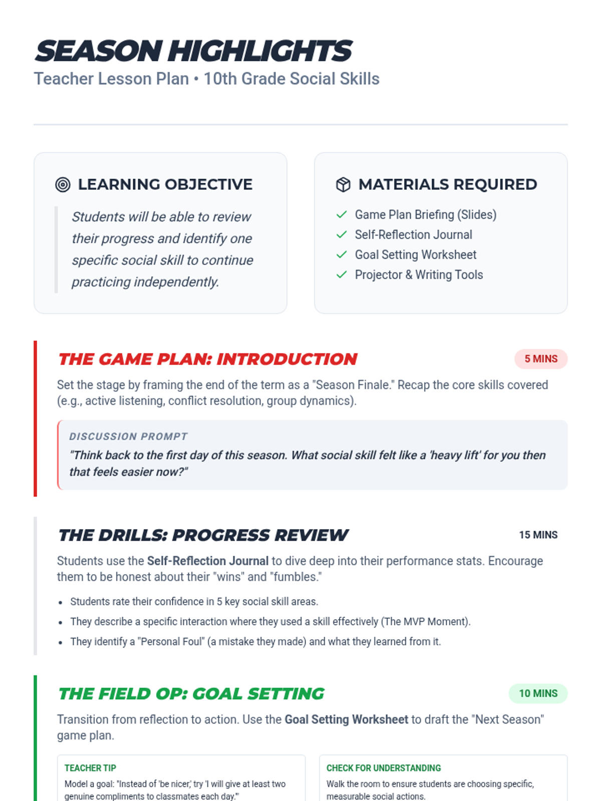 A 35-minute session for 10th graders to review their social skills progress over the 'season' and set concrete goals for independent growth. Using a sports-themed 'Season Highlights' motif, students reflect on successes and draft a game plan for the future.