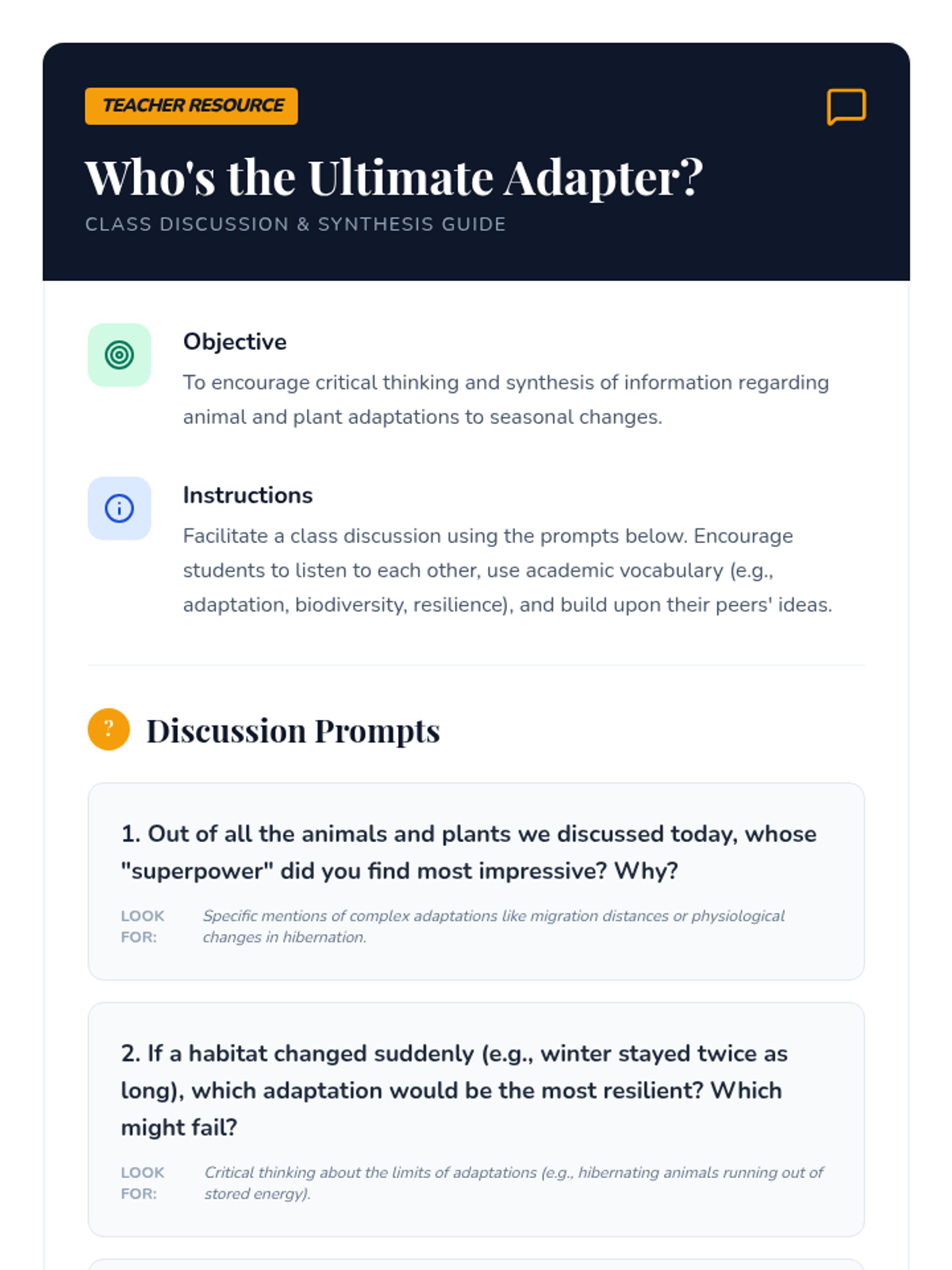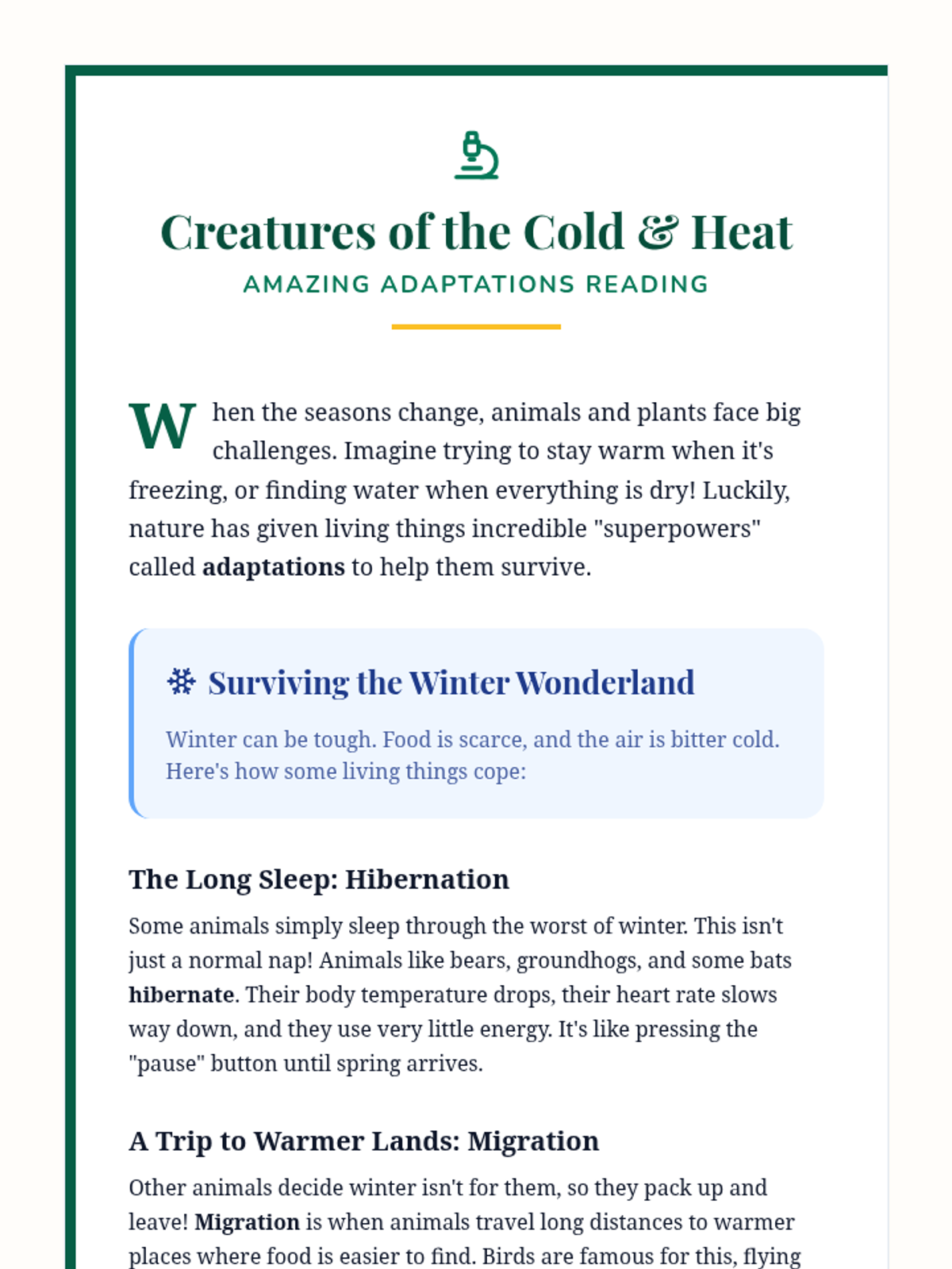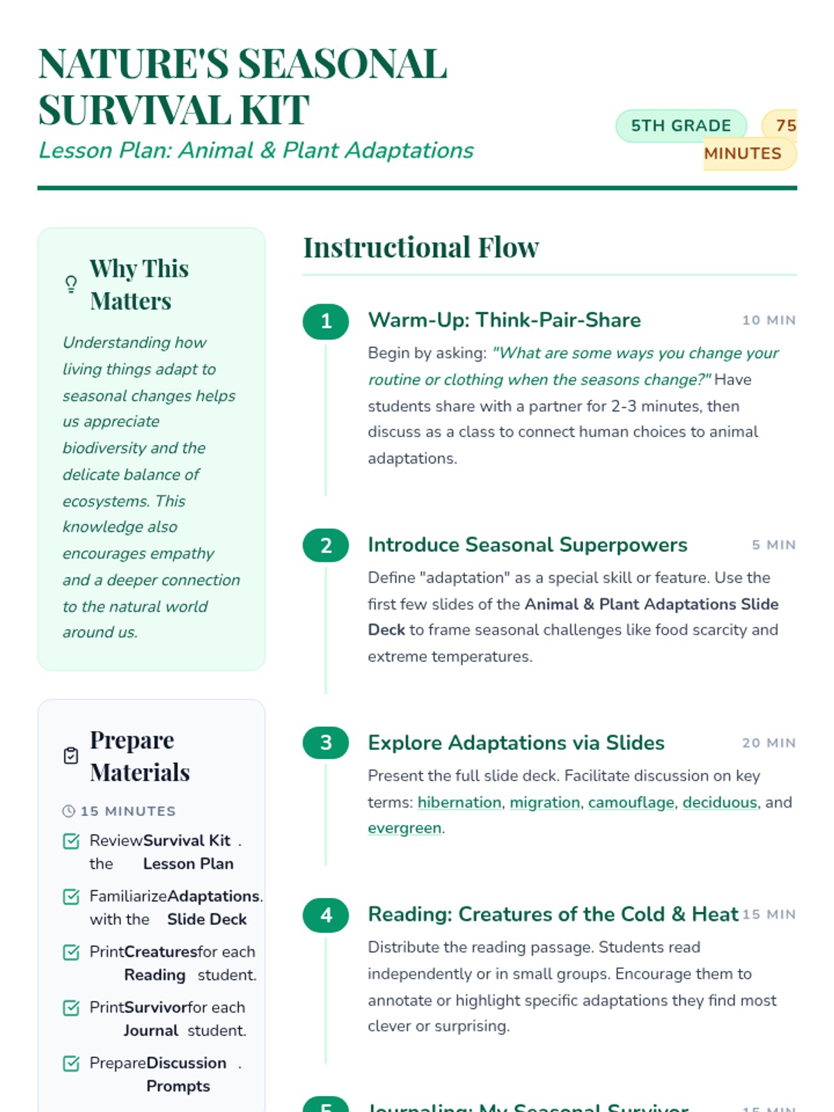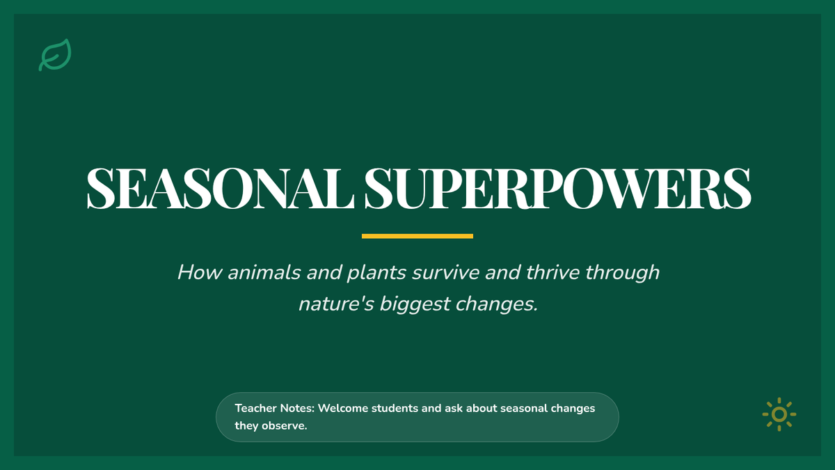 Explore the incredible adaptations animals and plants use to survive seasonal changes in this engaging 5th-grade science lesson. Students will discover 'seasonal superpowers' like hibernation, migration, and camouflage through slides, reading, and creative journaling.