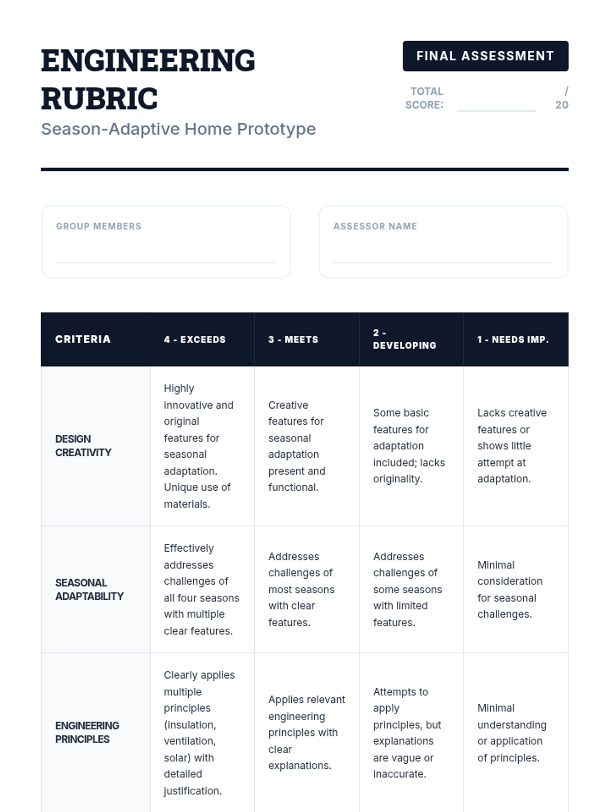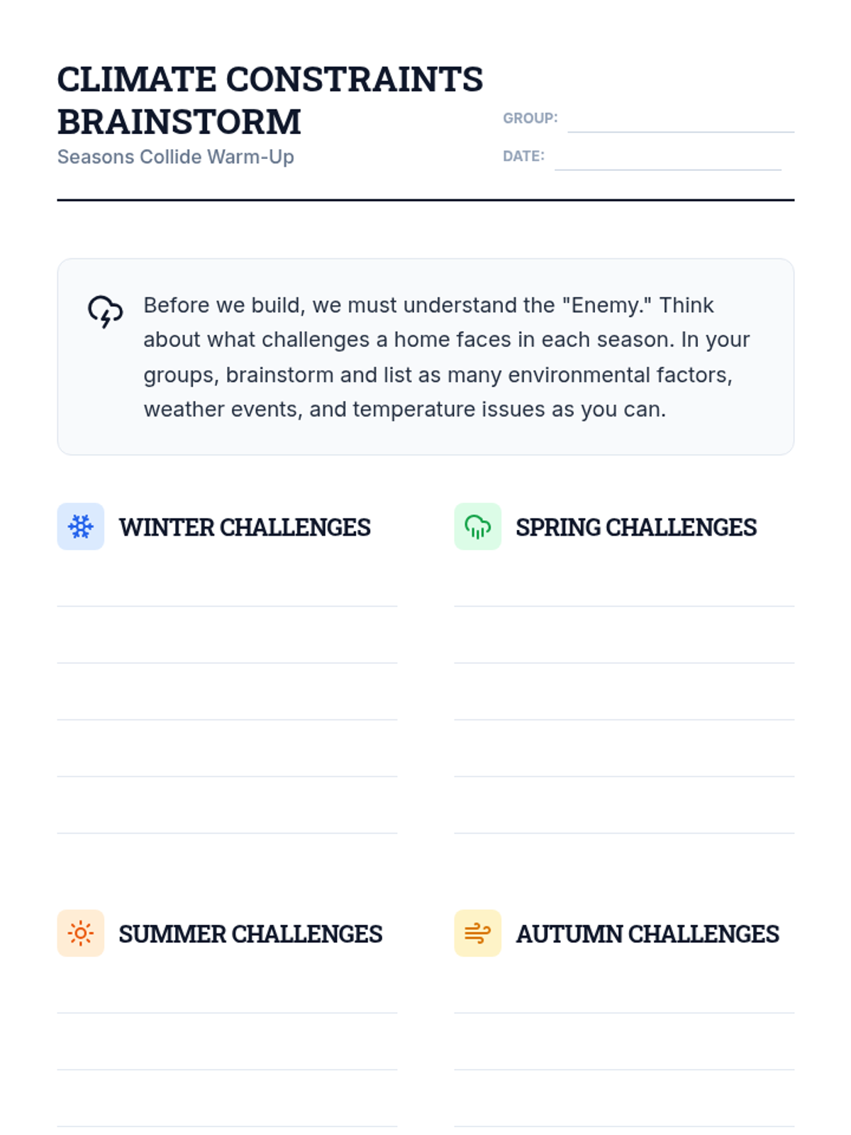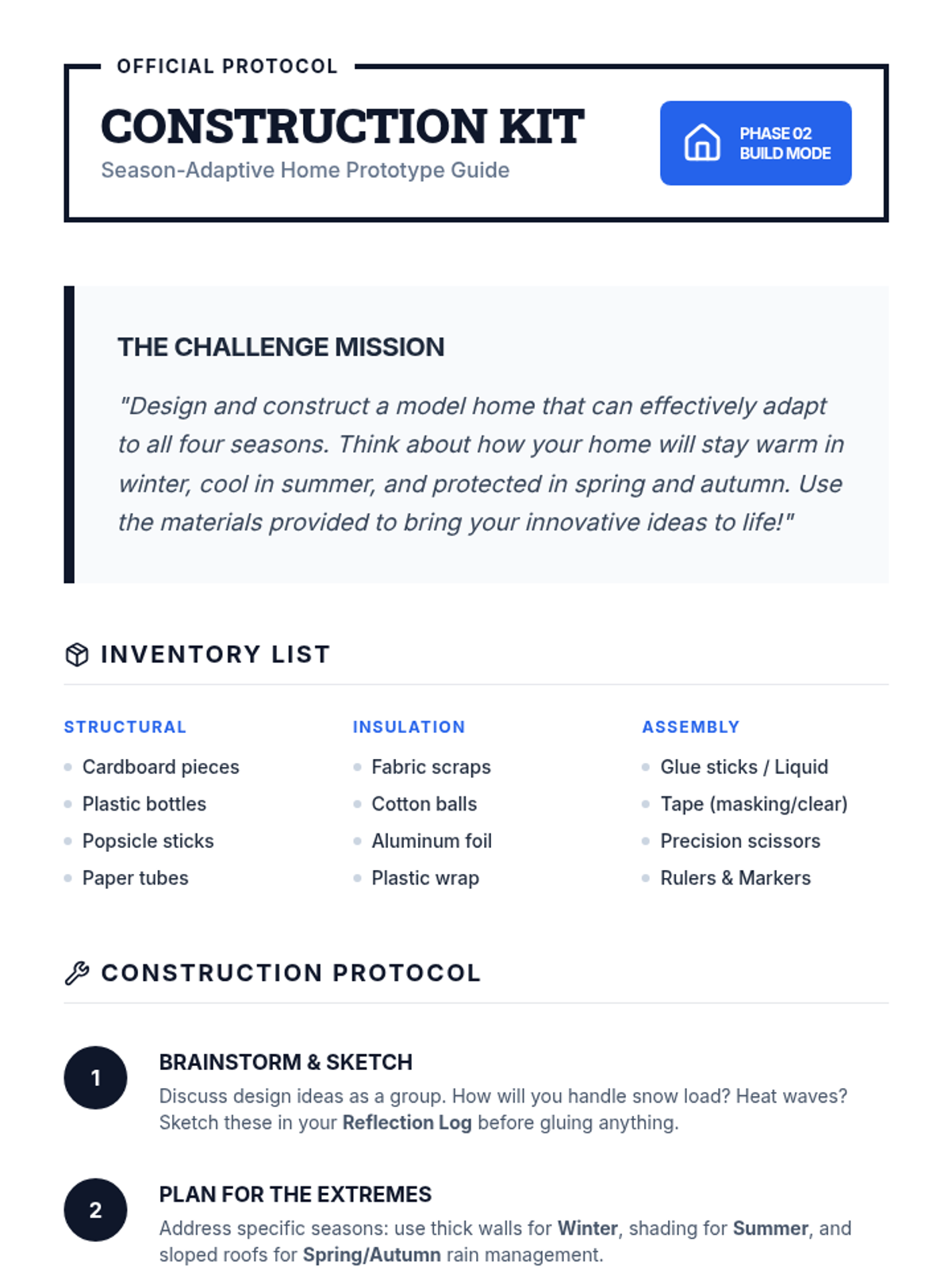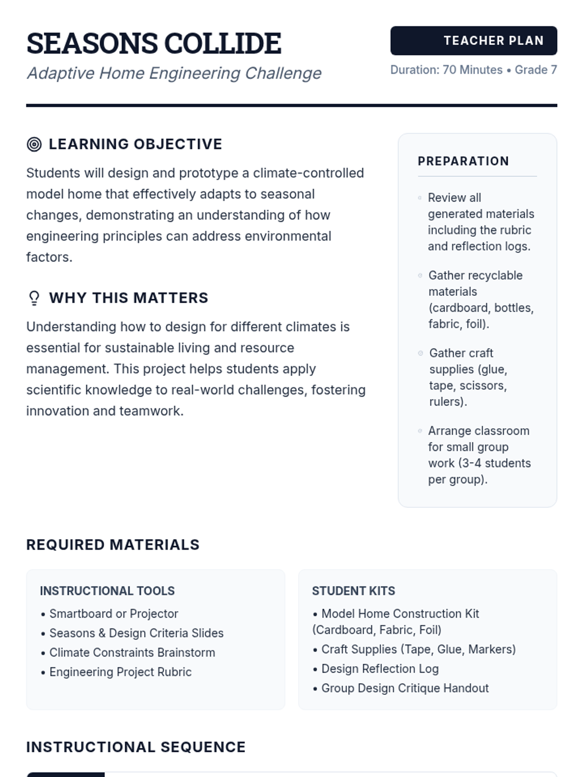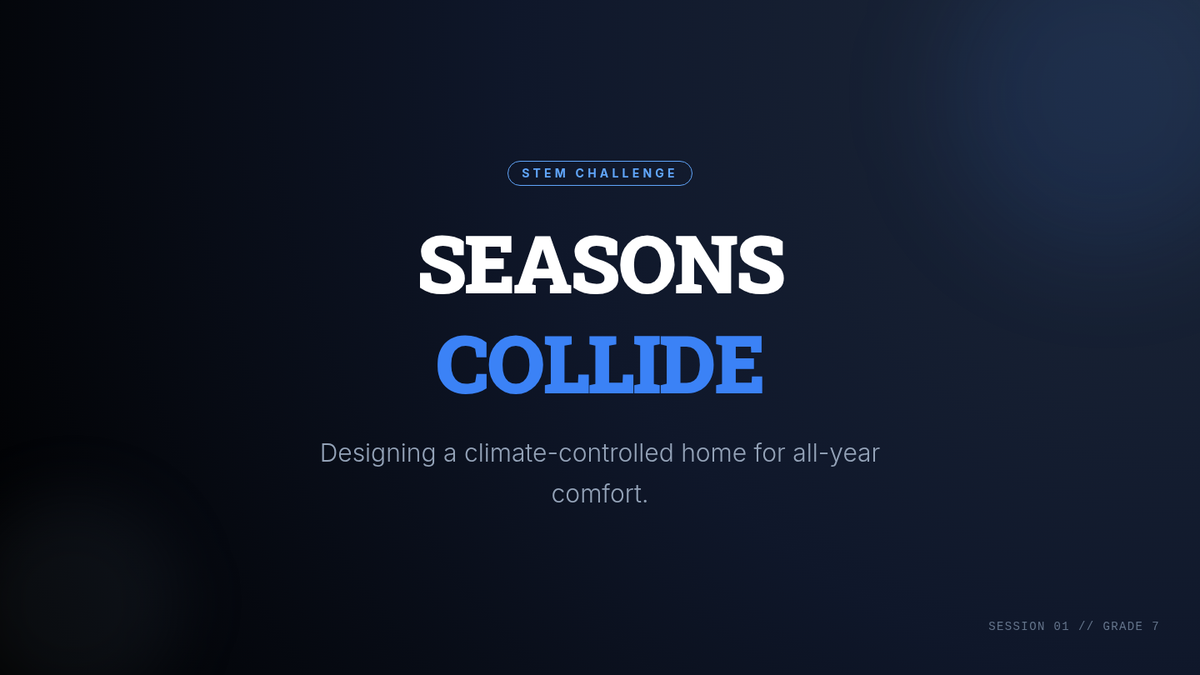 A 70-minute STEM challenge where 7th-grade students design and prototype climate-controlled model homes that adapt to all four seasons using engineering principles.