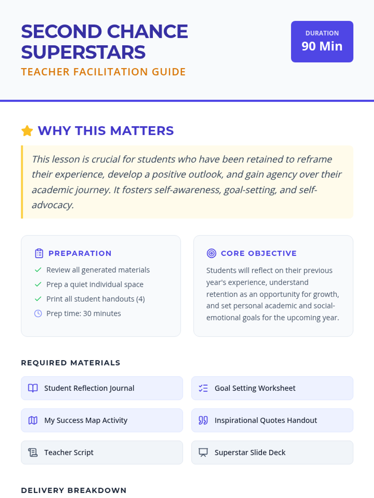 An individualized 90-minute lesson for 5th-grade students to reframe retention as a growth opportunity, set SMART goals, and build self-advocacy skills through a 'Superstar' theme.