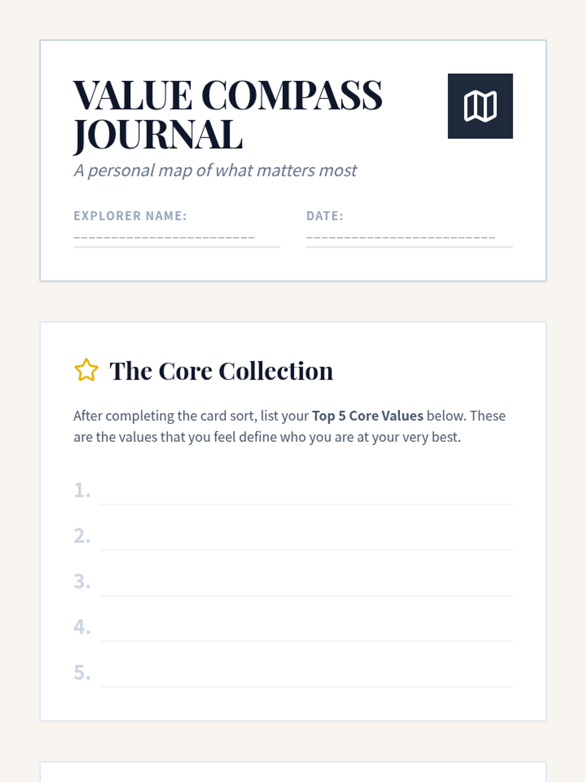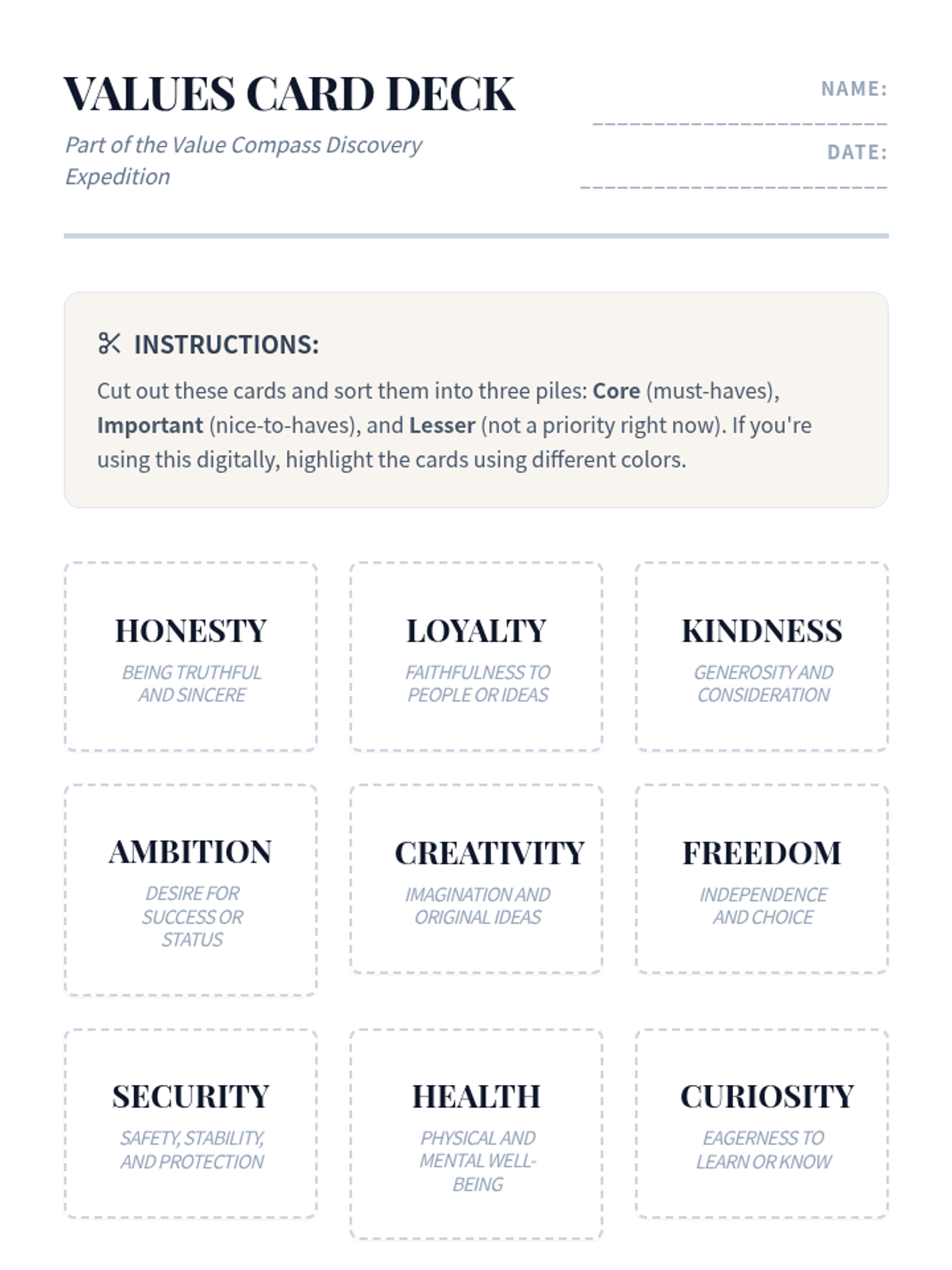 A self-paced exploration lesson designed to help students identify, categorize, and prioritize their personal values through interactive exercises.