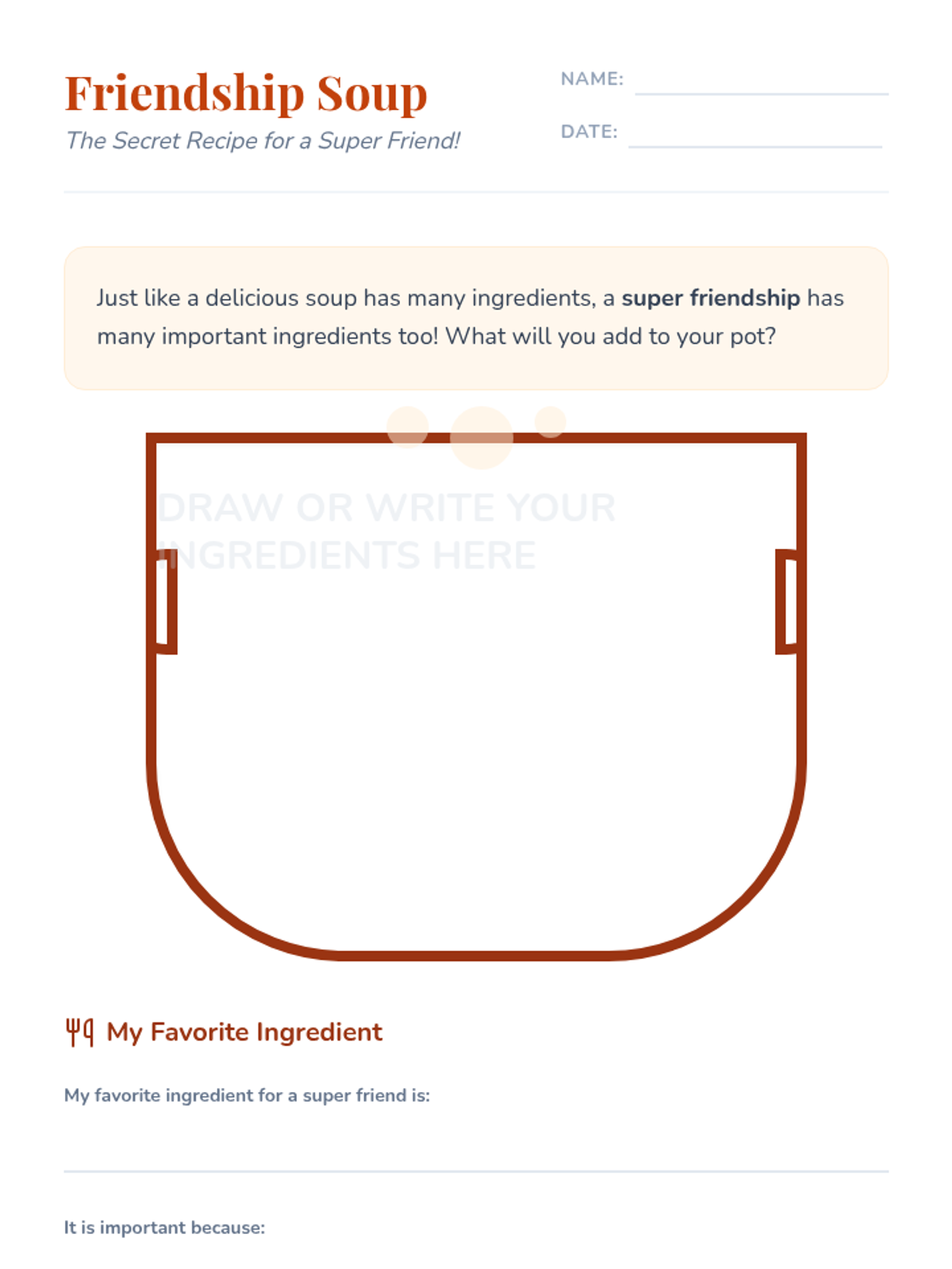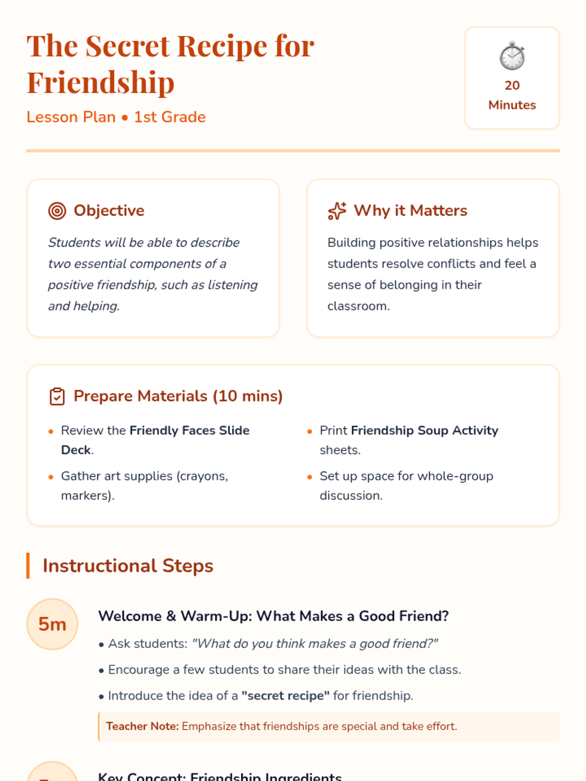 A 20-minute lesson for 1st-grade students exploring essential ingredients of friendship like listening and helping through a creative 'recipe' metaphor.