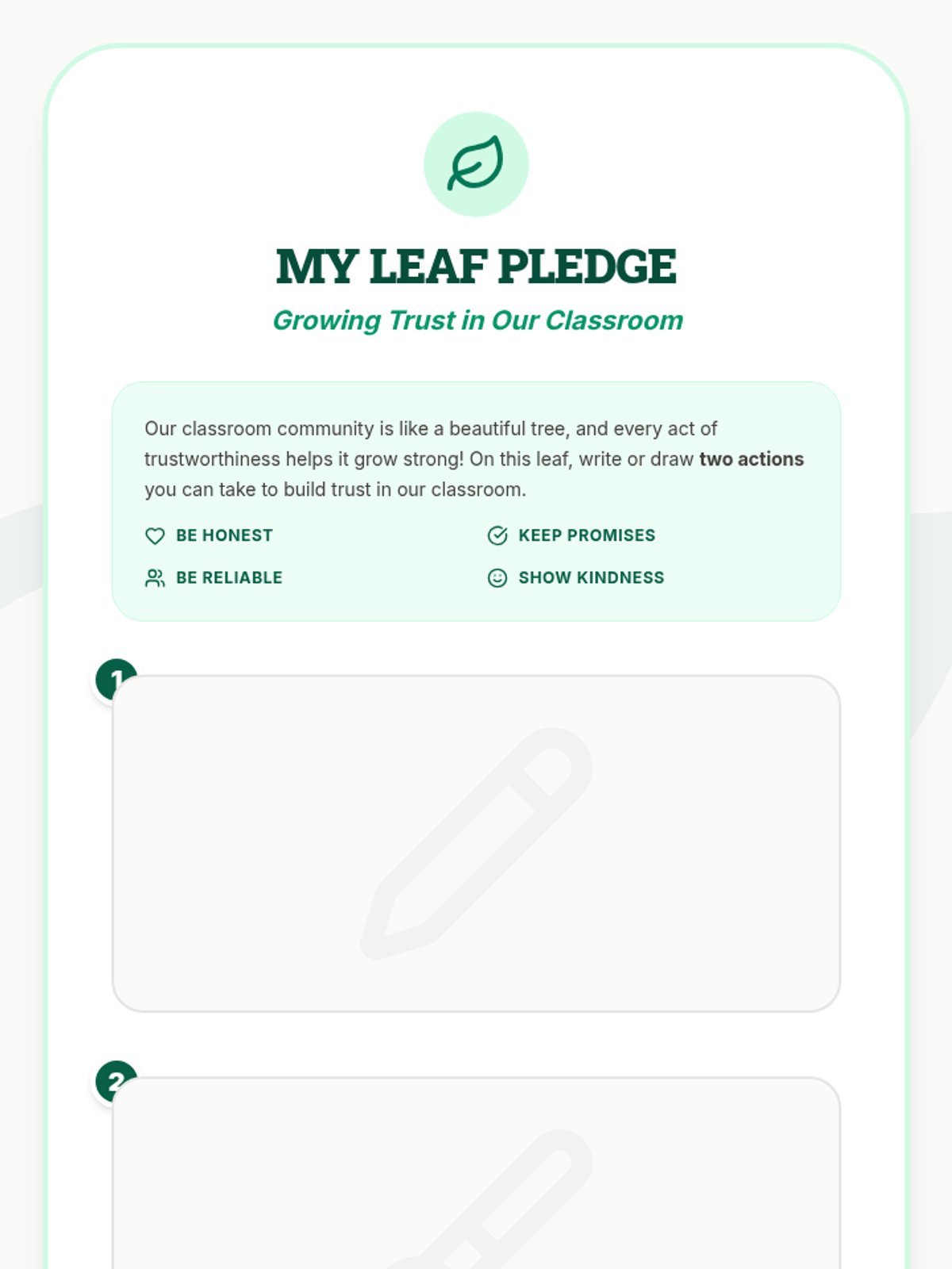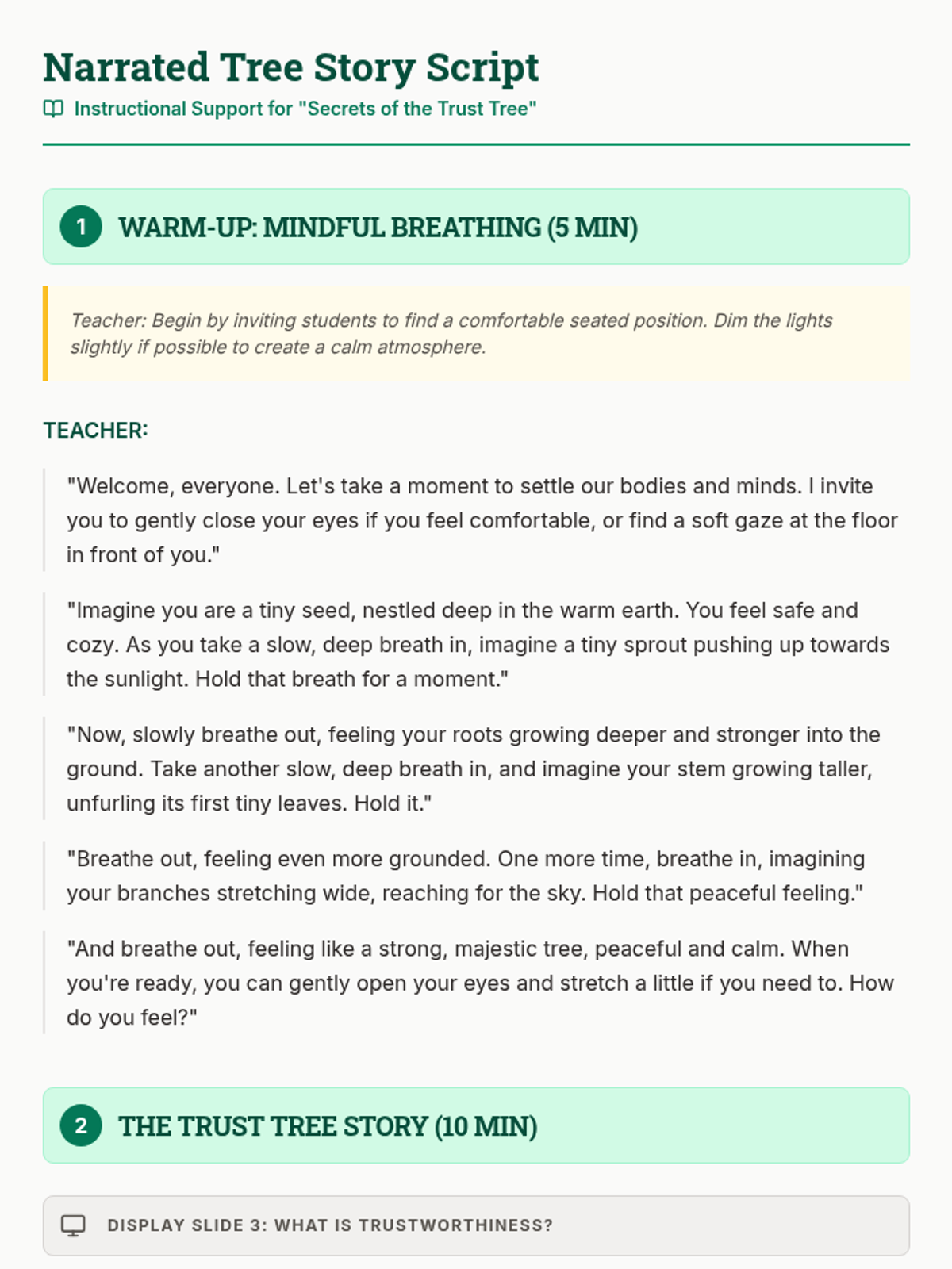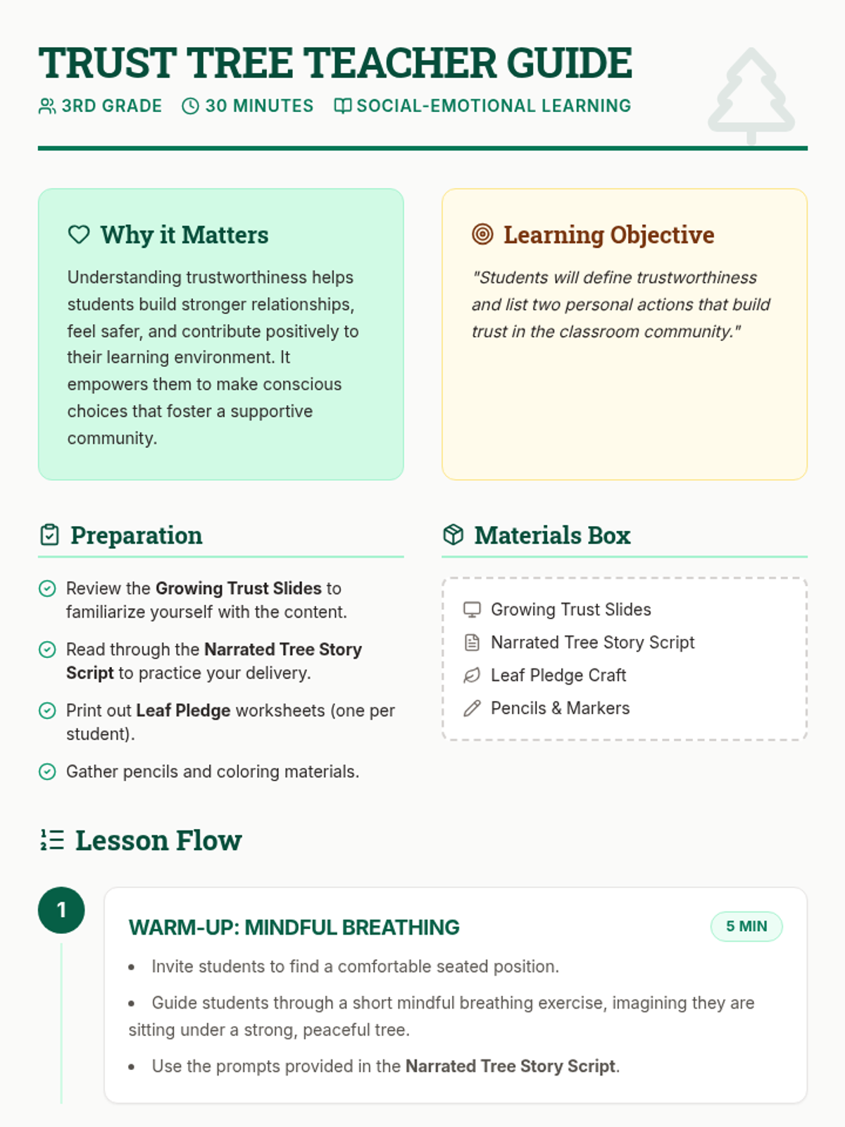 A 3rd-grade lesson on trustworthiness using the metaphor of a growing tree. Students will listen to a story about a wise oak and commit to two personal actions that build classroom trust.