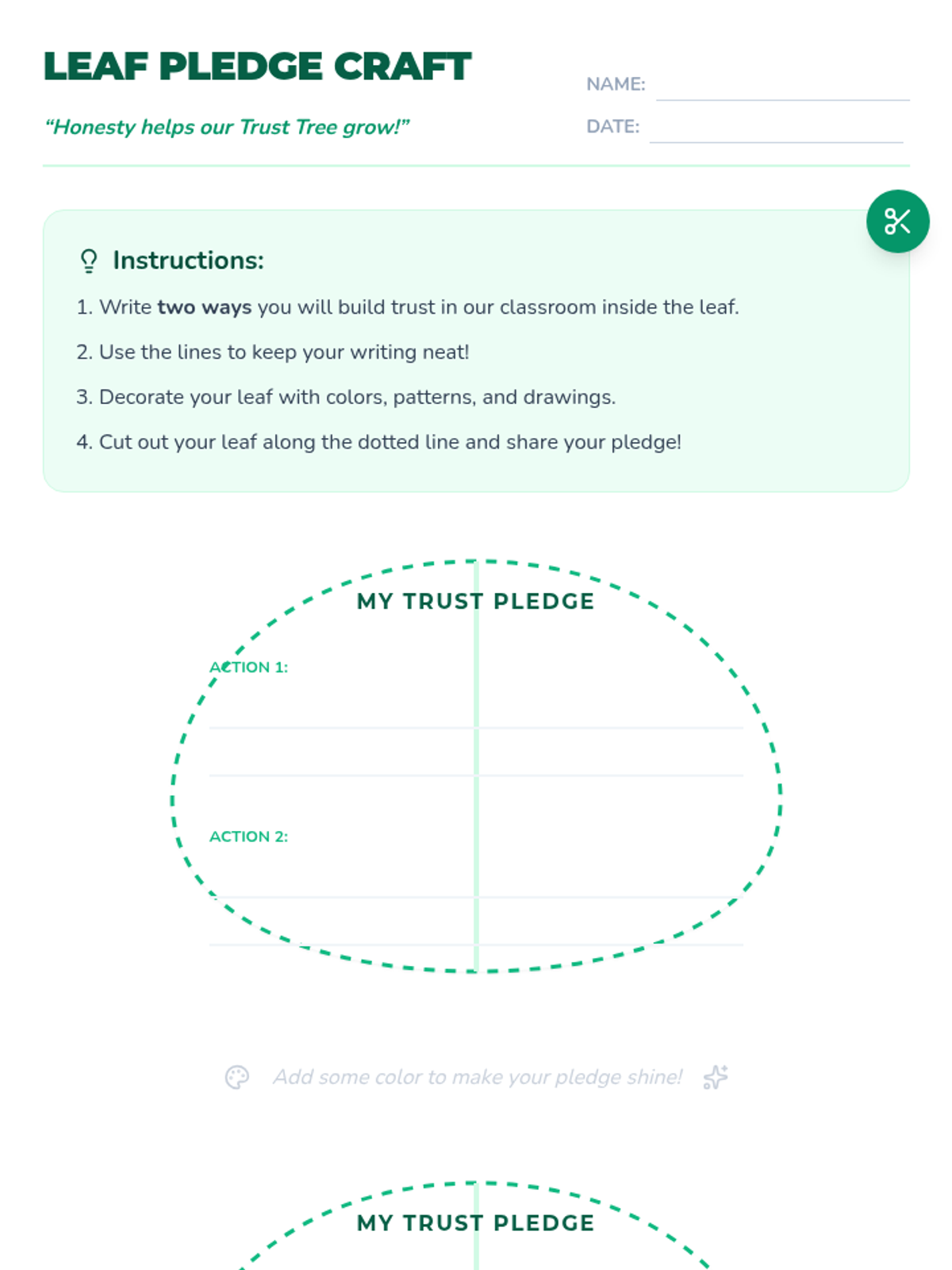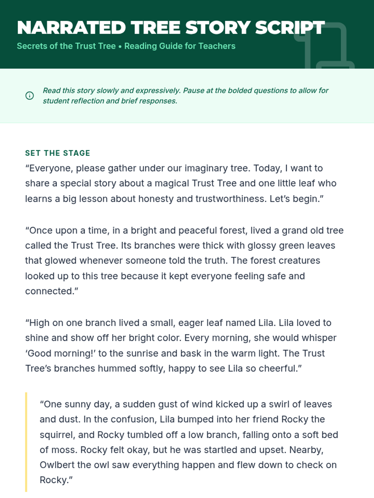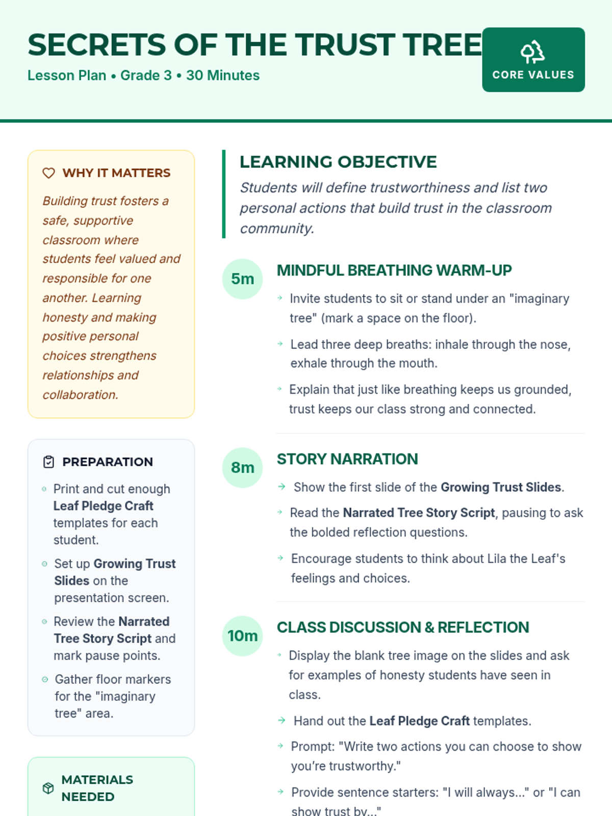 A 30-minute 3rd grade lesson where students explore trustworthiness through a narrated story, collaborative discussion, and a hands-on leaf pledge craft. Students will define honesty and identify personal actions to build a stronger classroom community.