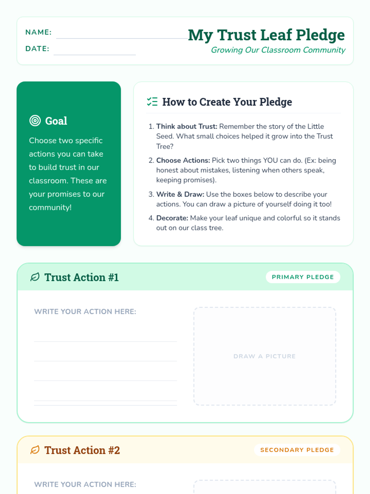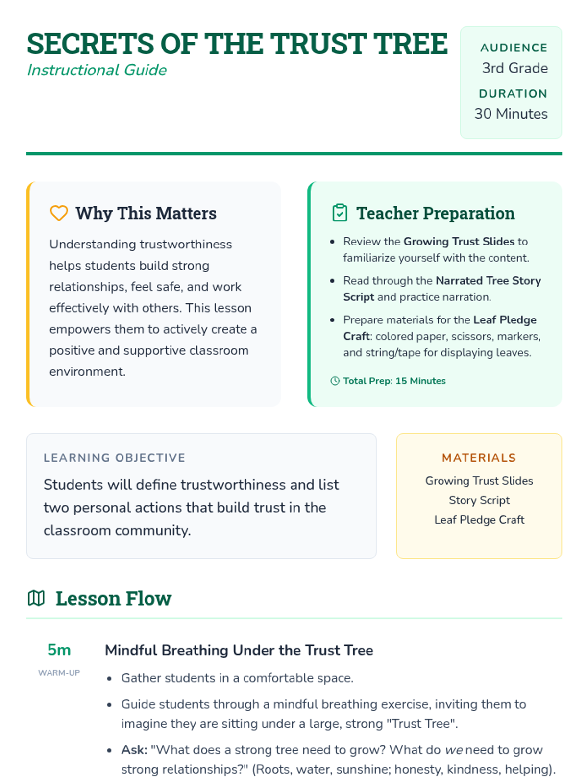 A 30-minute lesson for 3rd graders to explore the concept of trustworthiness through storytelling, reflection, and a creative pledge activity. Students learn how individual actions contribute to a safe and supportive classroom 'Trust Tree'.