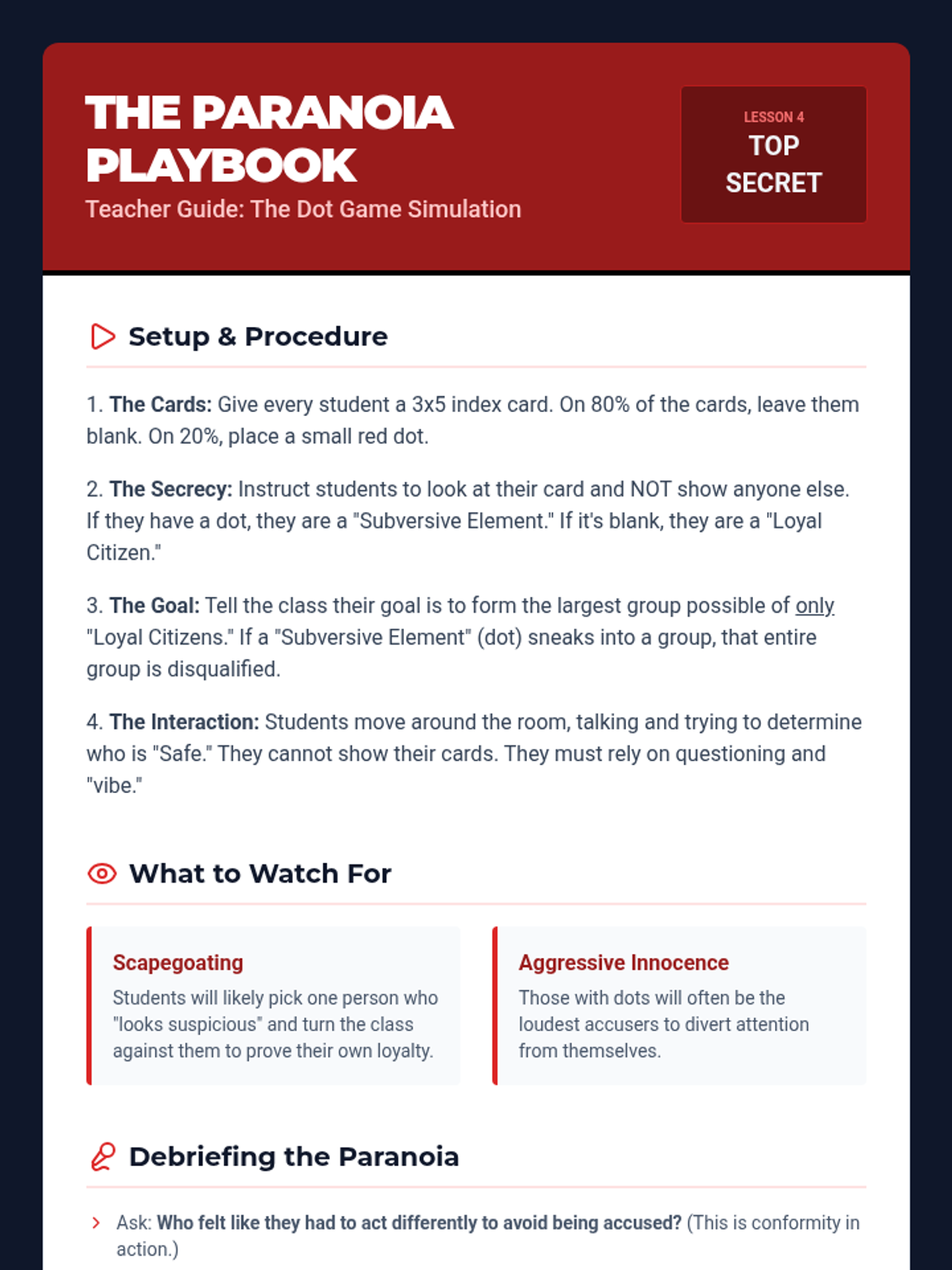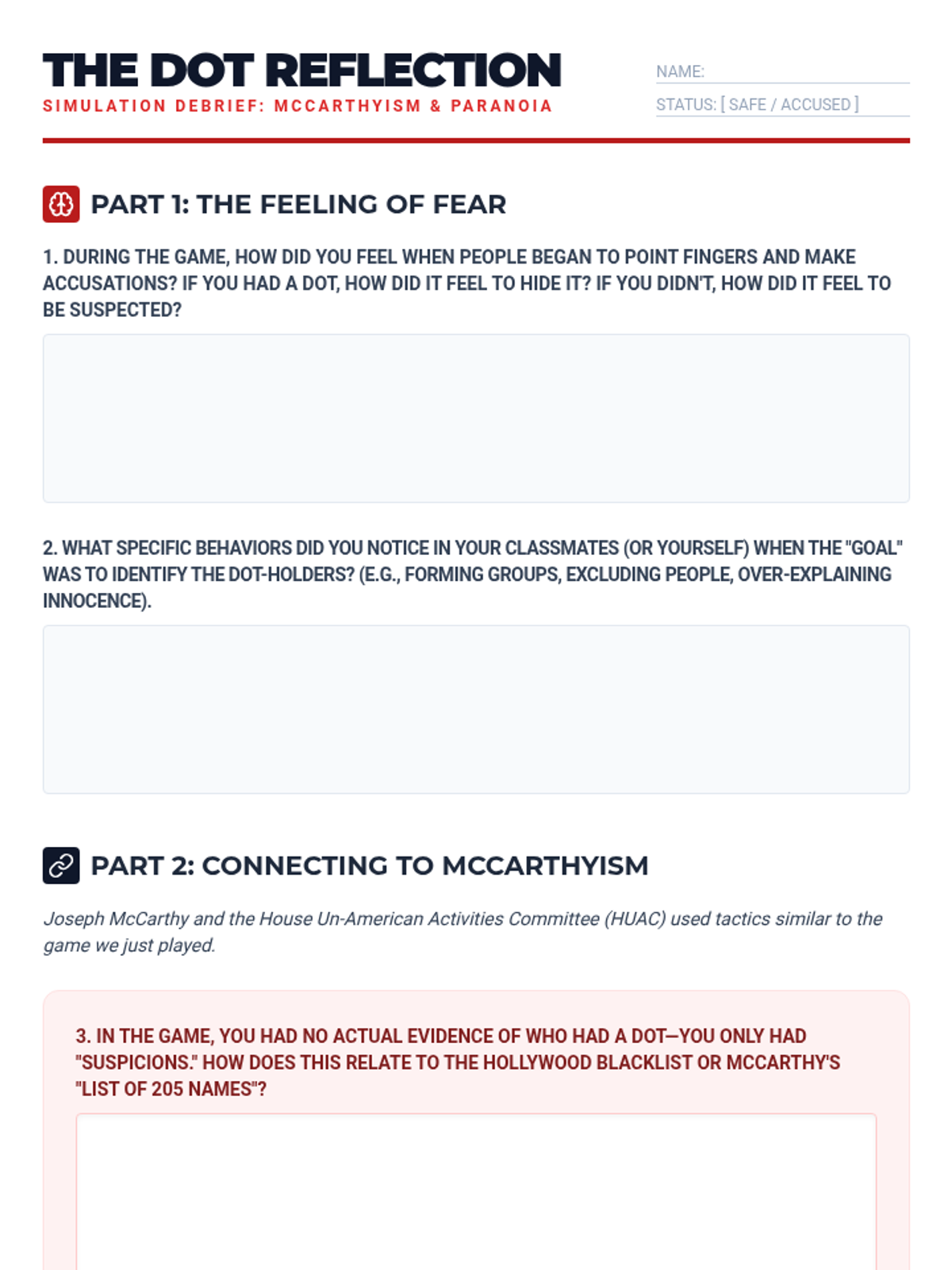 Students examine the pressure to conform during the McCarthy era. They participate in a 'Dot Game' simulation to experience the paranoia of being accused without evidence.