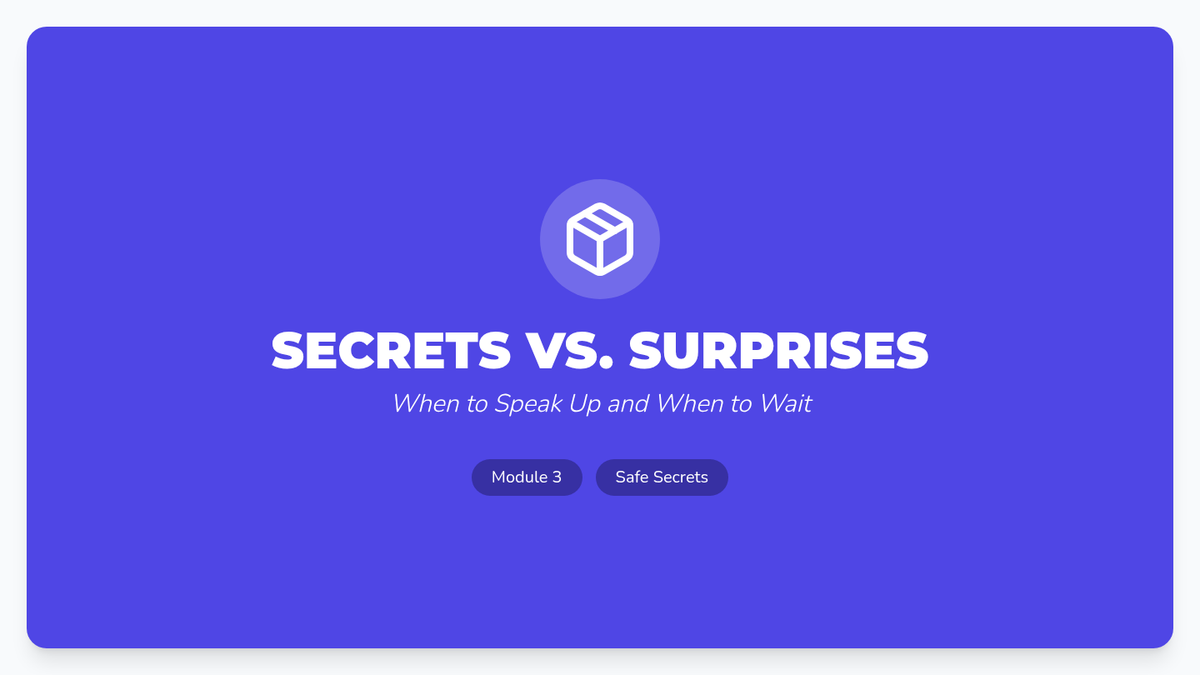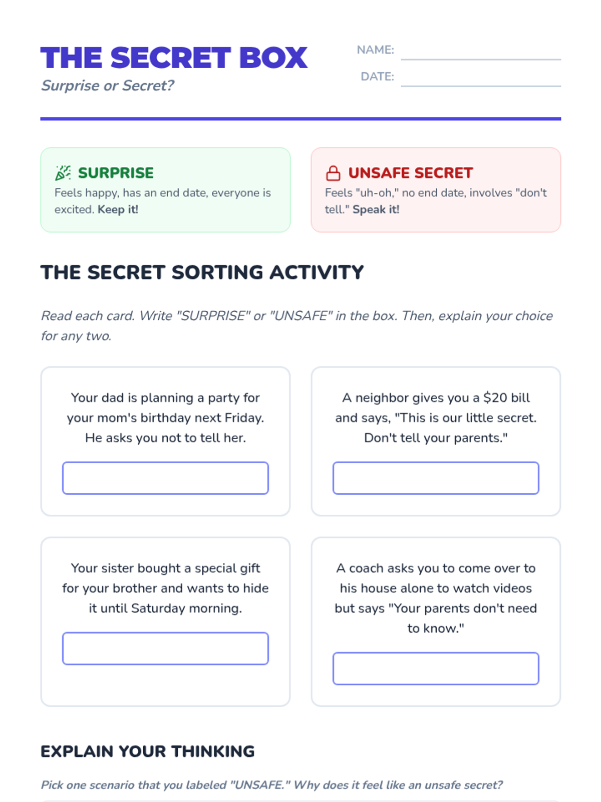 Students learn the critical difference between a 'surprise' (a happy secret with an end date) and a 'secret' (something they are told to hide from parents/guardians). Through role-play and discussion, students practice refusal skills when asked to keep secrets that make them uncomfortable.