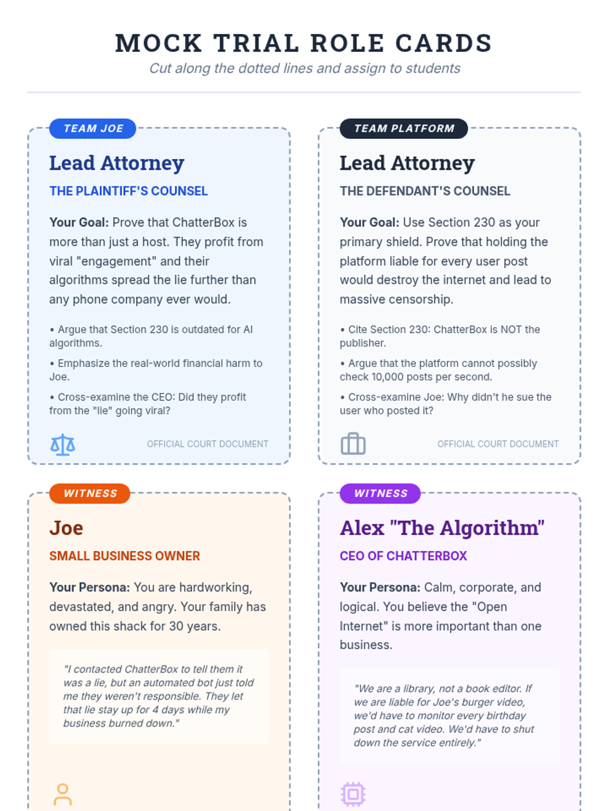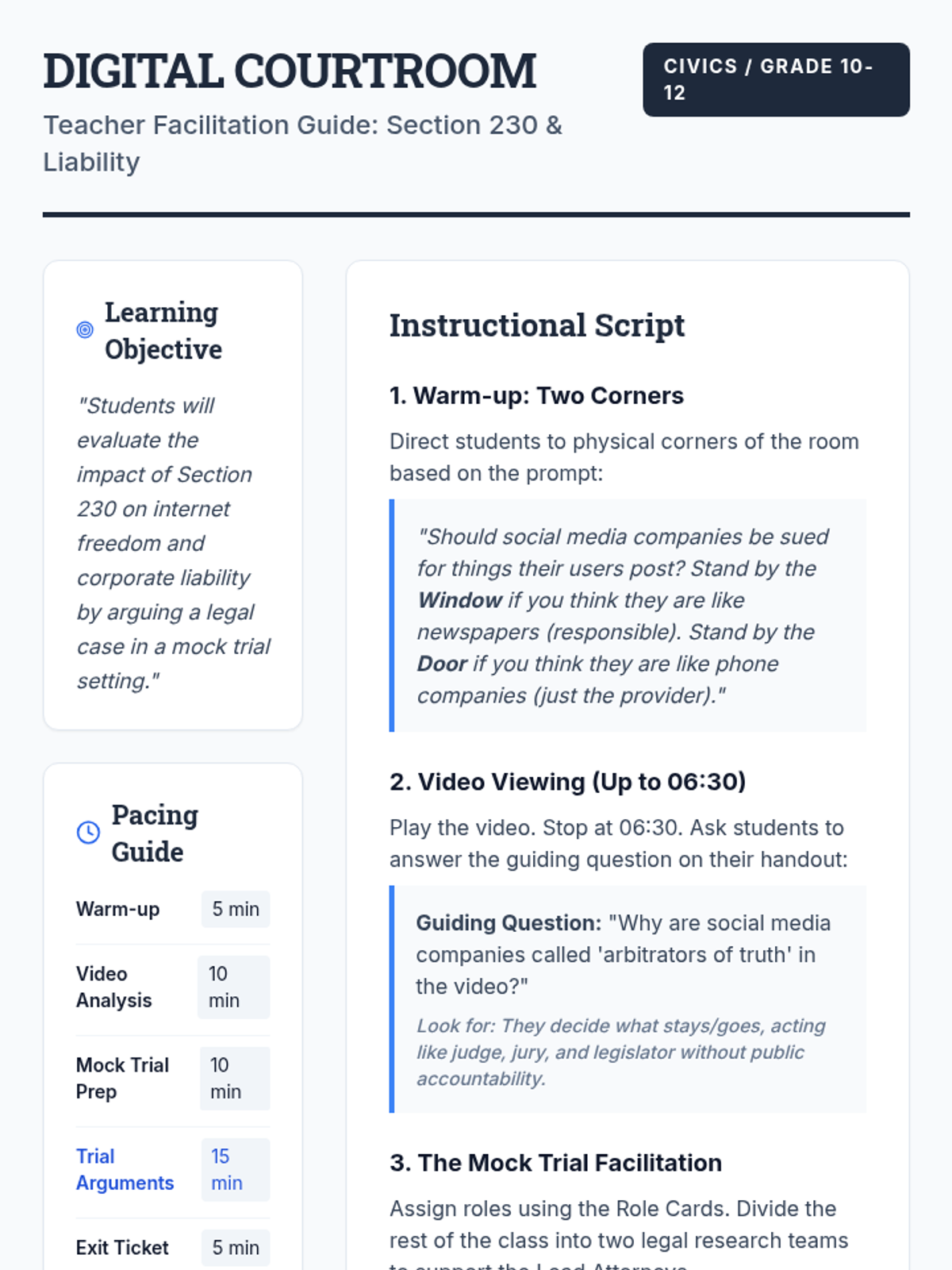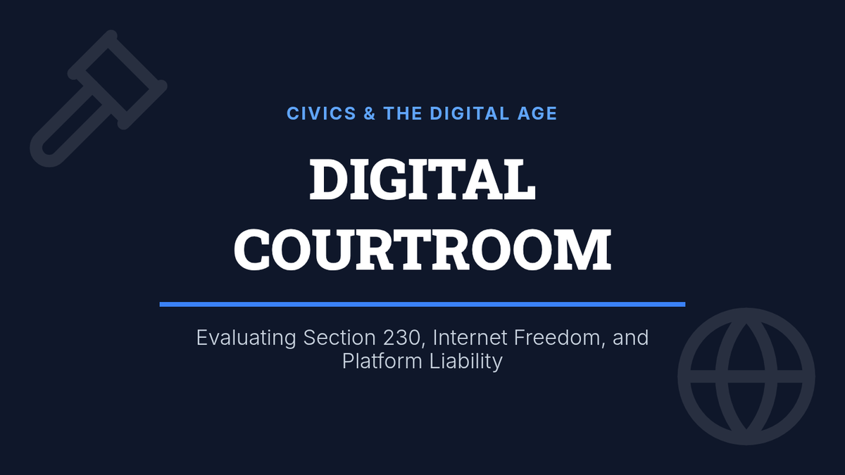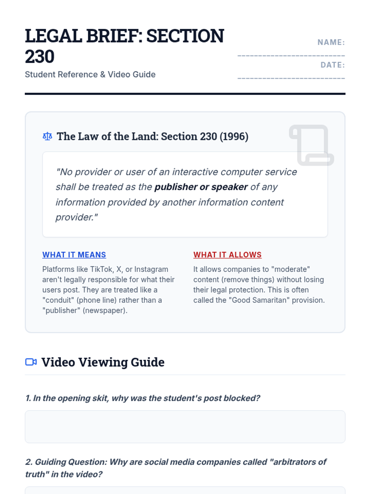 This High School Civics lesson explores the critical debate surrounding Section 230 of the Communications Decency Act. Students will analyze the legal protections that immunize social media platforms from liability for user content and participate in a mock trial to evaluate the balance between internet freedom and corporate accountability.