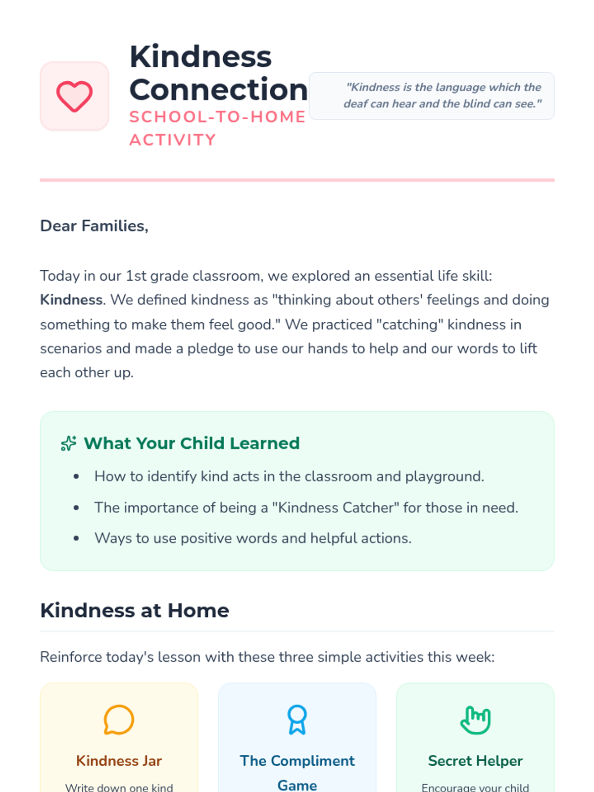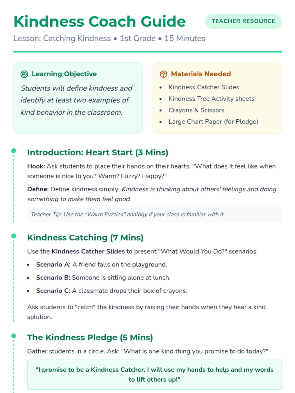 A 15-minute introductory lesson for 1st graders to define kindness and identify kind acts within their classroom community. Students explore scenarios and commit to a classroom kindness pledge.