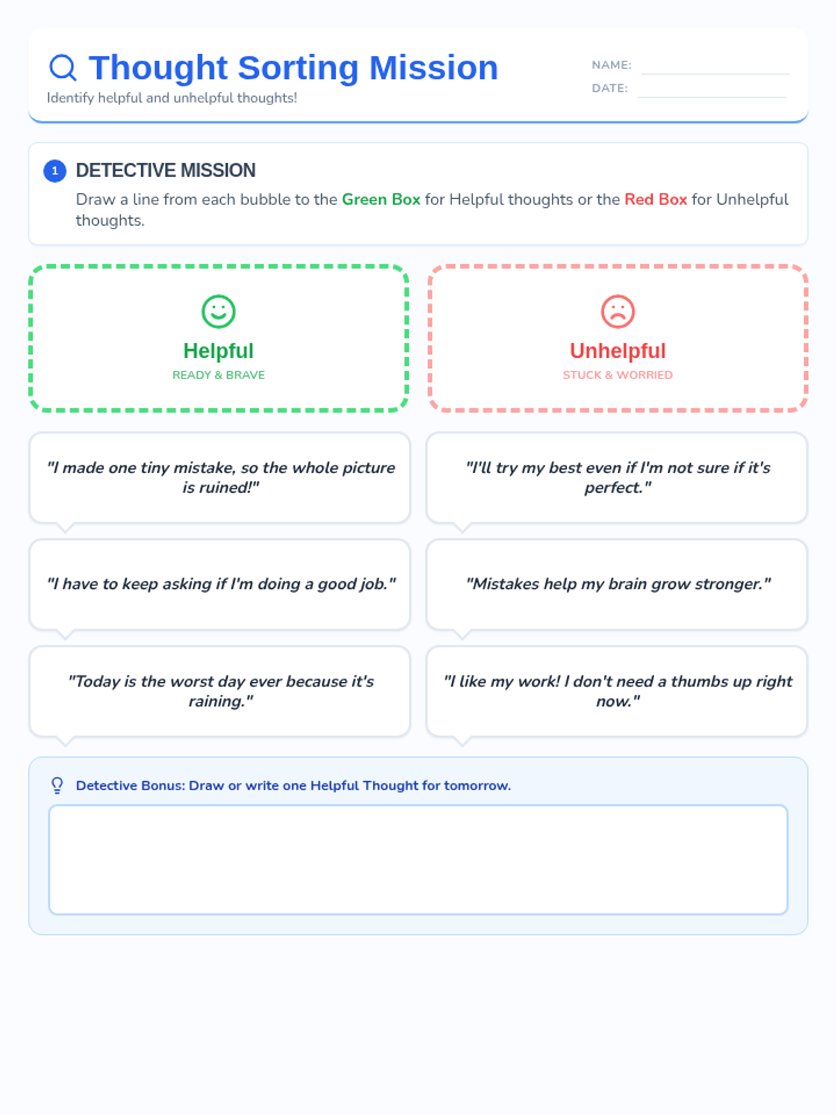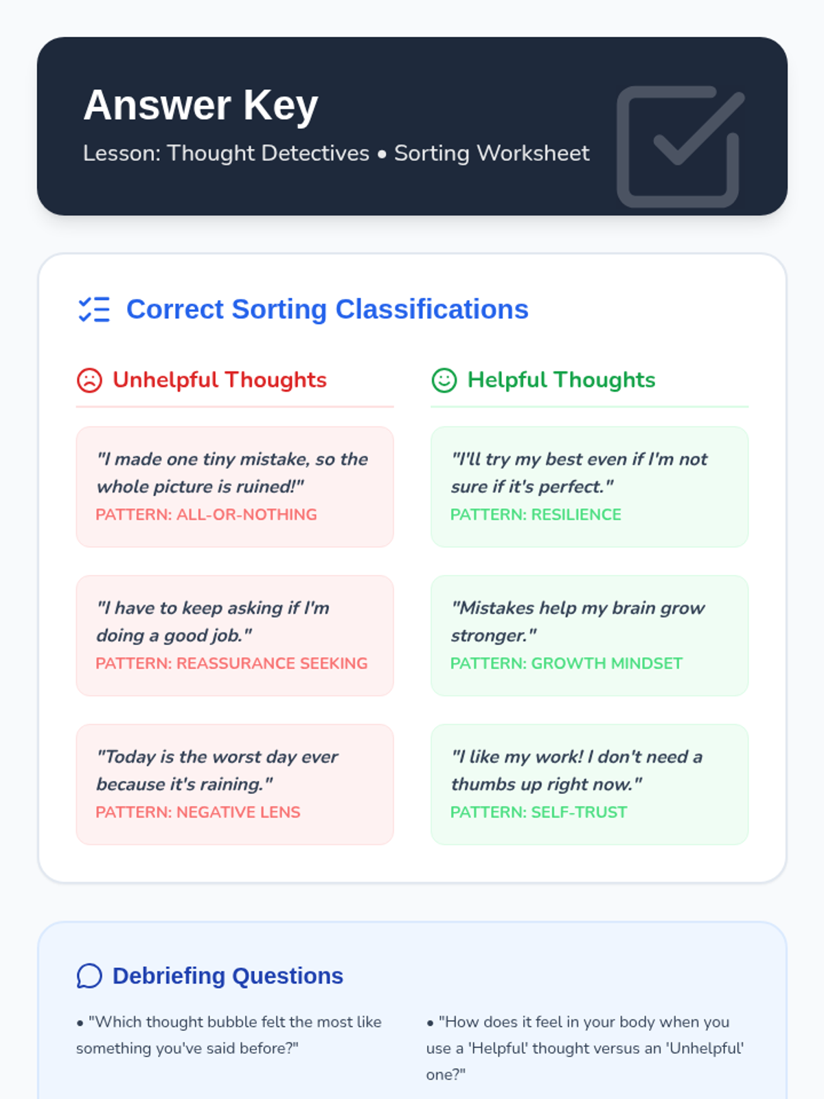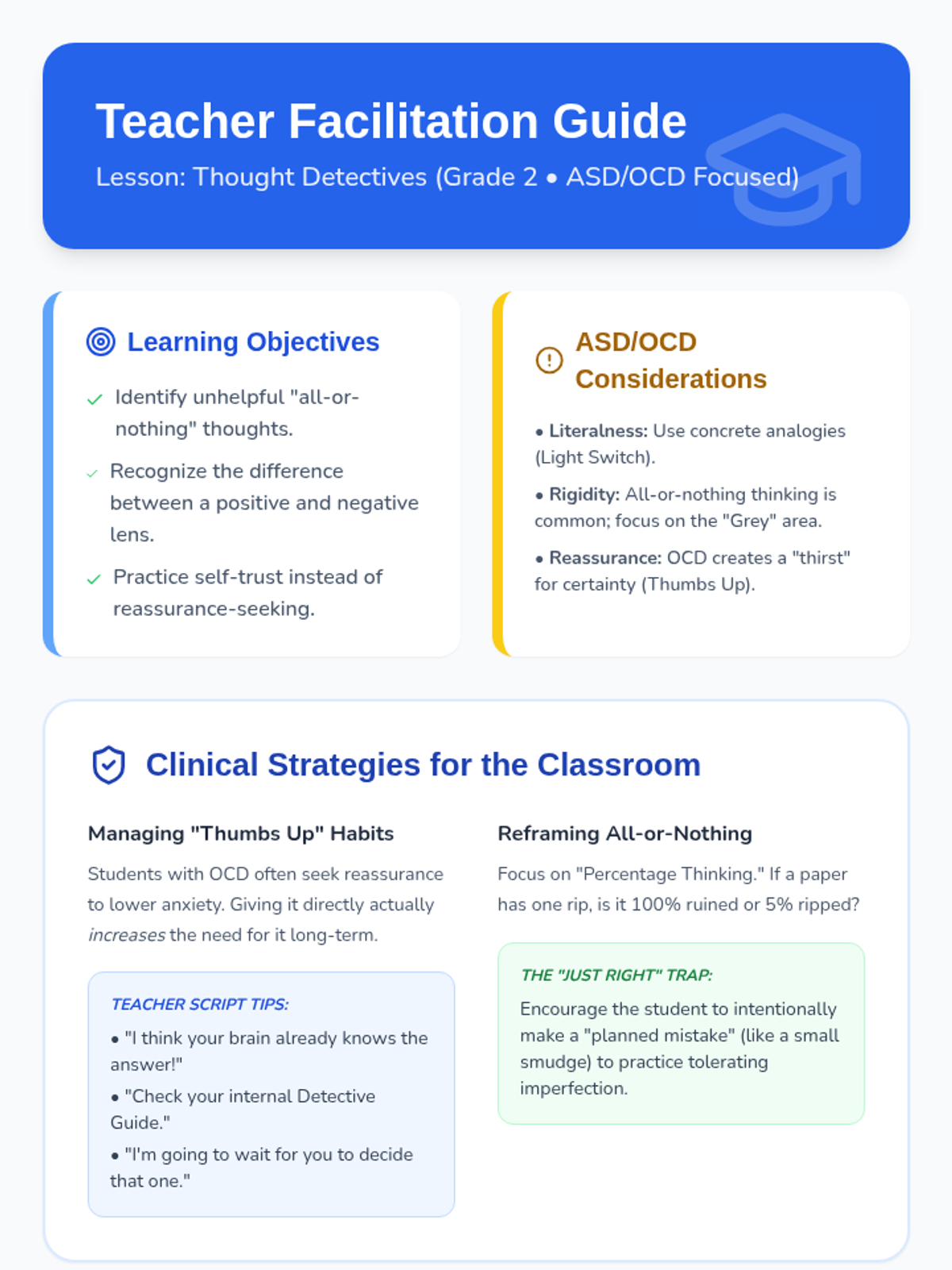 A social-emotional learning lesson designed for 2nd grade students with ASD and OCD, focusing on identifying and reframing 'all-or-nothing' thinking, negative bias, and reassurance-seeking behaviors.