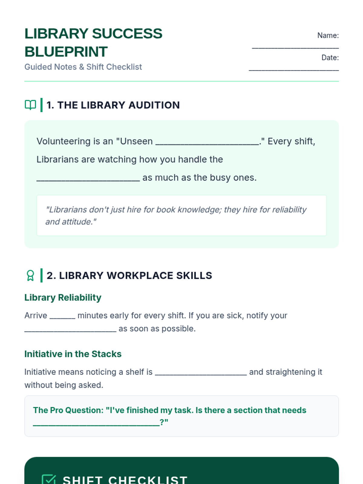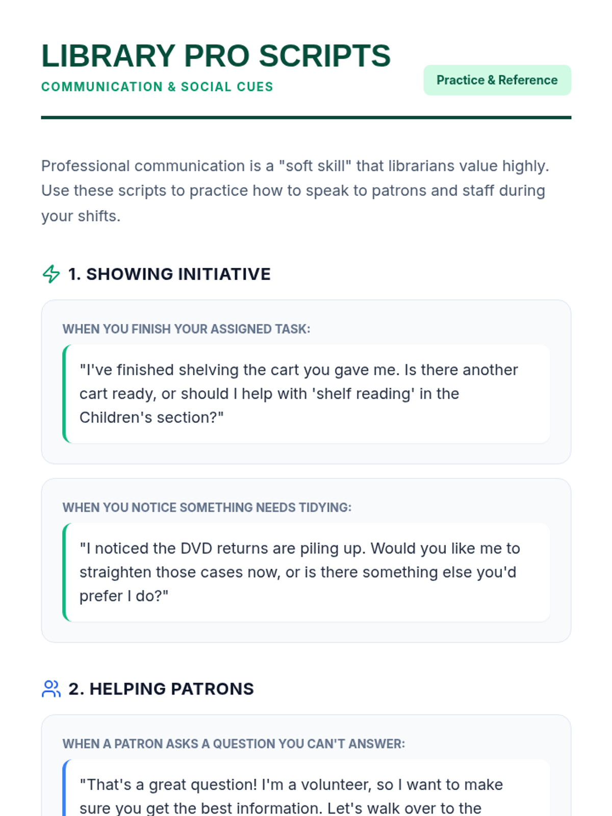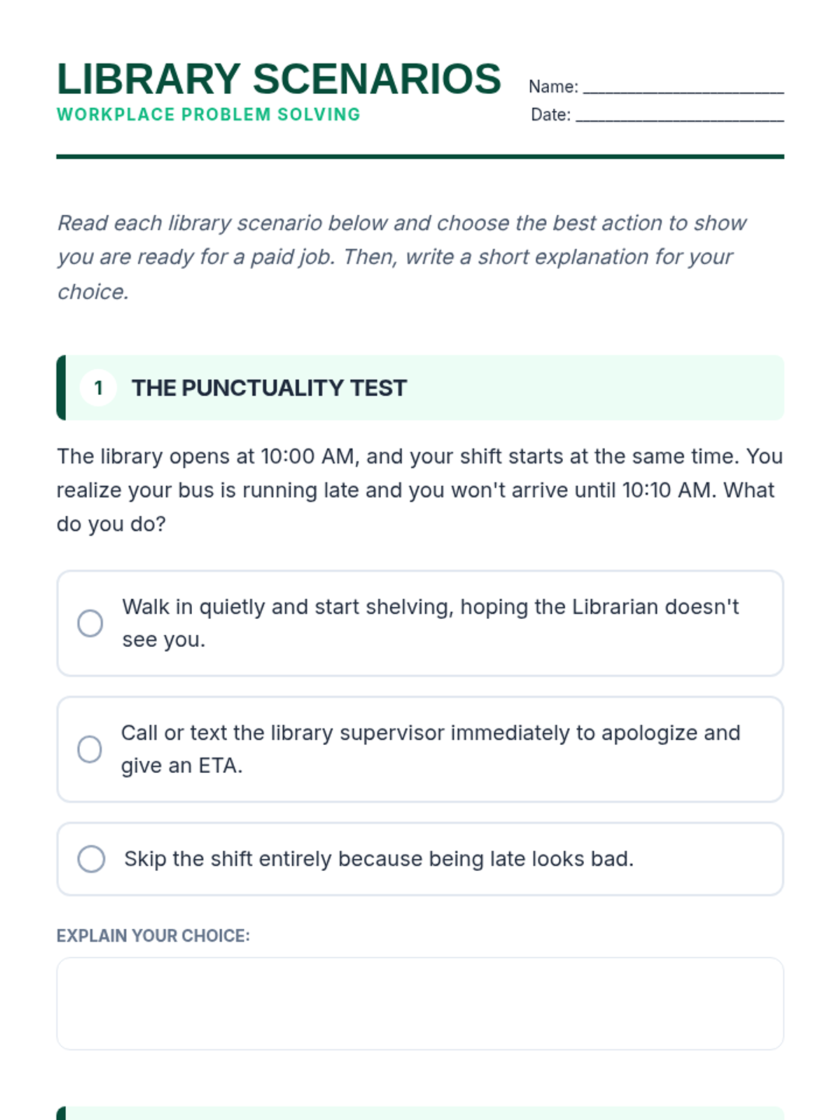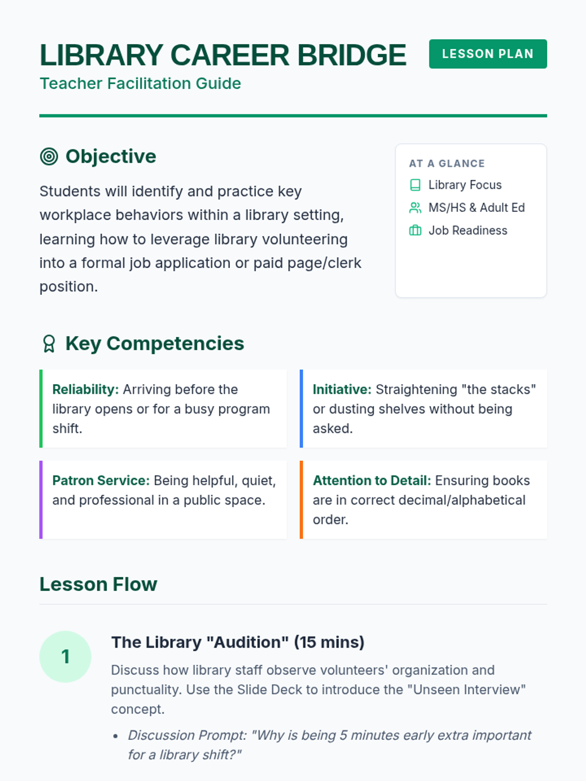This lesson teaches students how to transition from a volunteer position to a paid role by demonstrating high-value workplace behaviors like initiative, reliability, and teamwork. It is designed for diverse learners, including those in job-readiness programs and students with social/communication goals.