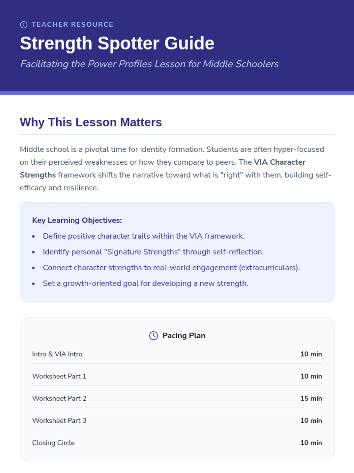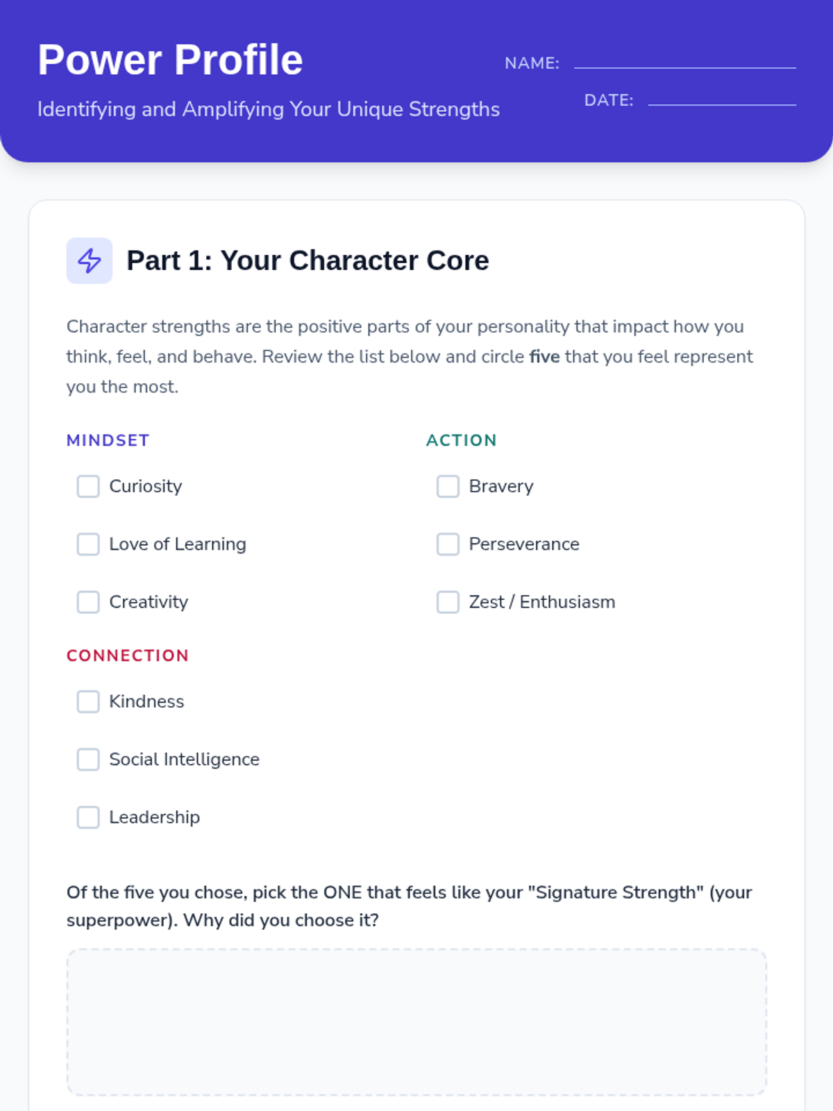 A lesson designed to help middle school students identify their unique character strengths and connect them to their extracurricular interests, fostering self-awareness and personal growth.