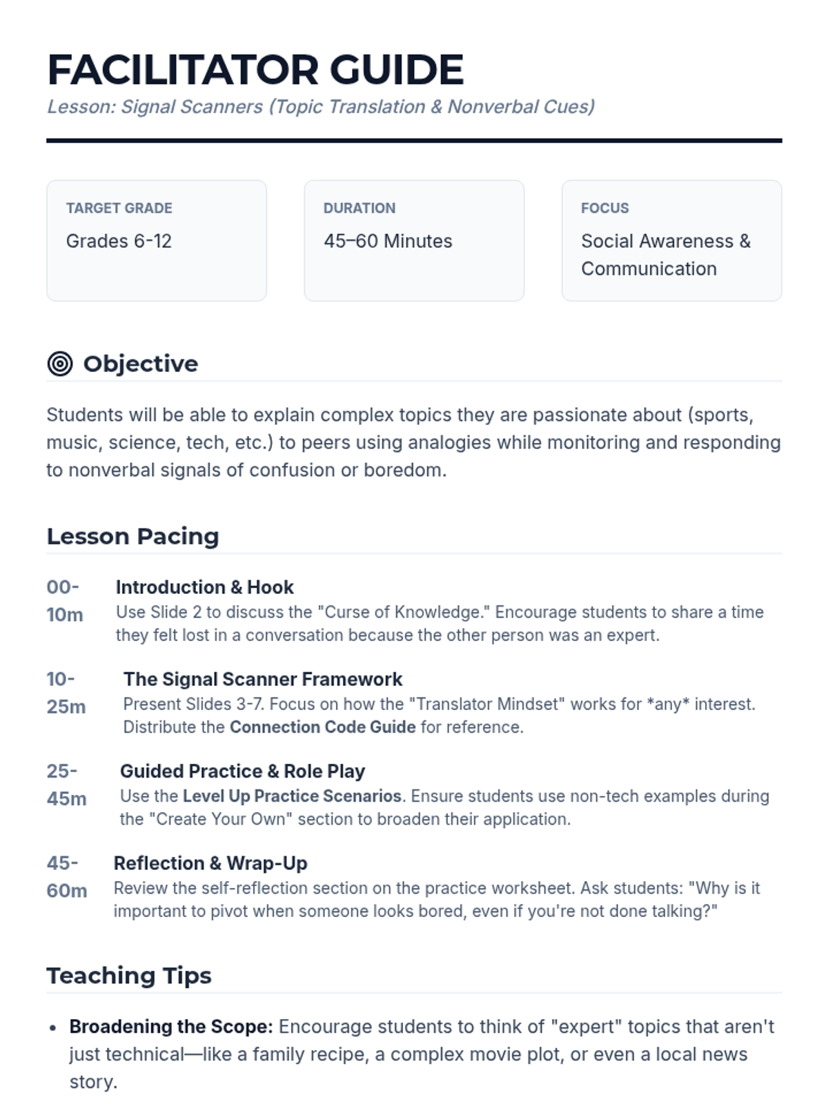 A lesson designed to help middle and high school students translate their deep interests and specialized knowledge into accessible conversations with peers while monitoring nonverbal cues.