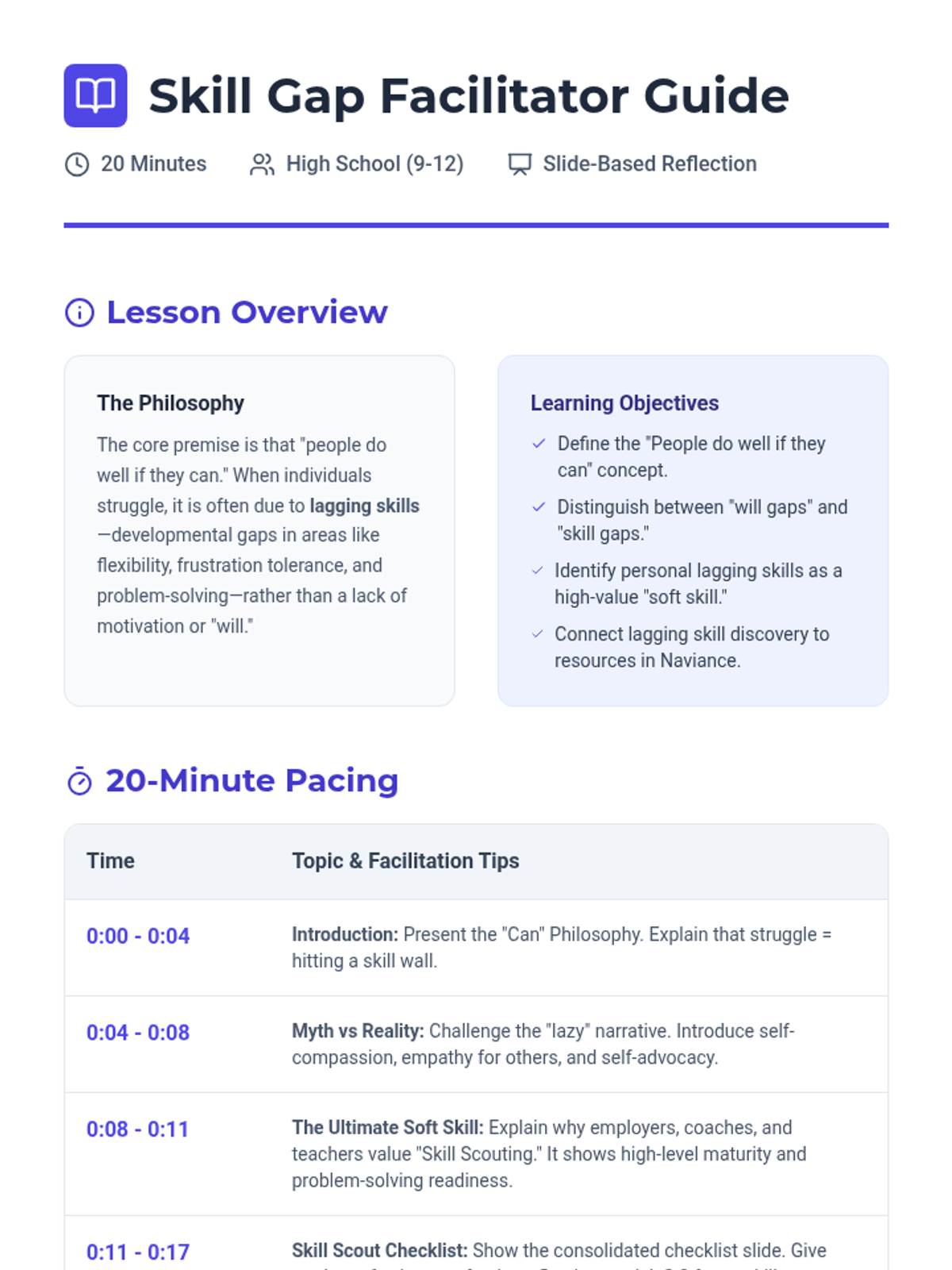 A 20-minute introductory lesson for high schoolers on the "People Do Well if They Can" philosophy, focusing on identifying lagging skills for self-advocacy and relationship building.