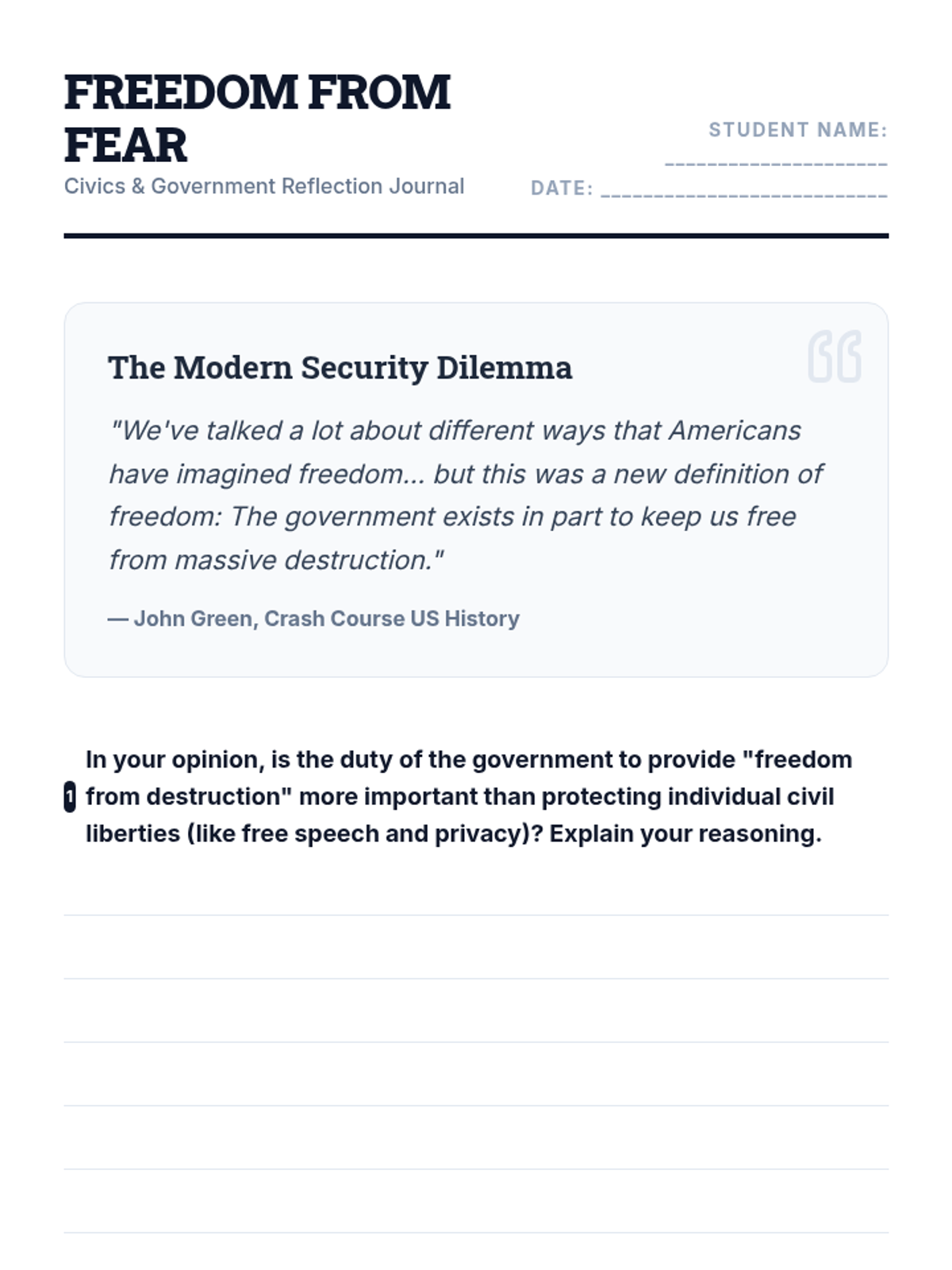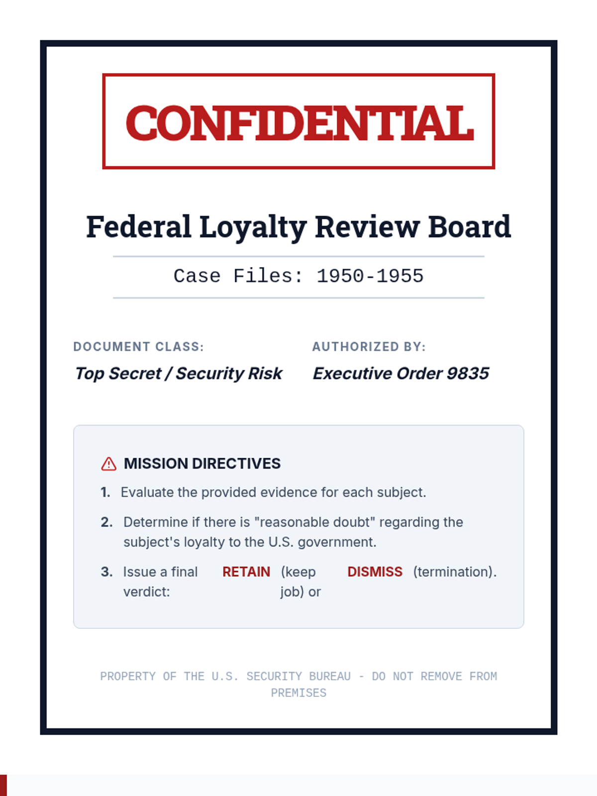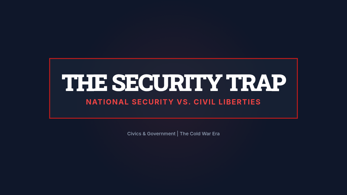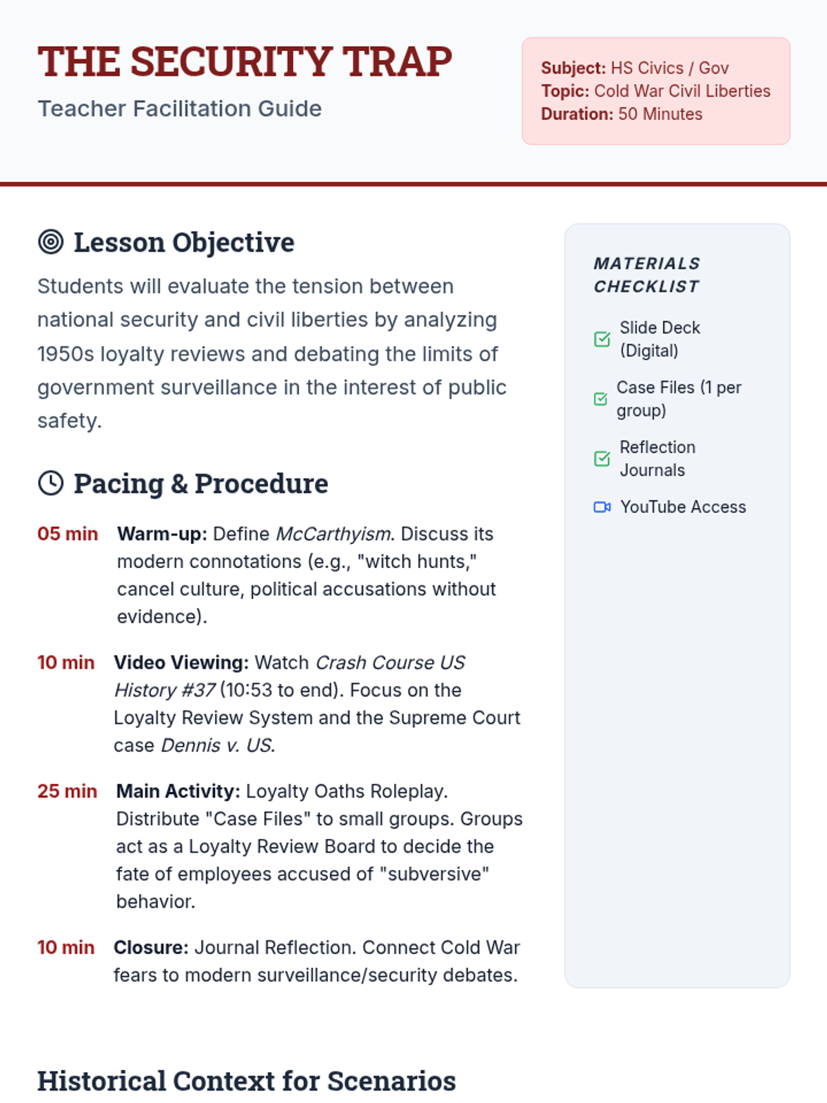This lesson explores the conflict between national security and individual rights during the Cold War. Students analyze the Red Scare, engage in a loyalty board roleplay, and reflect on the modern implications of government surveillance and speech restrictions.