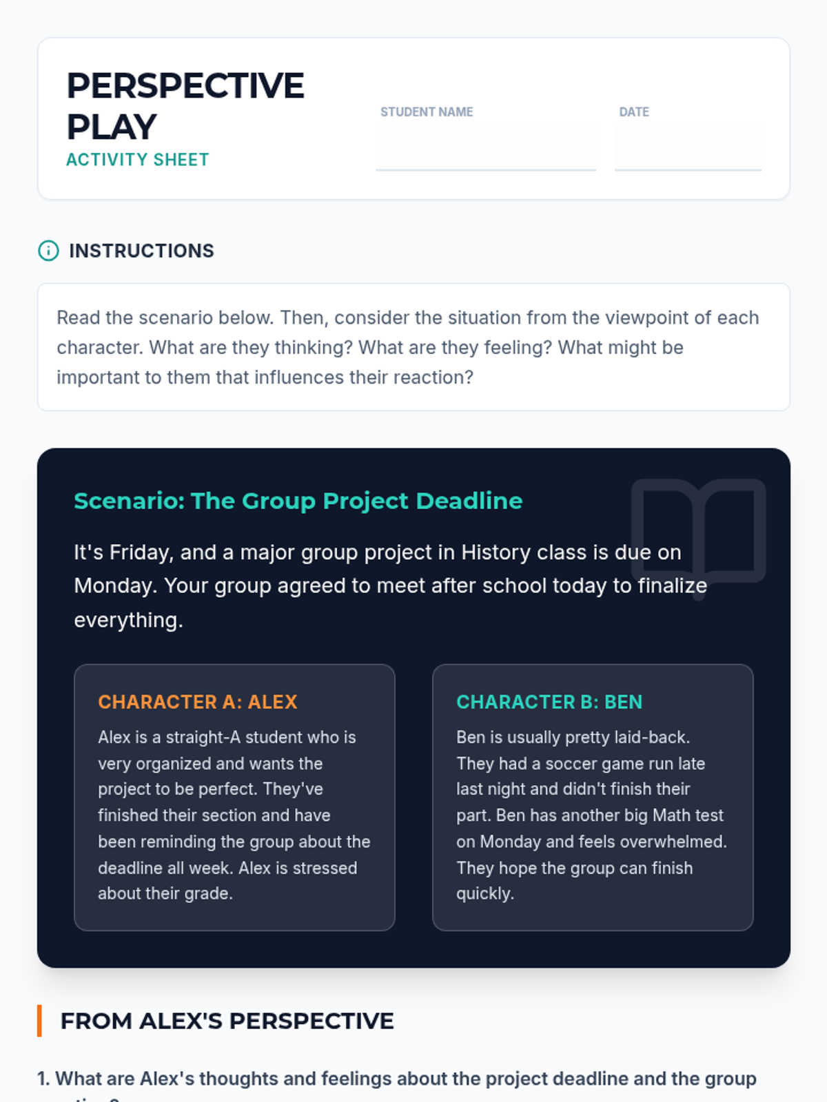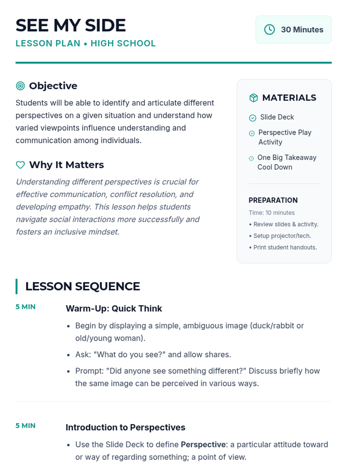 A 30-minute high school lesson focused on developing empathy and critical thinking by exploring different perspectives in social and academic scenarios.