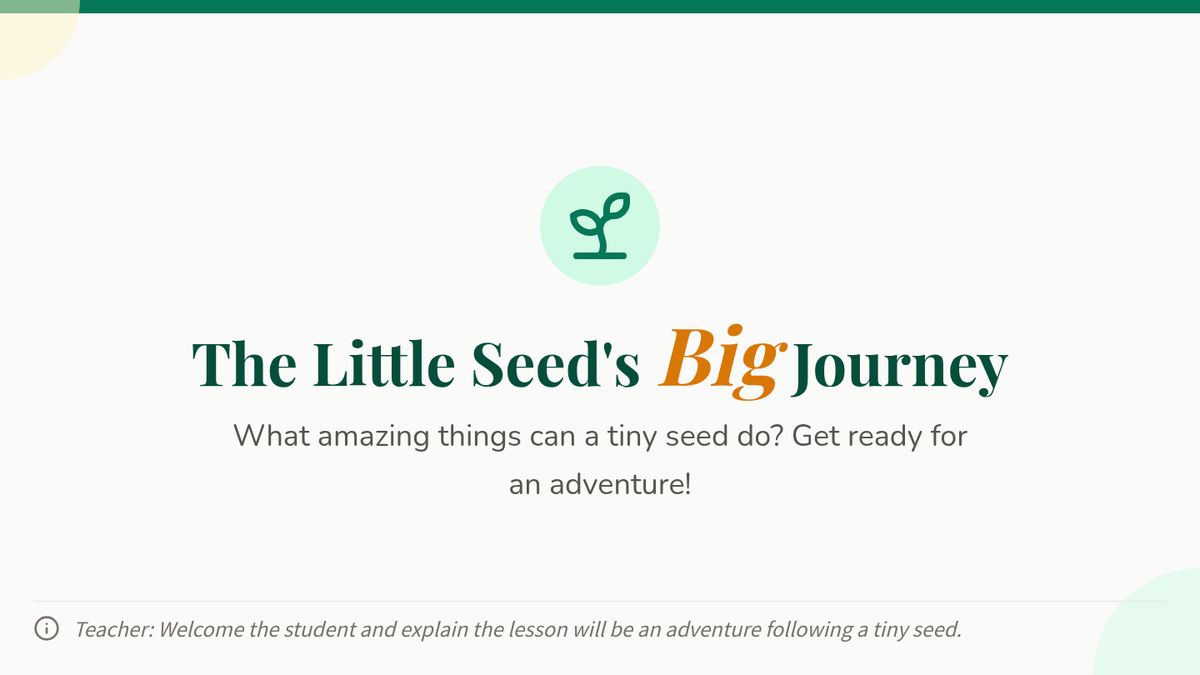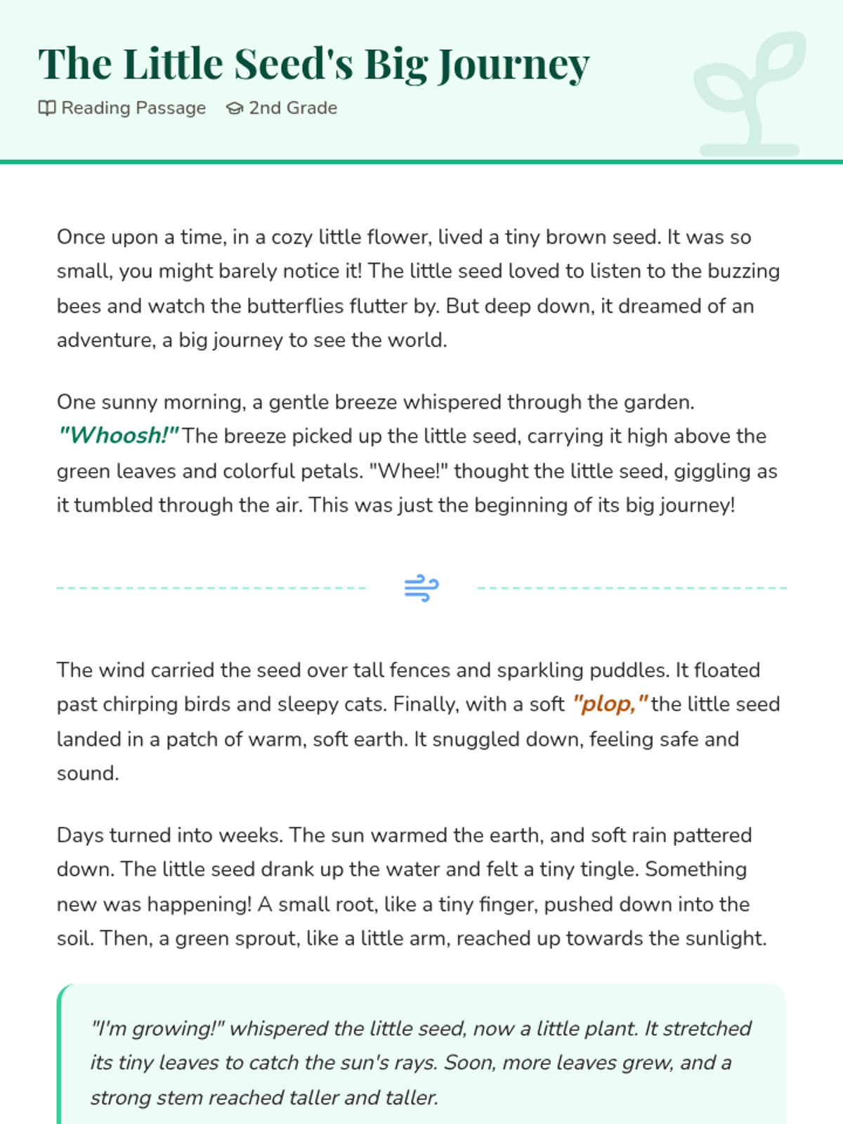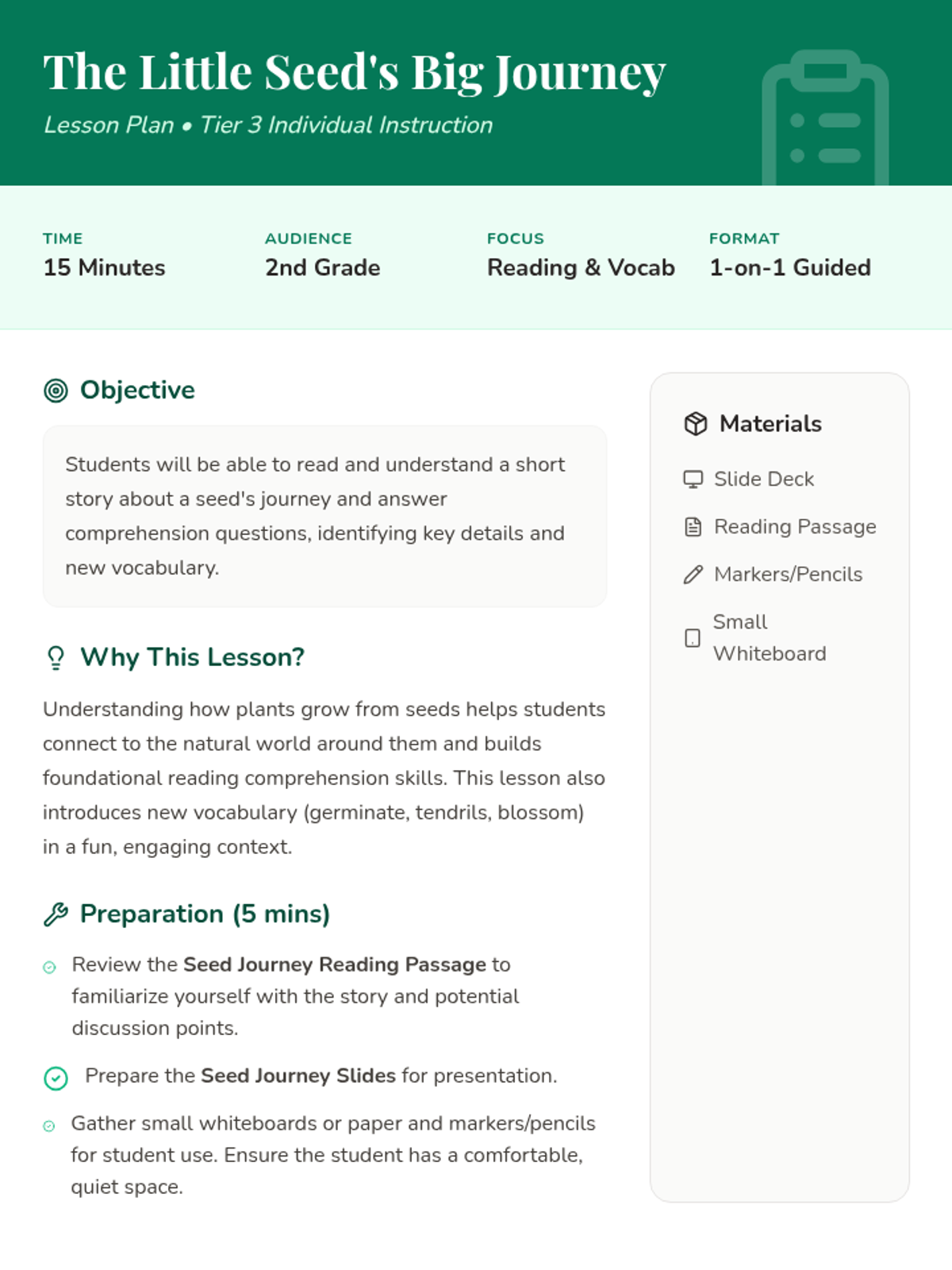 A 15-minute individual Tier 3 lesson for 2nd grade focusing on reading comprehension and vocabulary through the story of a seed's life cycle.