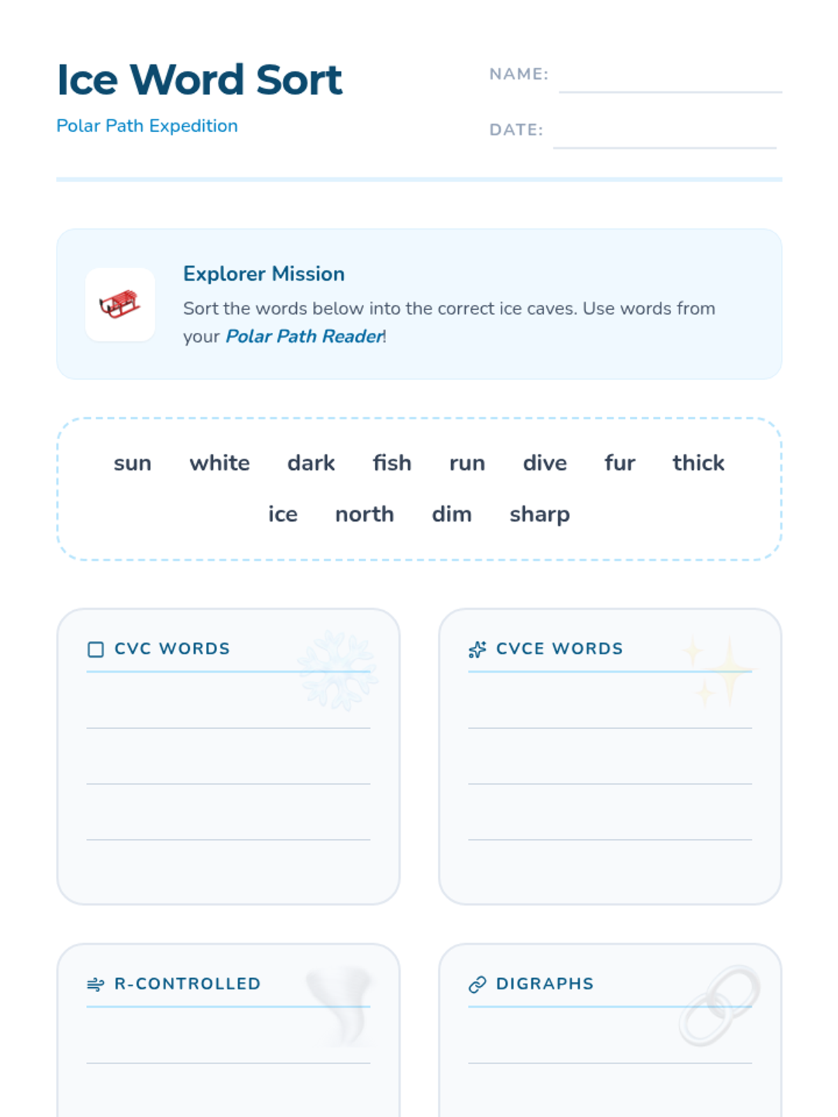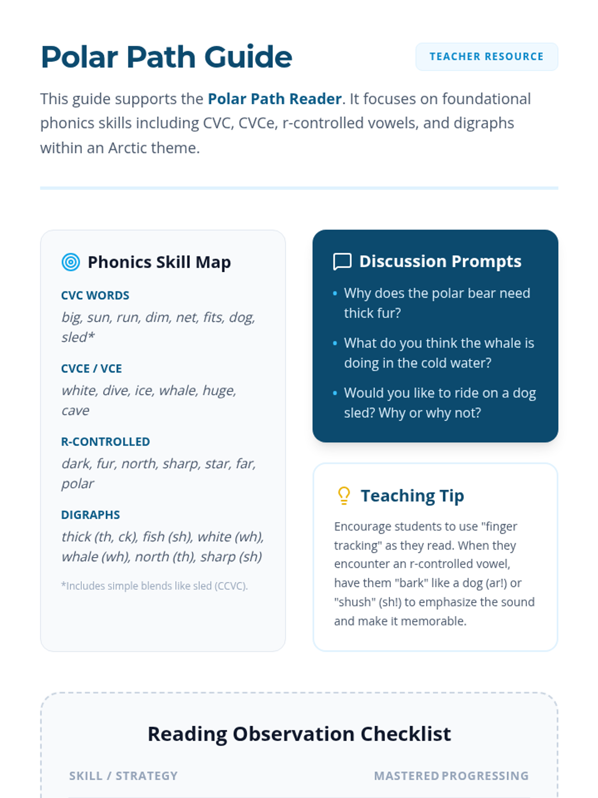 A foundational phonics lesson focused on the Arctic, using a decodable reader to practice CVC, CVCe, r-controlled vowels, and digraphs.