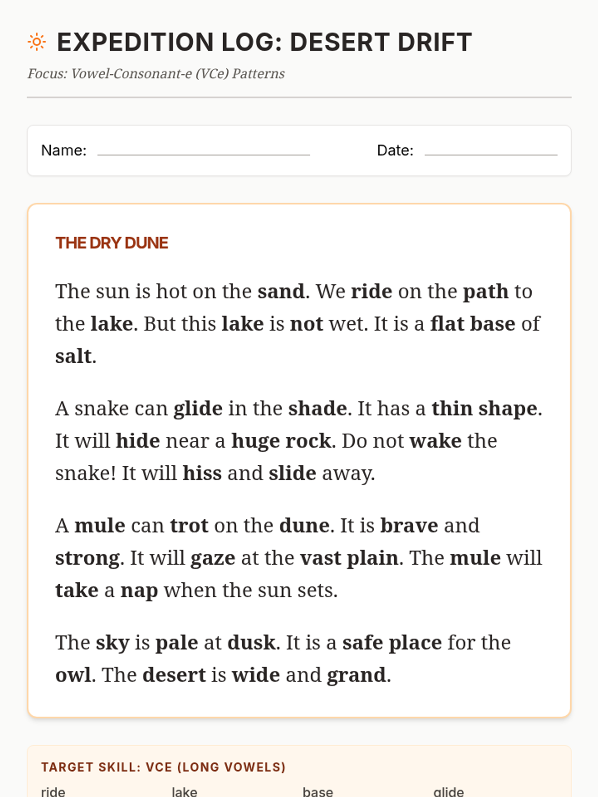 Students journey through the desert, focusing on Vowel-Consonant-e (VCe) patterns within habitat-themed texts.