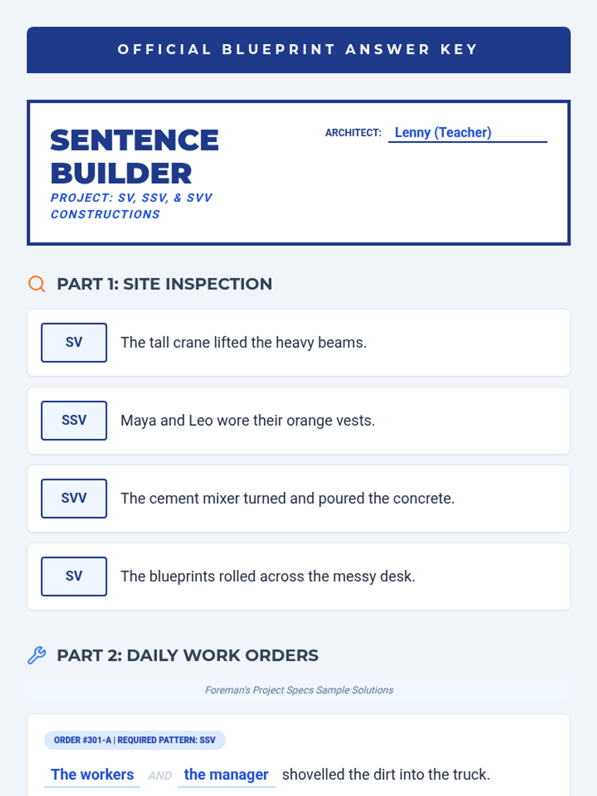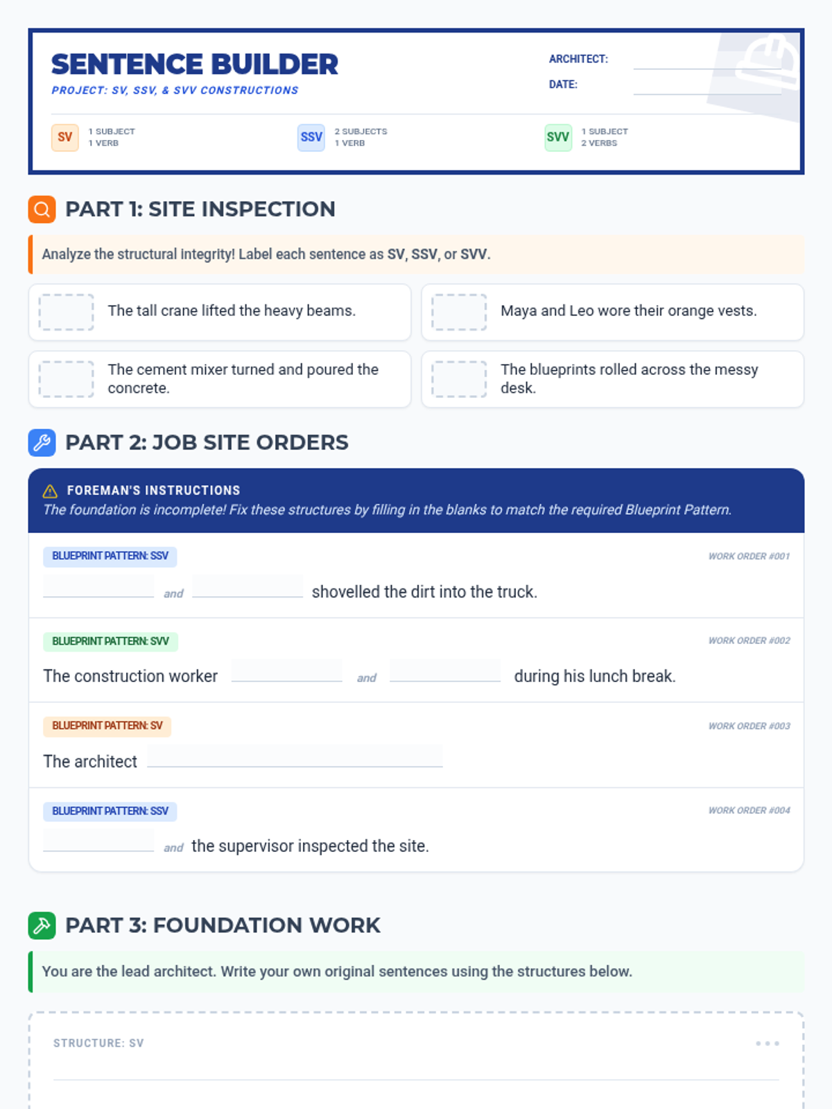 A lesson focused on mastering SV, SSV, and SVV sentence patterns through structured practice and construction-themed activities.