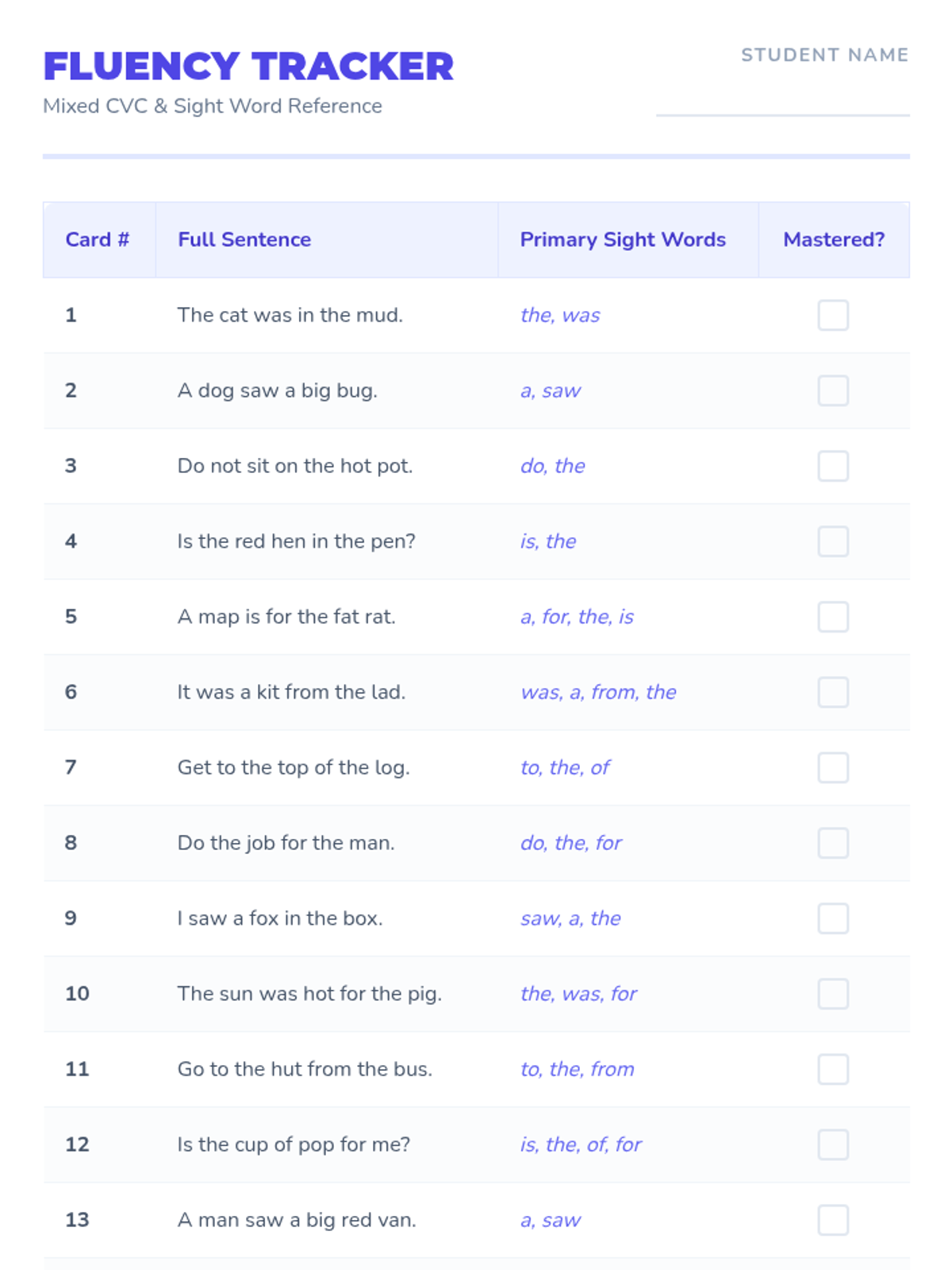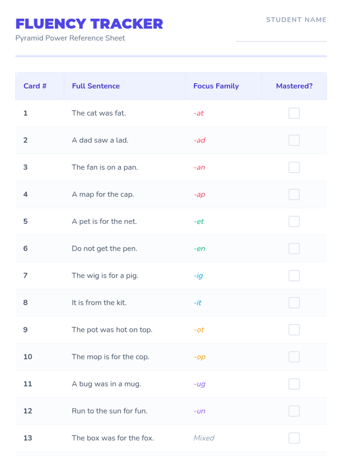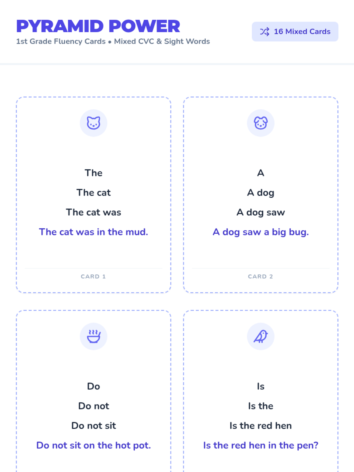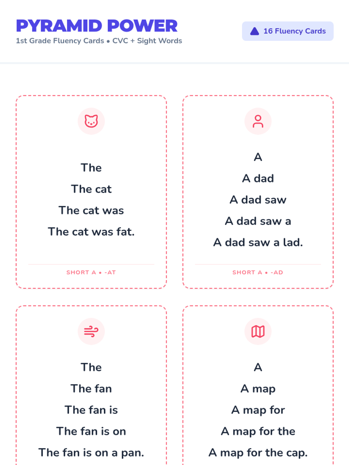 A collection of fluency triangle cards designed for 1st-grade students to build reading stamina and speed. These cards focus on CVC word families and high-frequency sight words through a progressive sentence-building approach.
