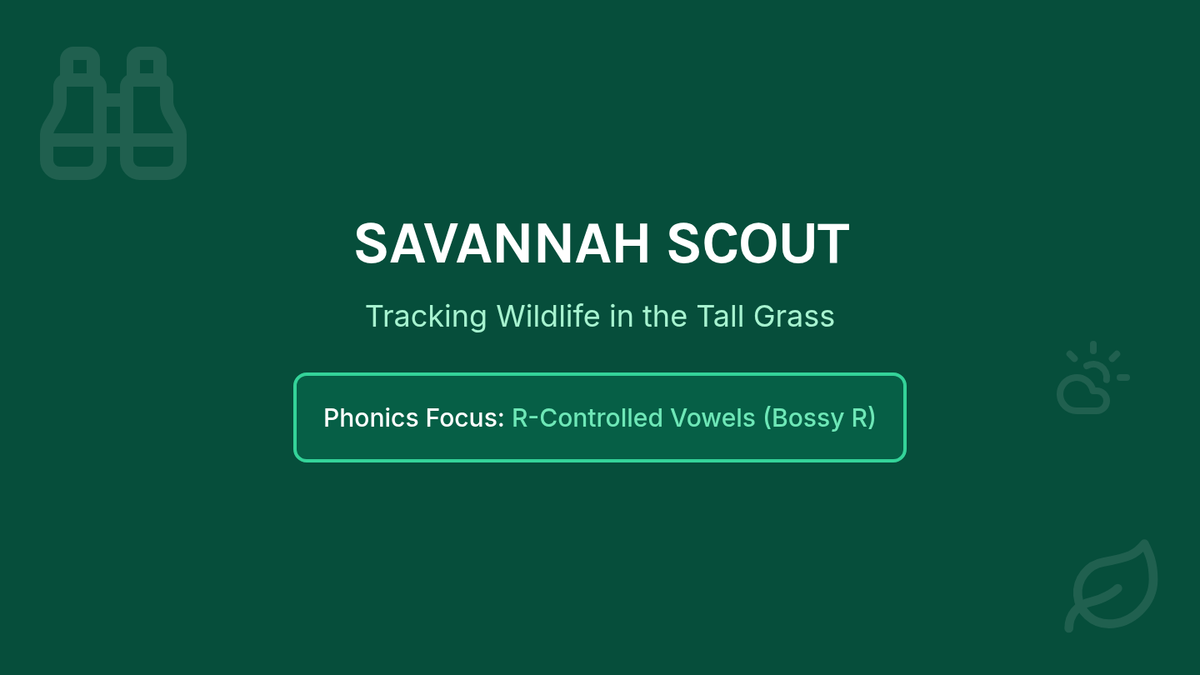 Students visit the savannah to practice decoding r-controlled vowels (ar, er, ir, or, ur) in the context of grassland wildlife.