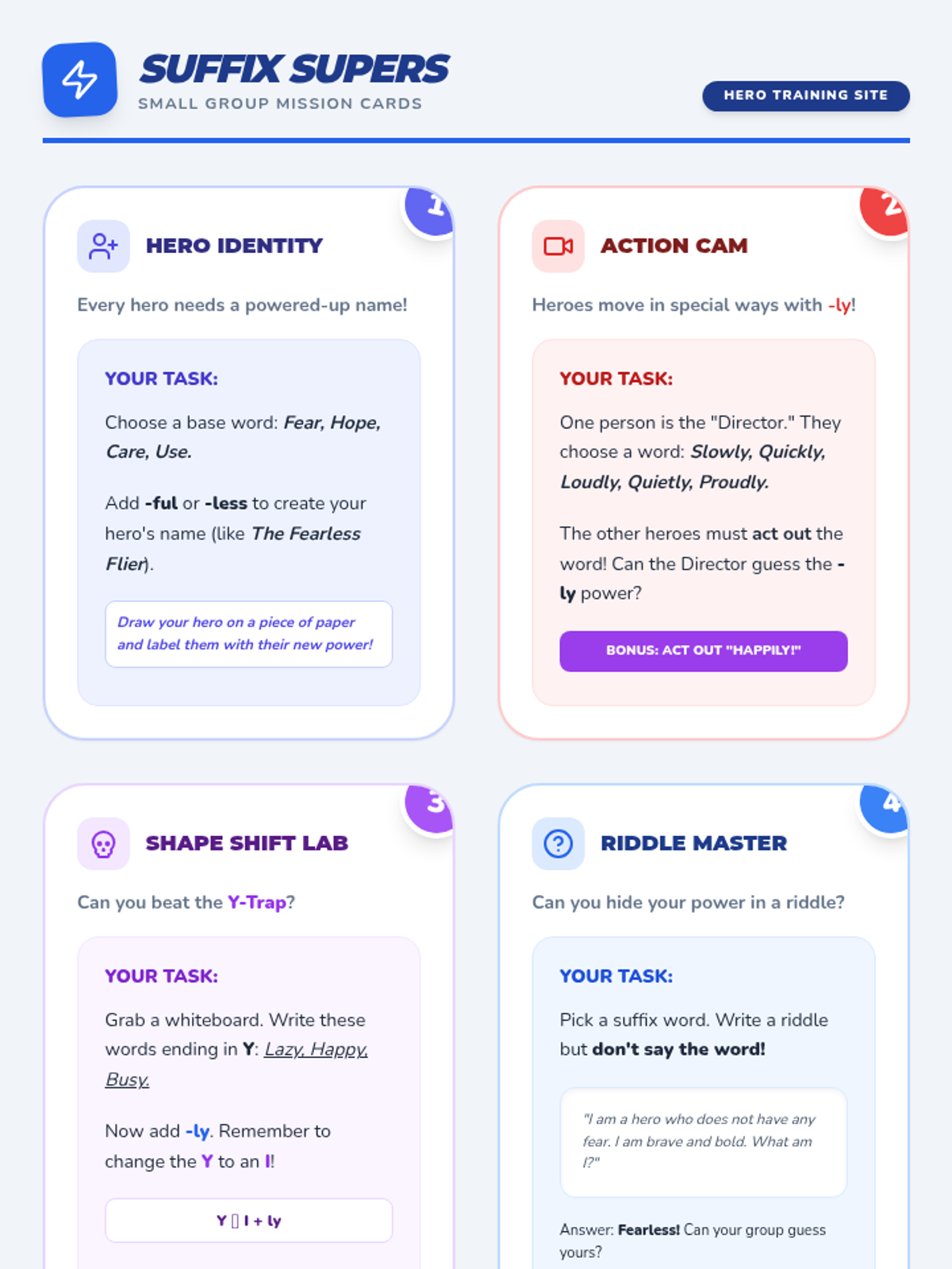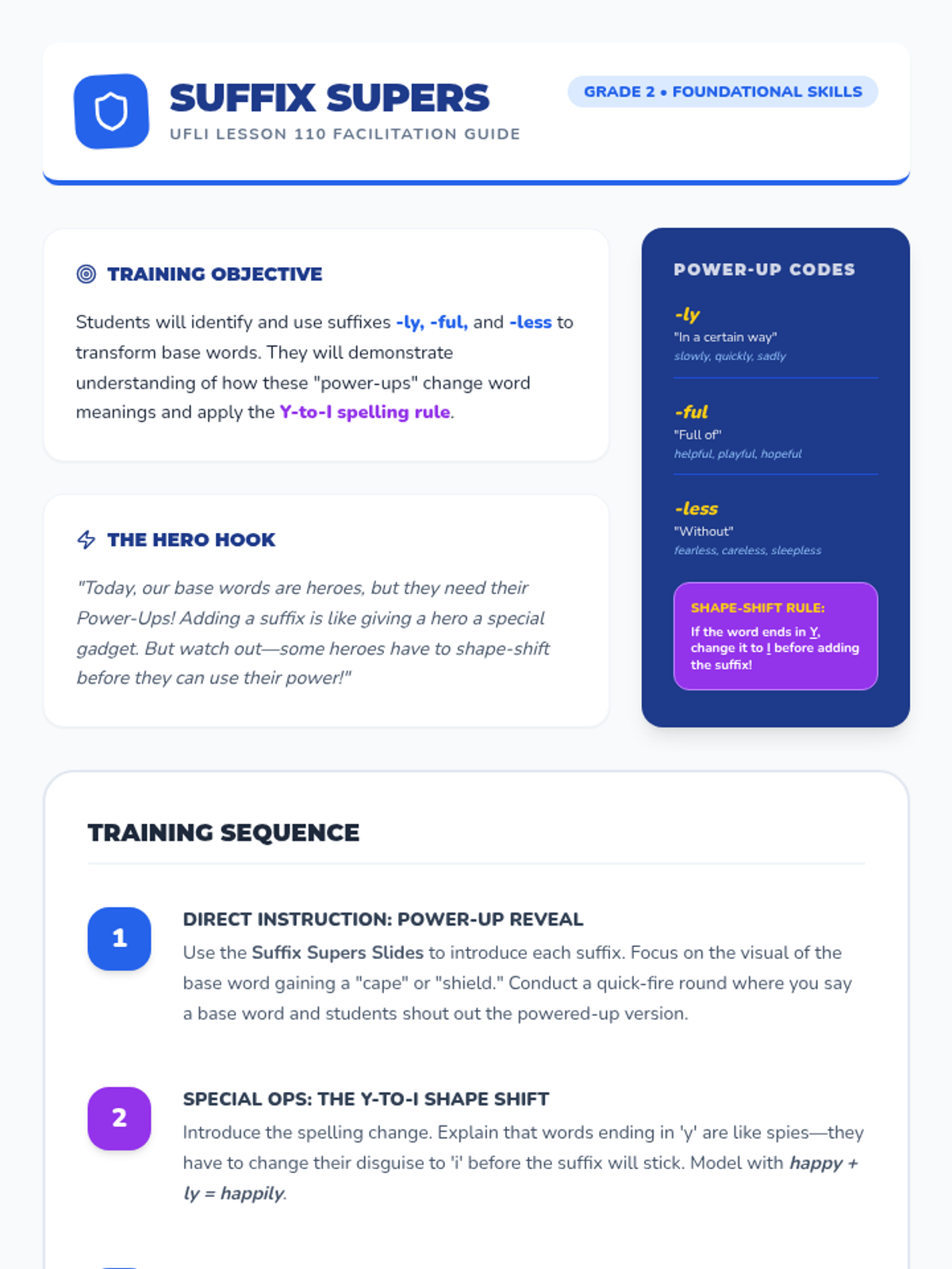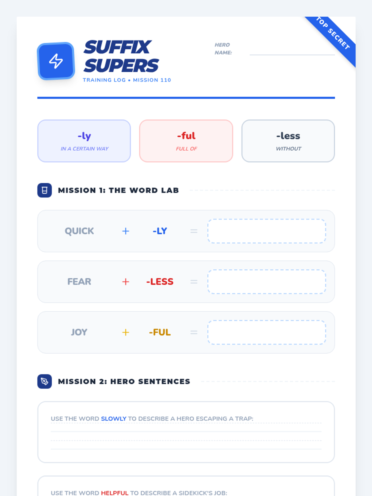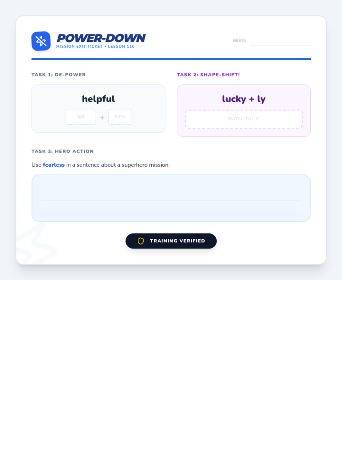In this lesson, students become 'Suffix Supers' as they master the power-ups -ly, -ful, and -less. They learn how these suffixes transform base words into descriptive powerhouses through superhero-themed activities and word building.
