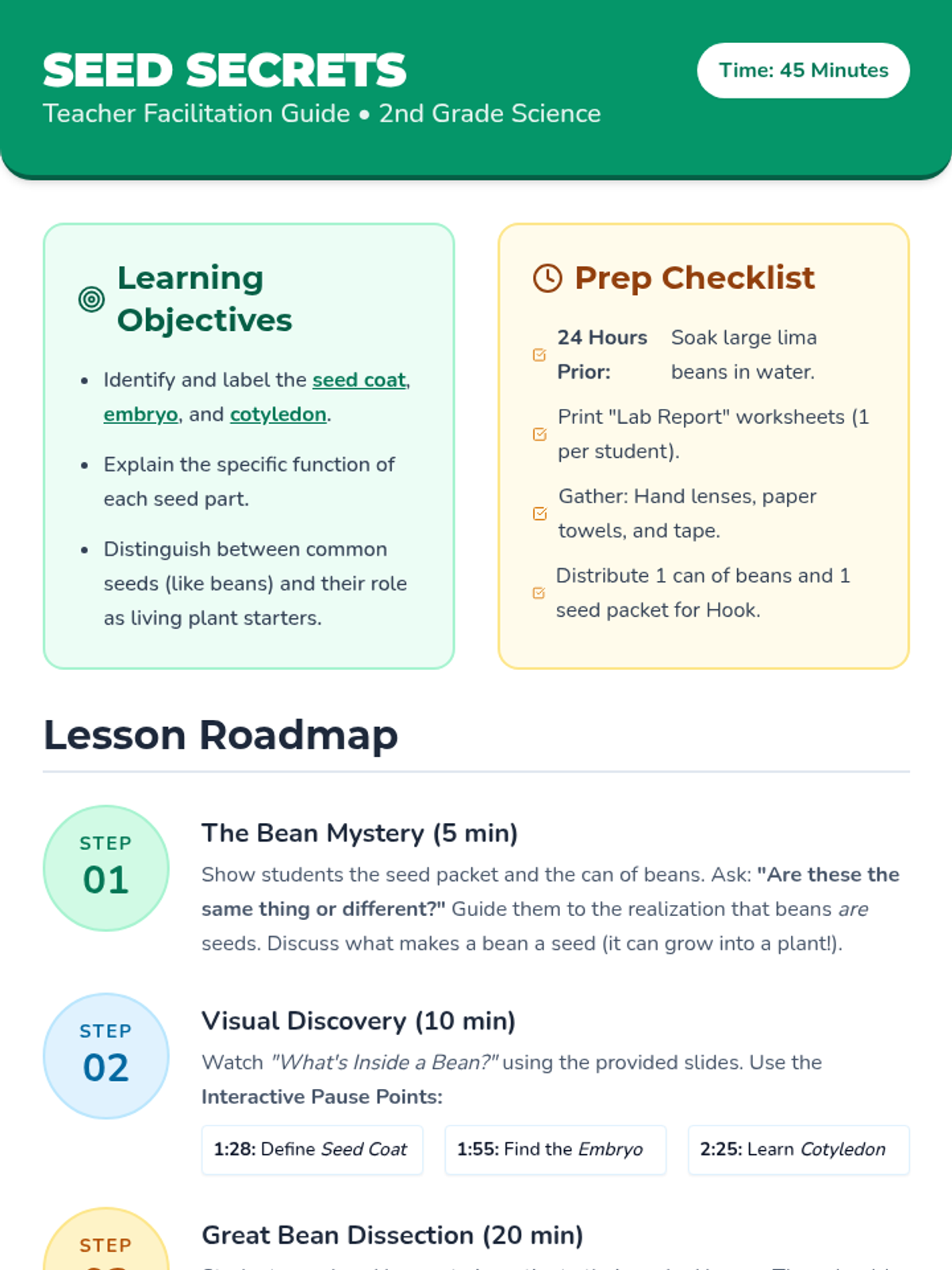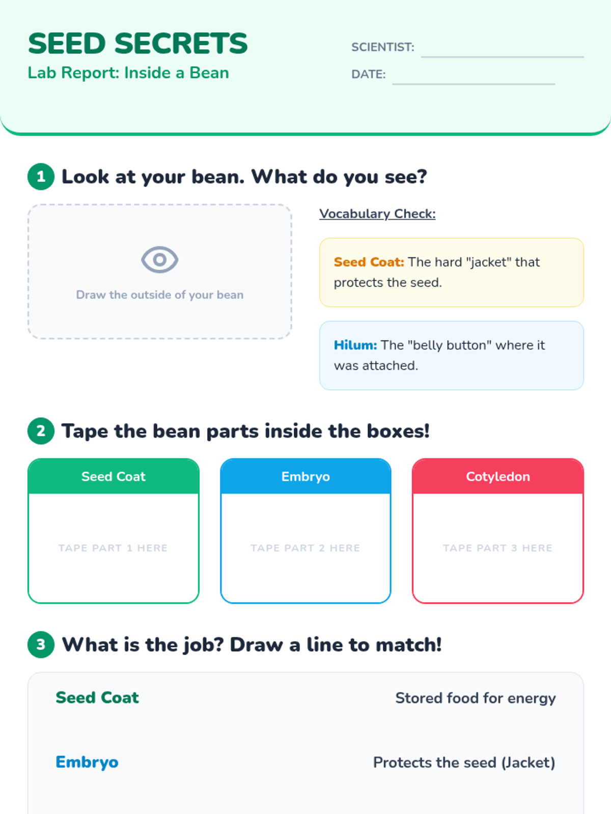 A hands-on investigation where 2nd-grade students dissect soaked lima beans to discover and label the seed coat, embryo, and cotyledon while learning their functions.