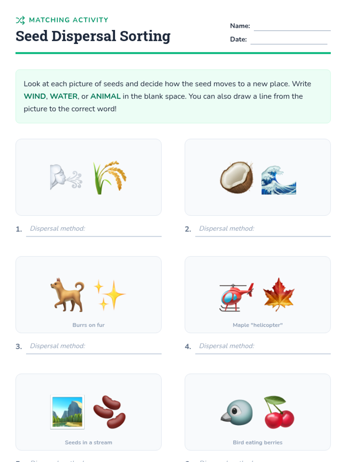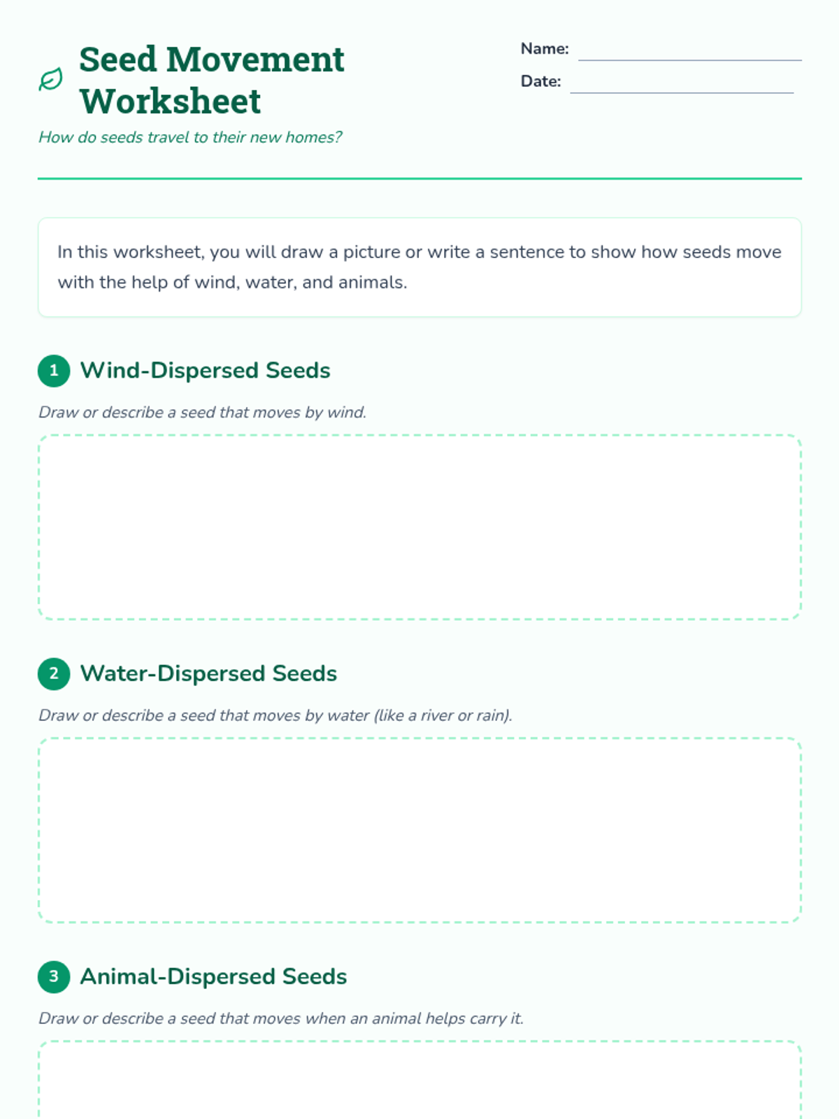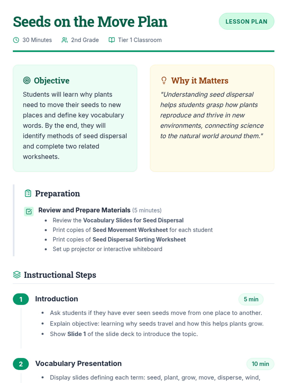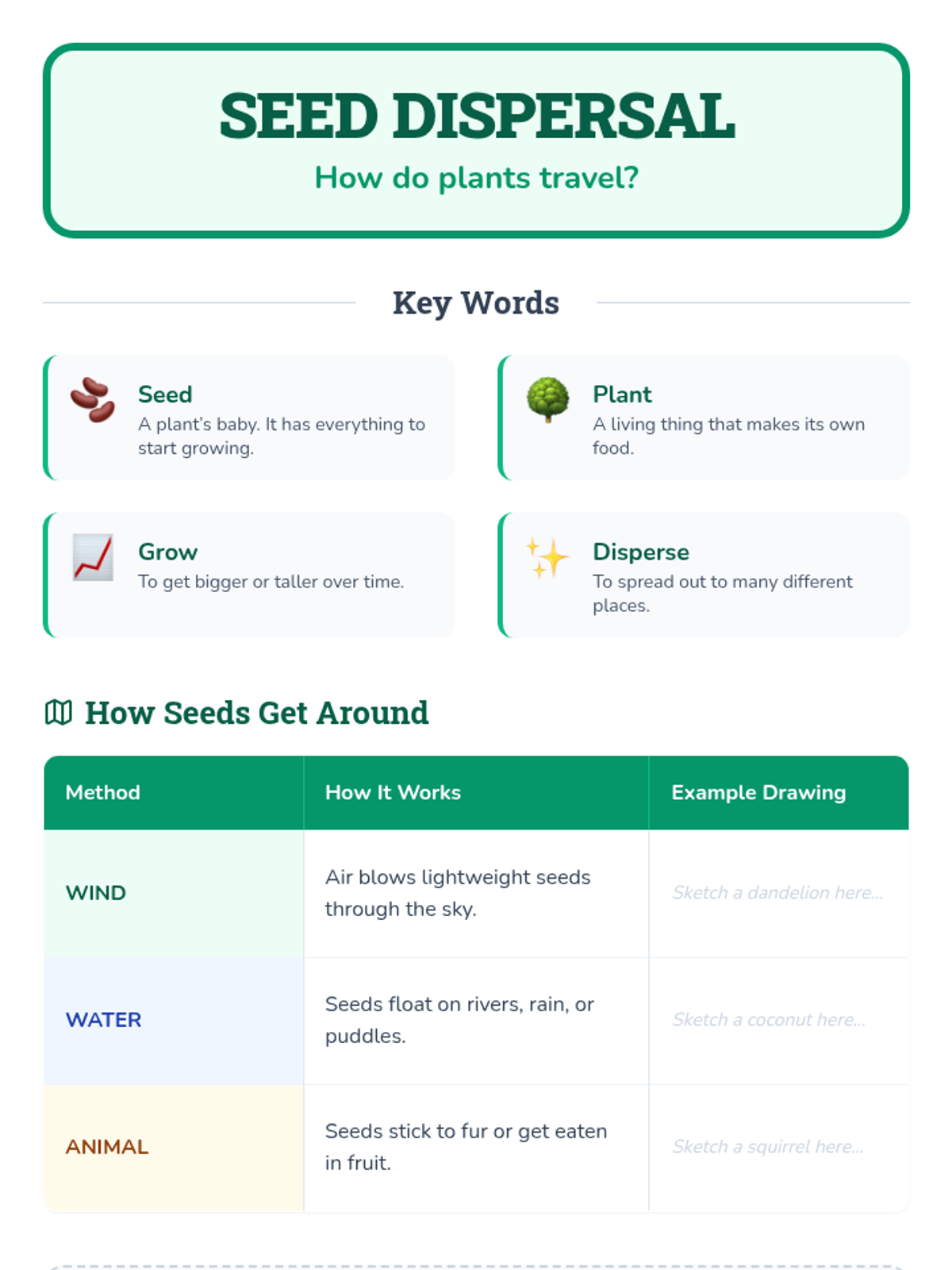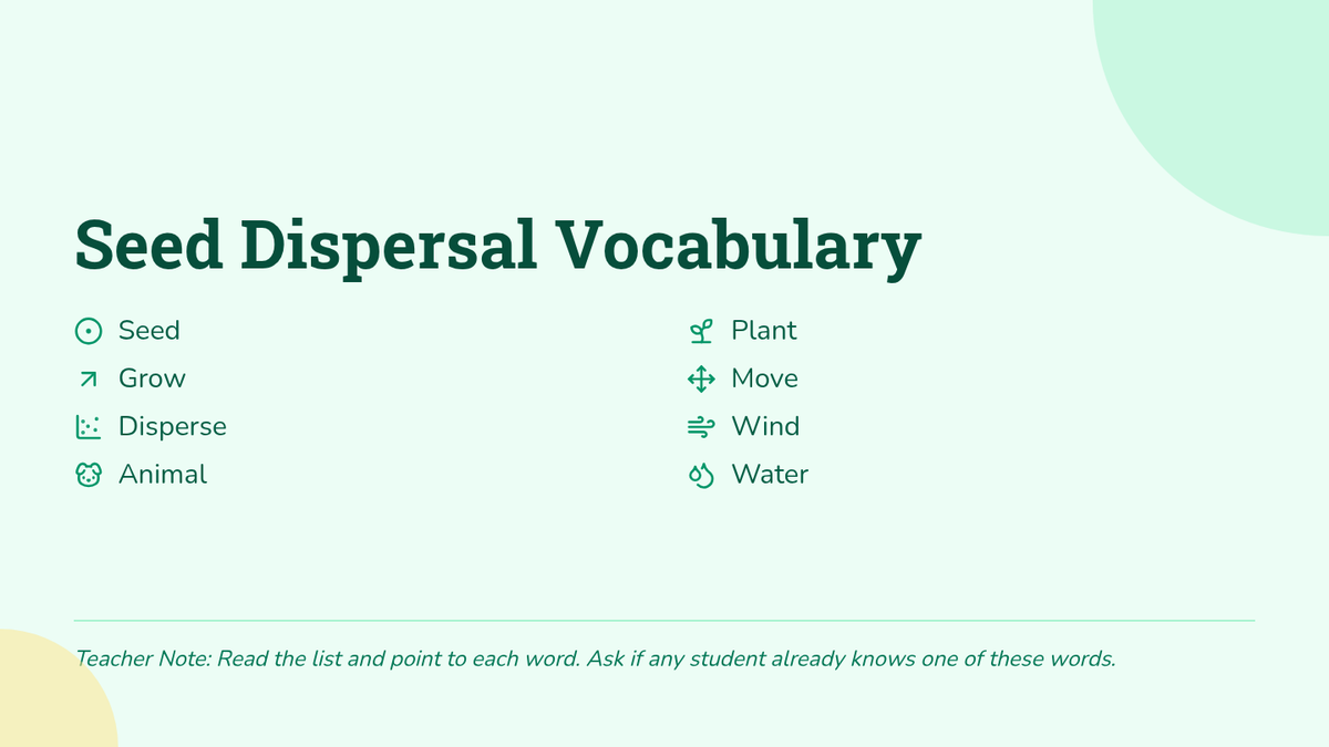 A 30-minute lesson for 2nd graders exploring seed dispersal. Students learn key vocabulary and identify how wind, water, and animals help plants move their seeds to new locations.