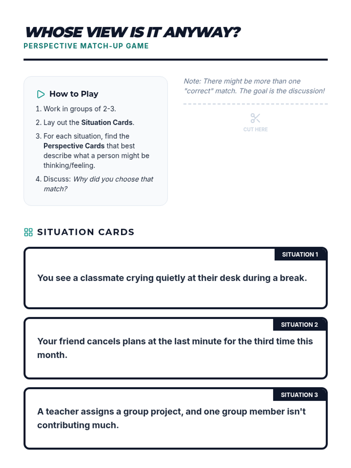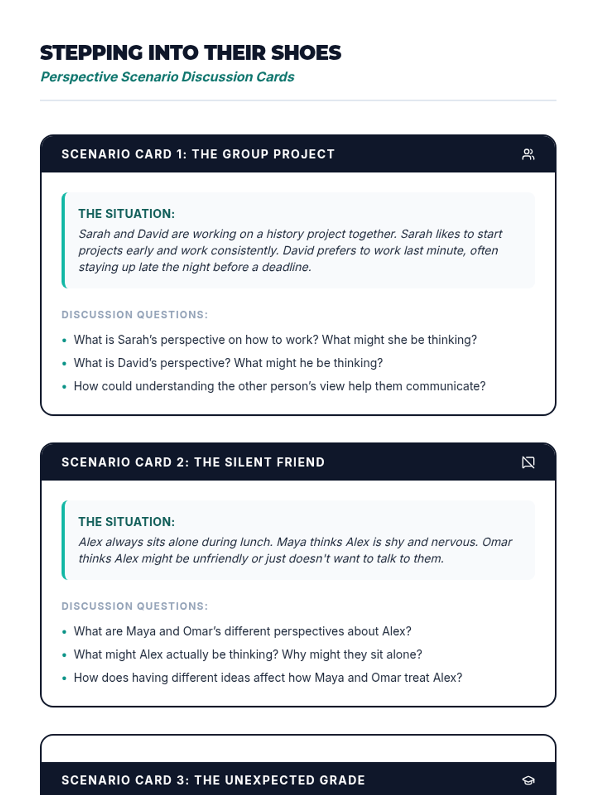 A 30-minute counseling session for 11th-grade students on the spectrum to develop perspective-taking skills through interactive games and scenario analysis.