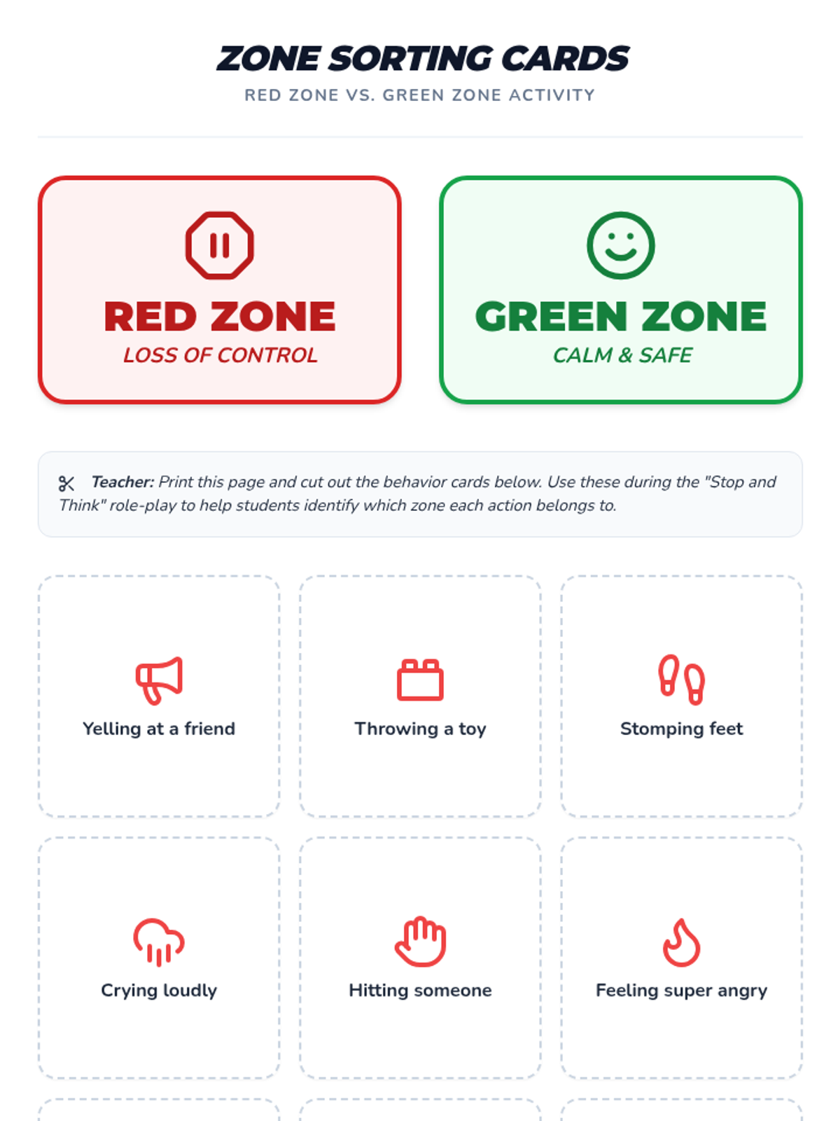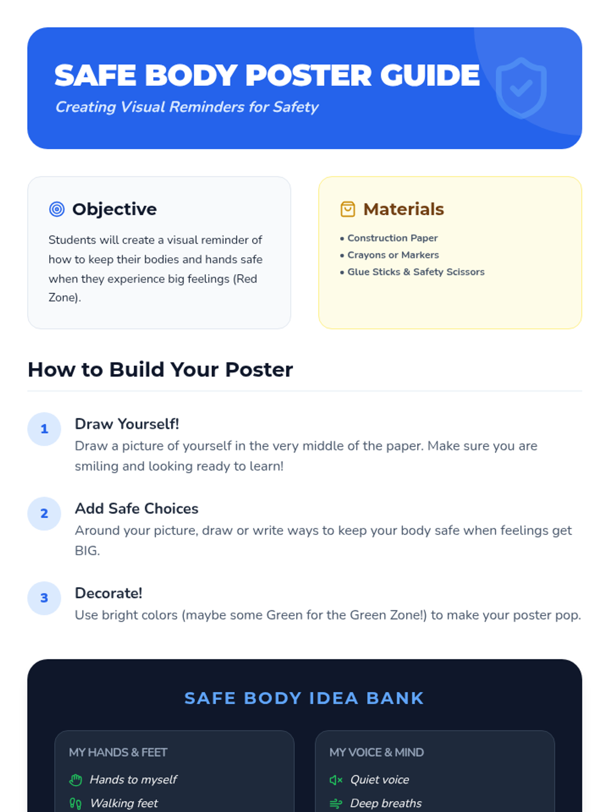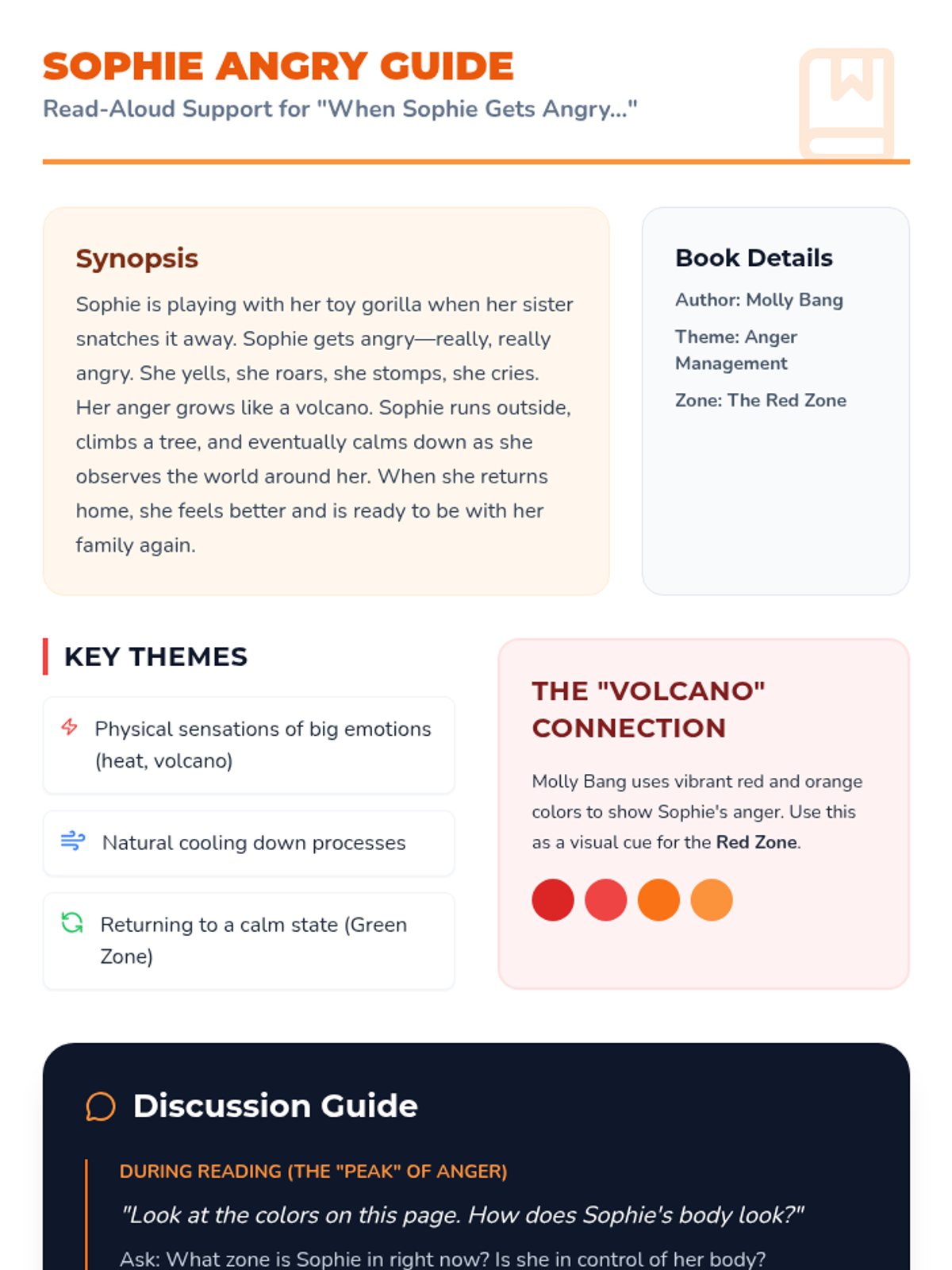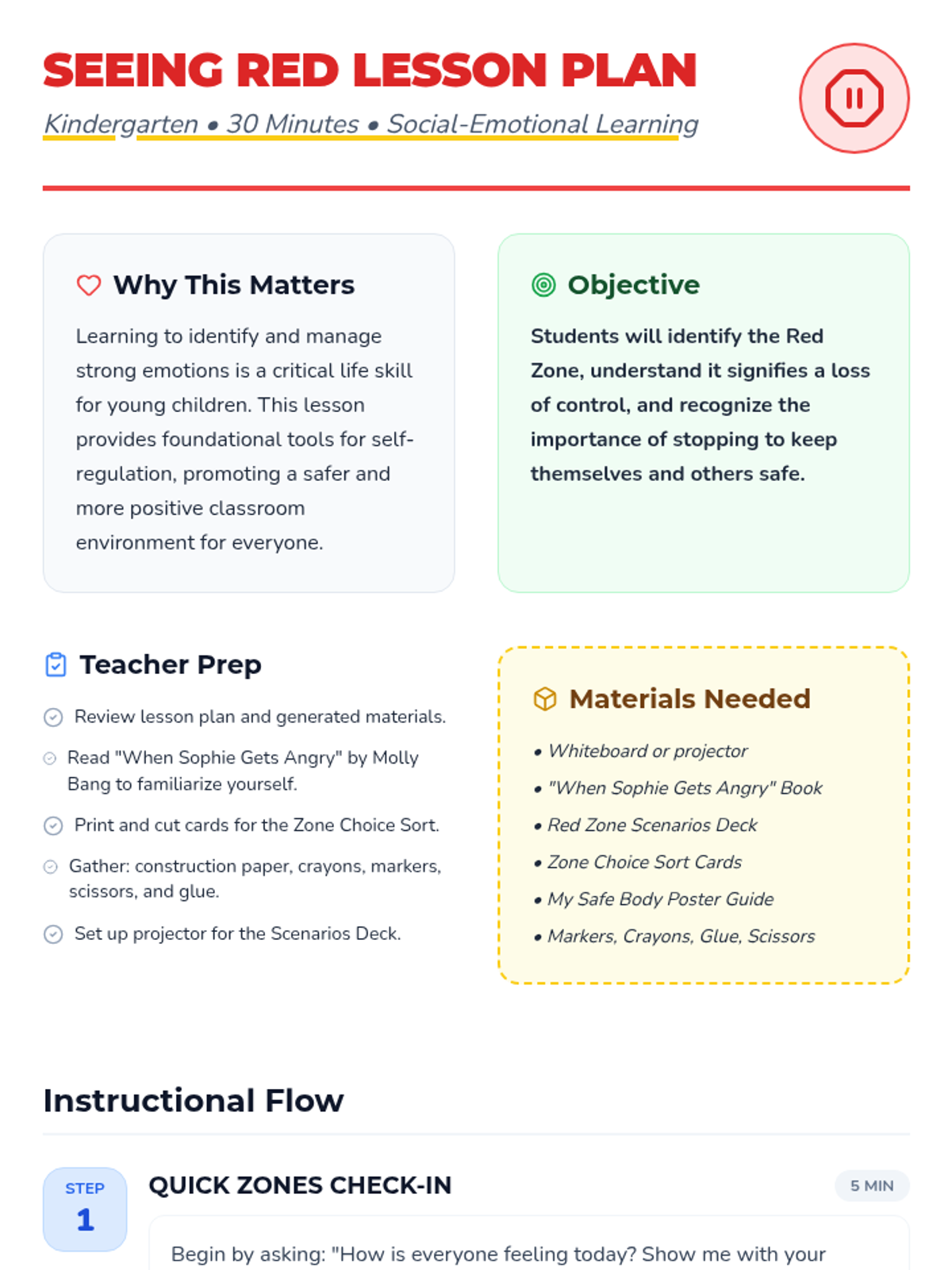 A Kindergarten lesson focused on identifying the 'Red Zone' of big emotions and learning to 'Stop' to maintain safety and control. Students explore these concepts through the story 'When Sophie Gets Angry', role-play, and a creative poster craft.