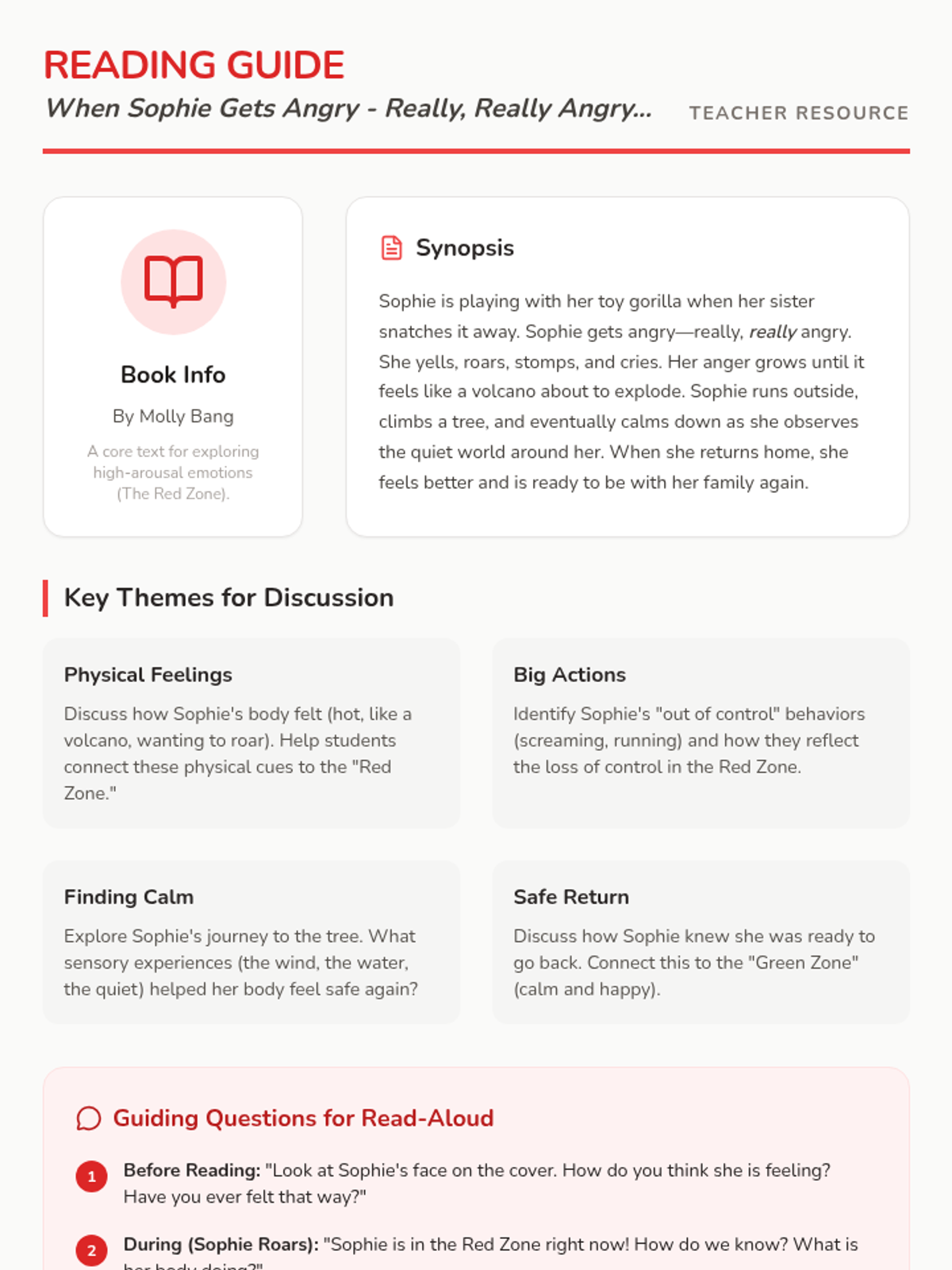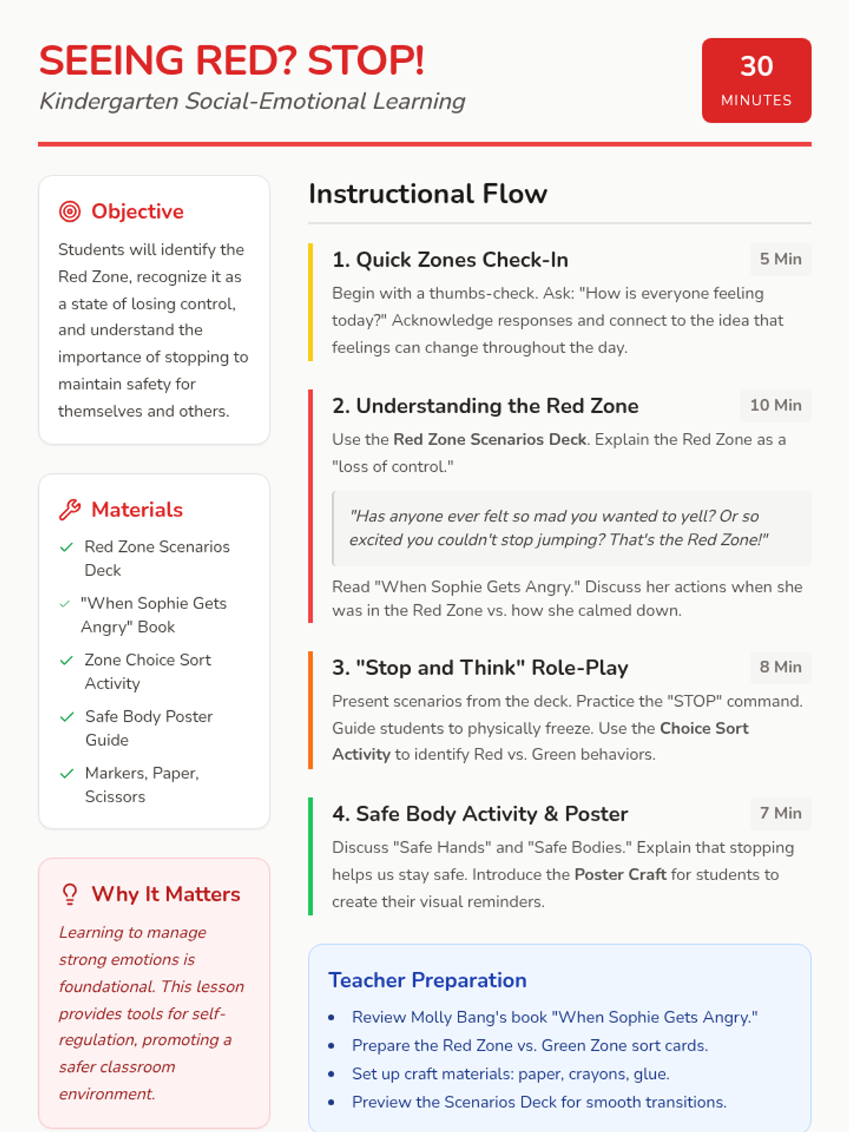 A Kindergarten social-emotional learning lesson focused on identifying the 'Red Zone' of high-arousal emotions and learning to stop and regain control to keep bodies safe.