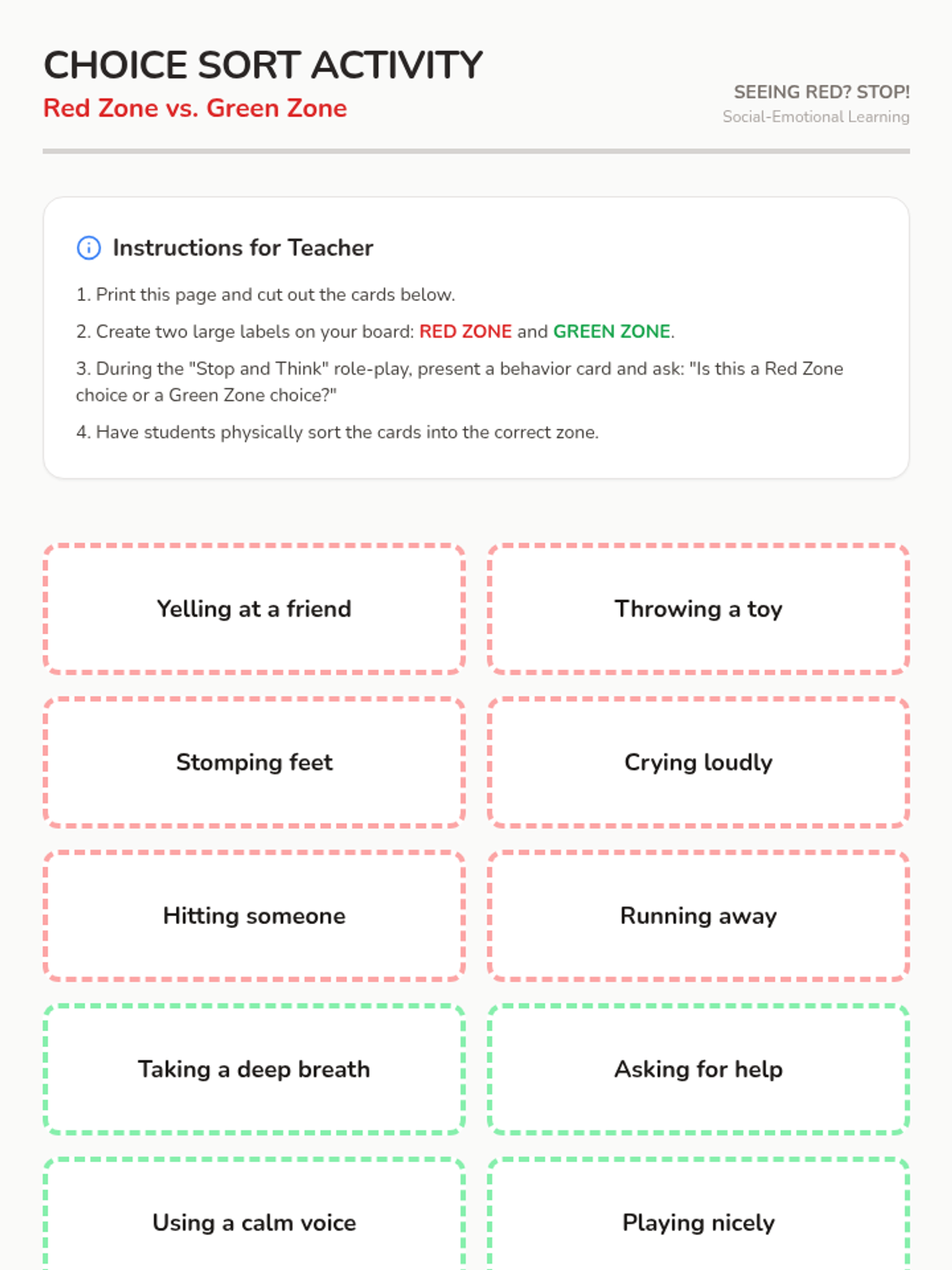 A foundational social-emotional learning lesson for kindergarteners to identify and categorize feelings using the four color zones. Students will explore scenarios, match emotions, and practice physical sorting of feelings.