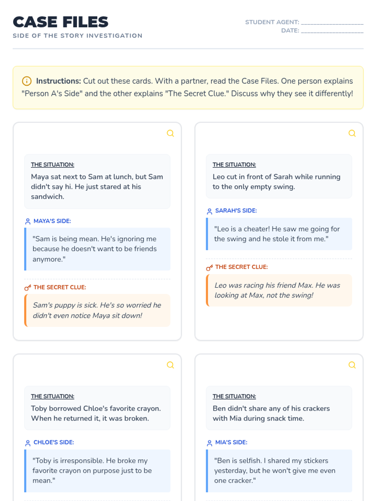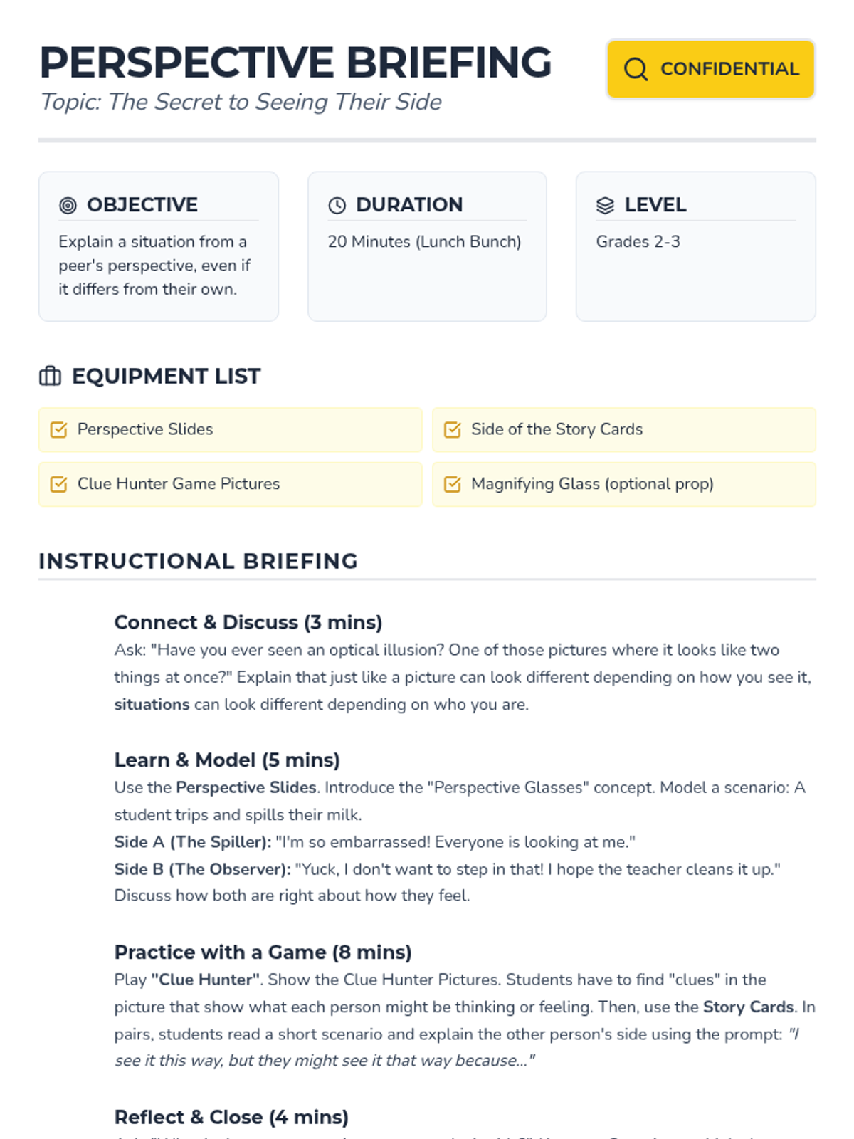 A 20-minute social-emotional learning lesson for grades 2-3 focused on perspective-taking and empathy through a detective-themed investigation of different viewpoints.
